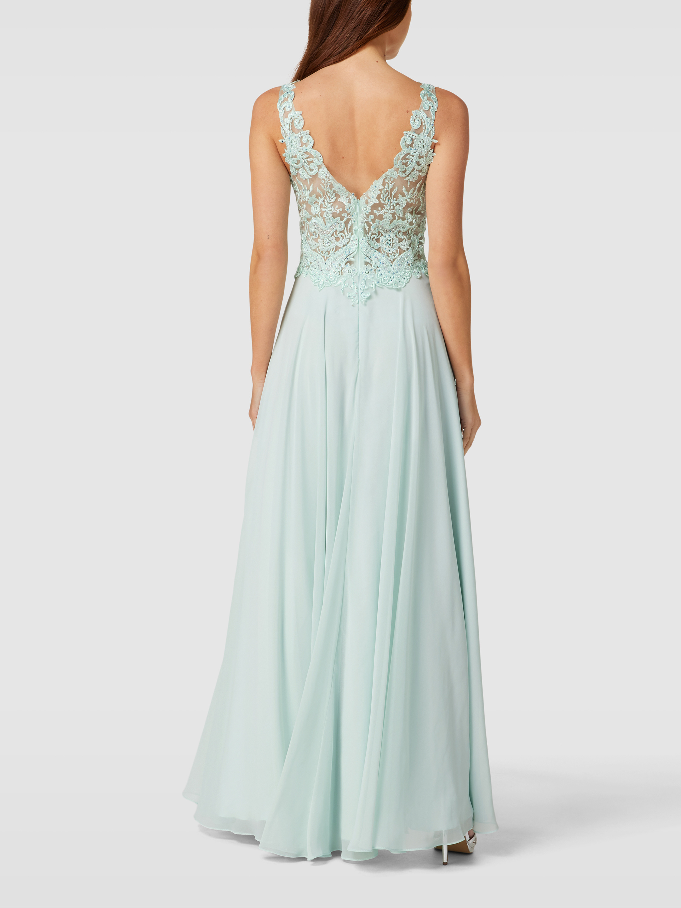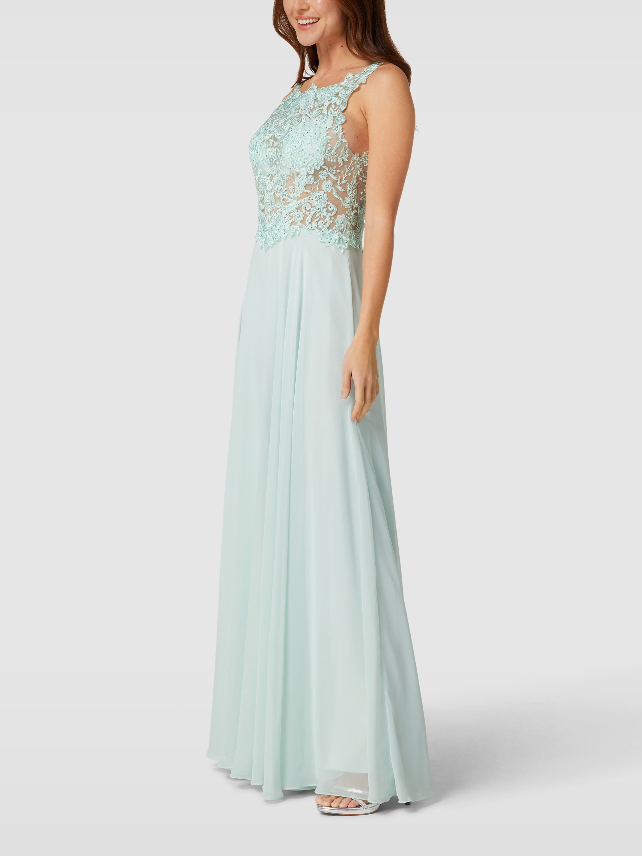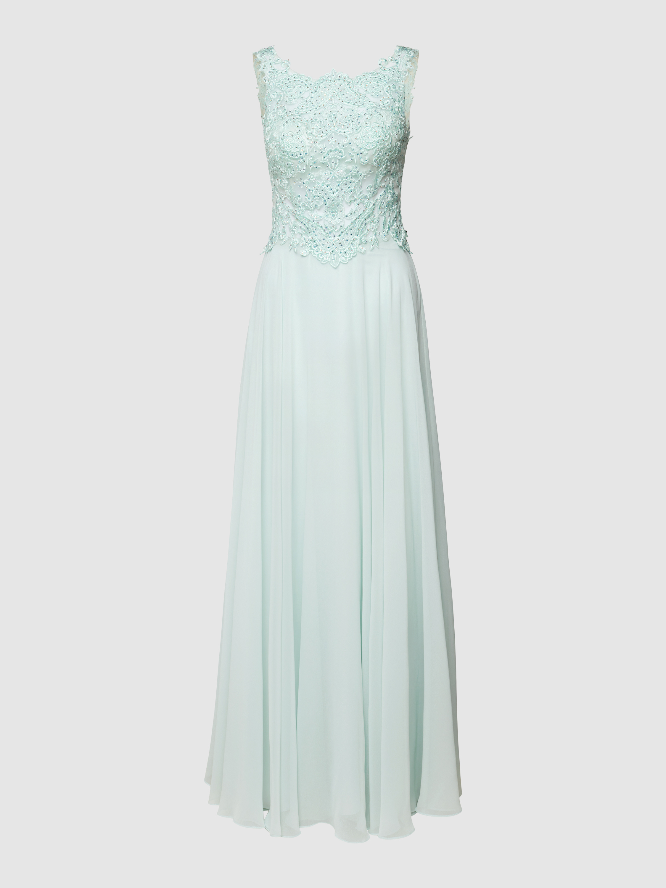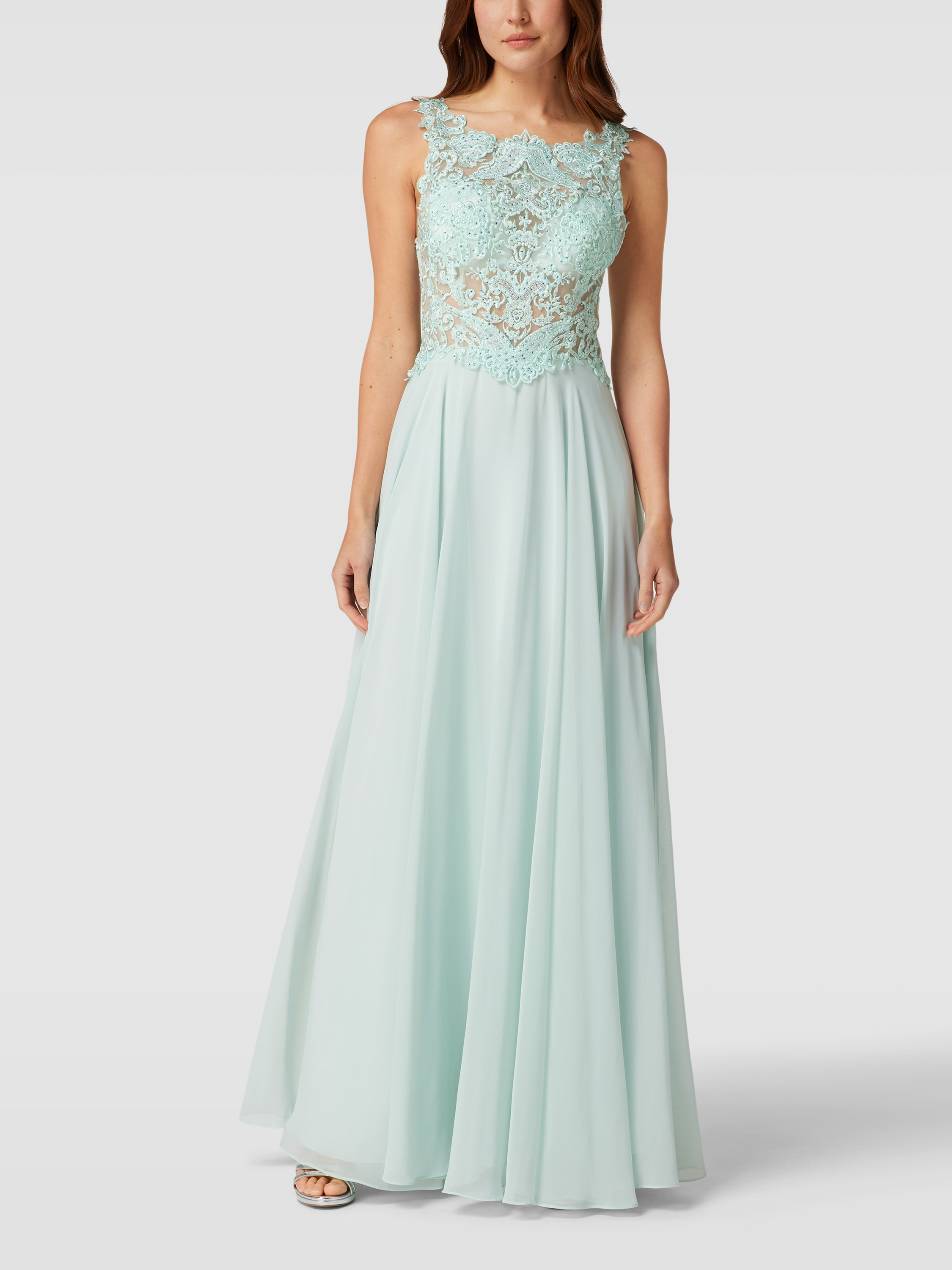 Das Abendkleid von Mascara ist aus strapazierfähigem Material gefertigt und tailliert geschnitten. Es kommt mit U-Boot-Ausschnitt, breiten Trägern und floralen Stickereien sowie Zierperlenbesatz.