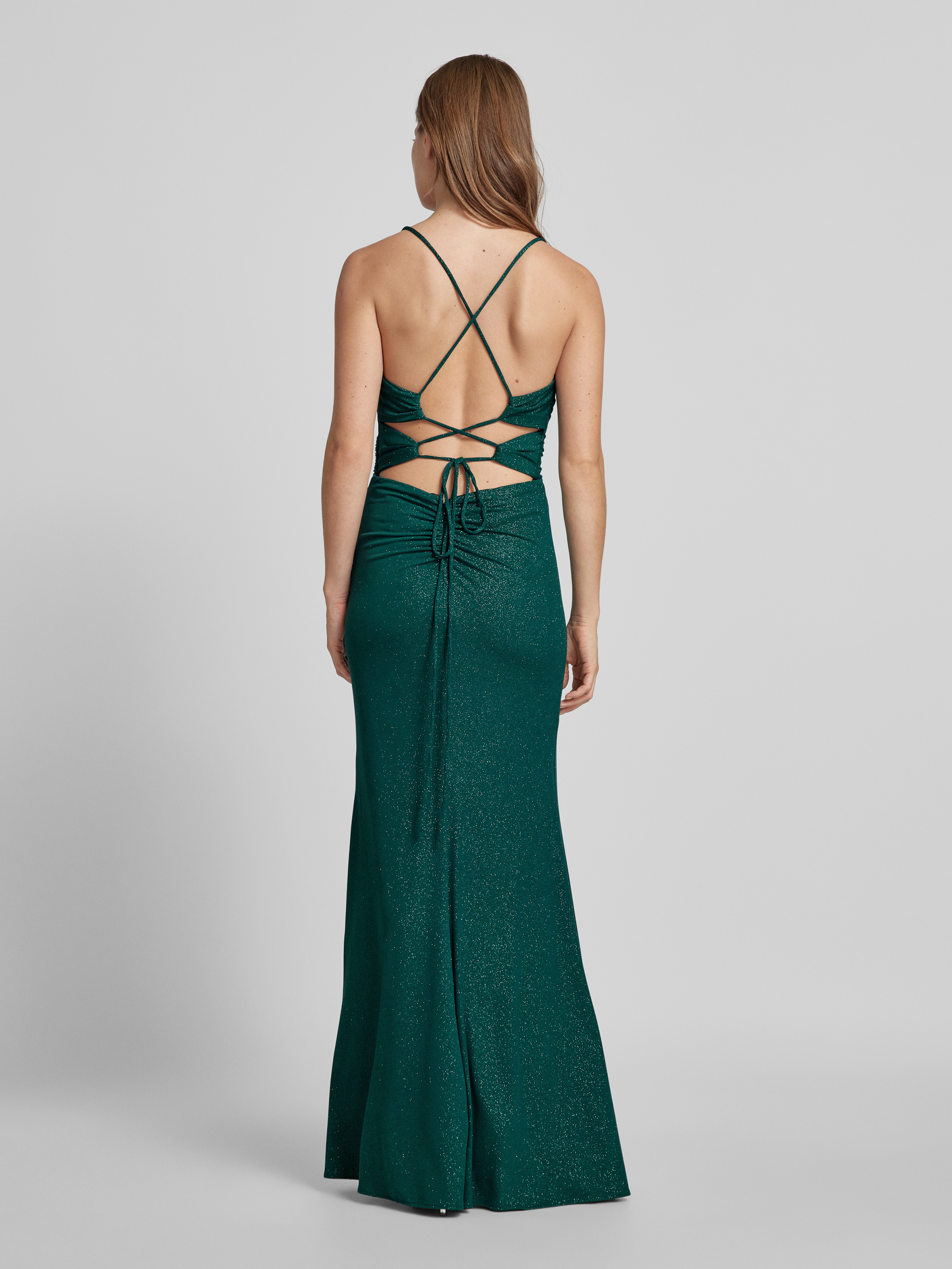 Das elegante Abendkleid von Mascara vereint einen leicht ausgestellten Schnitt mit einer Wickel-Optik, die durch Spaghettiträger und einen V-Ausschnitt ergänzt wird. Die Maxilänge und der Gehschlitz verleihen Bewegungsfreiheit, während die fließende Silhouette für eine feminine Ausstrahlung sorgt.