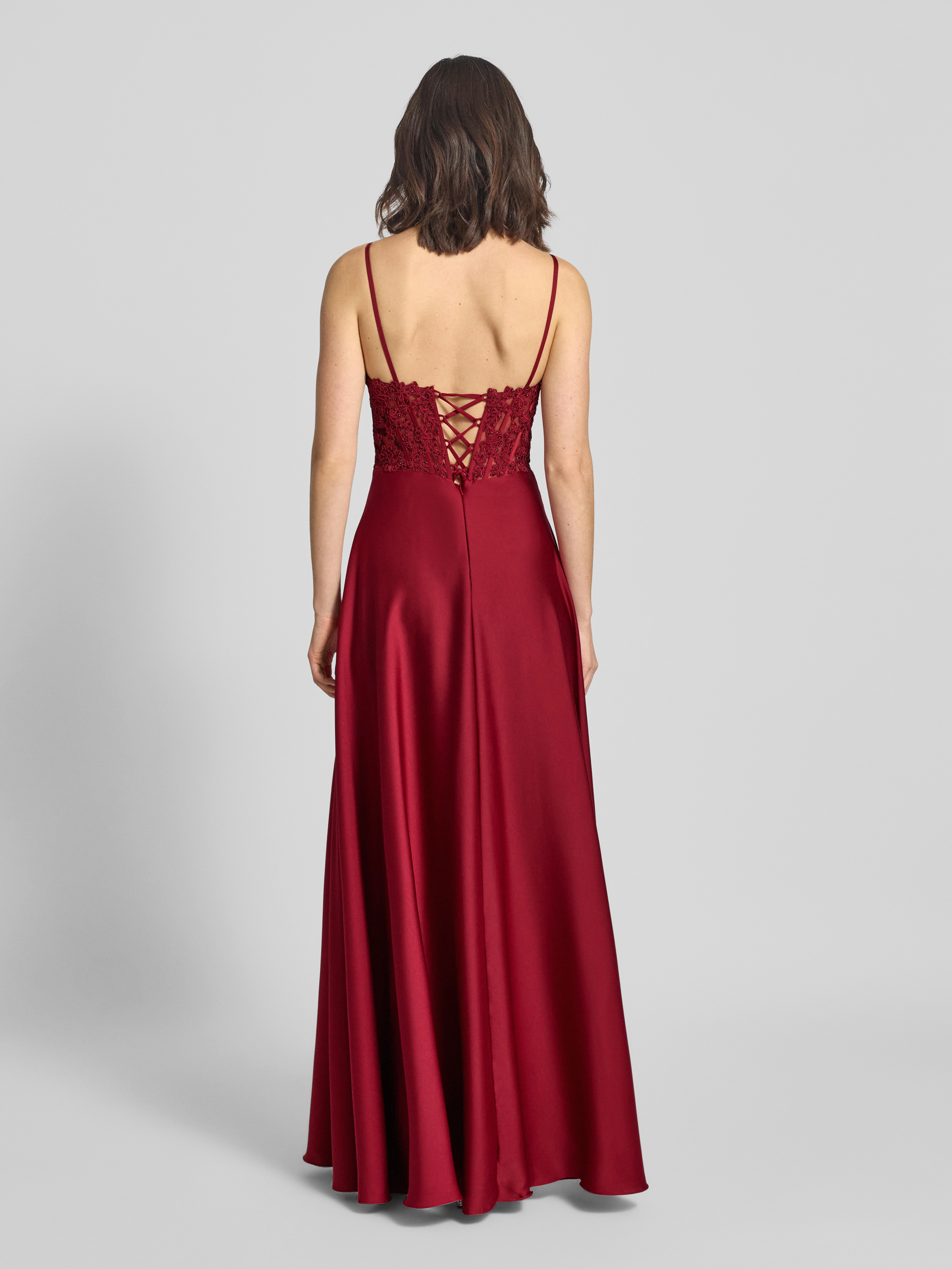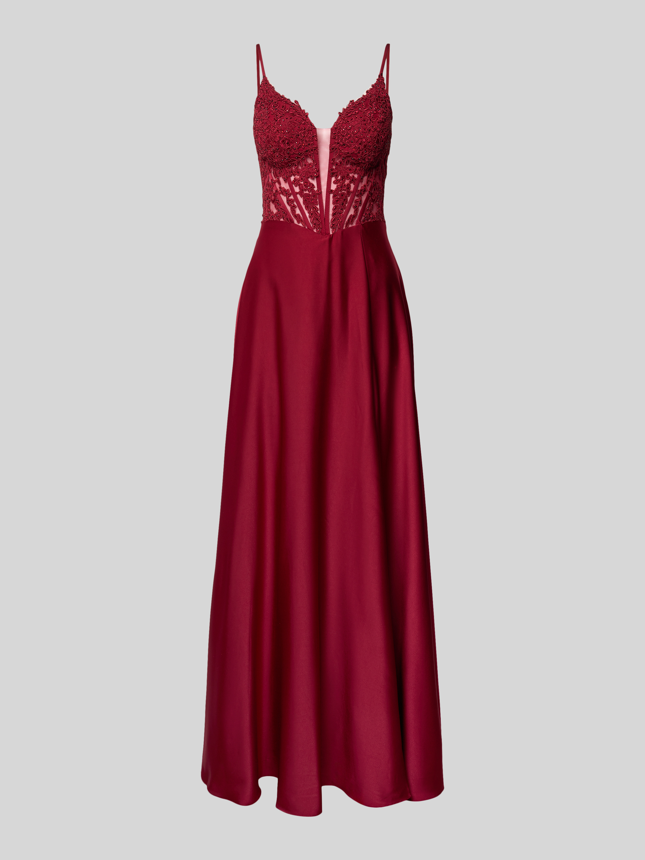 Das Abendkleid von Mascara fällt durch den Herz-Ausschnitt und den feinen Zierbesatz ins Auge, während der taillierte Schnitt eine feminine Silhouette betont. Durch die angenehme Passform kann man sich auch an langen Abenden frei bewegen. Dezente Details runden das Gesamtbild geschmackvoll ab.