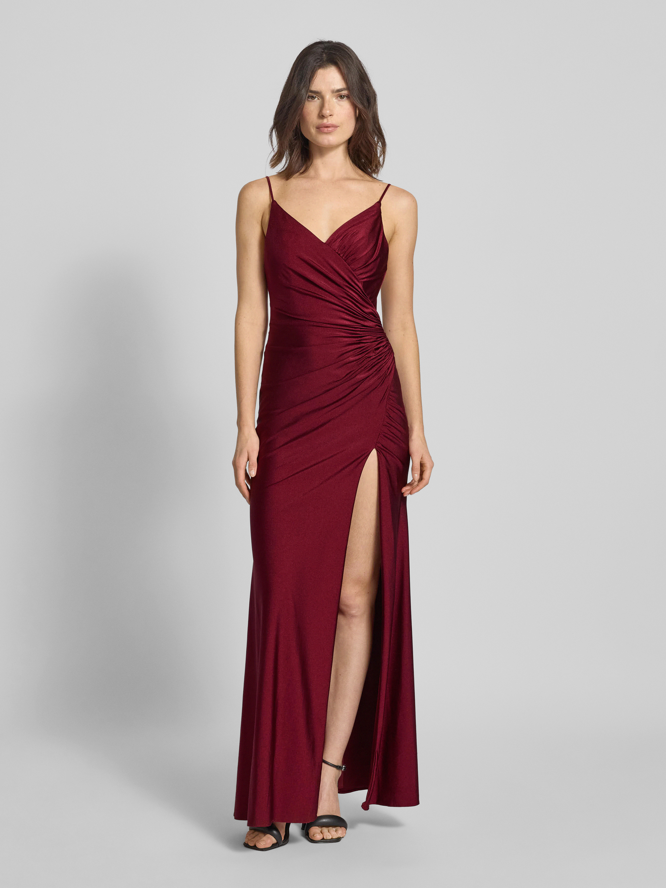 Das Abendkleid von Mascara zeigt sich mit tailliertem Schnitt und schmeichelnden Raffungen, wodurch die Silhouette dezent betont wird. Durch die Wickel-Optik und den tiefen V-Ausschnitt entsteht ein eleganter, aber dennoch zurückhaltender Look, der Bewegungsfreiheit lässt. Ein blickdichtes Unterkleid sorgt dabei für angenehmen Tragekomfort bei festlichen Anlässen.