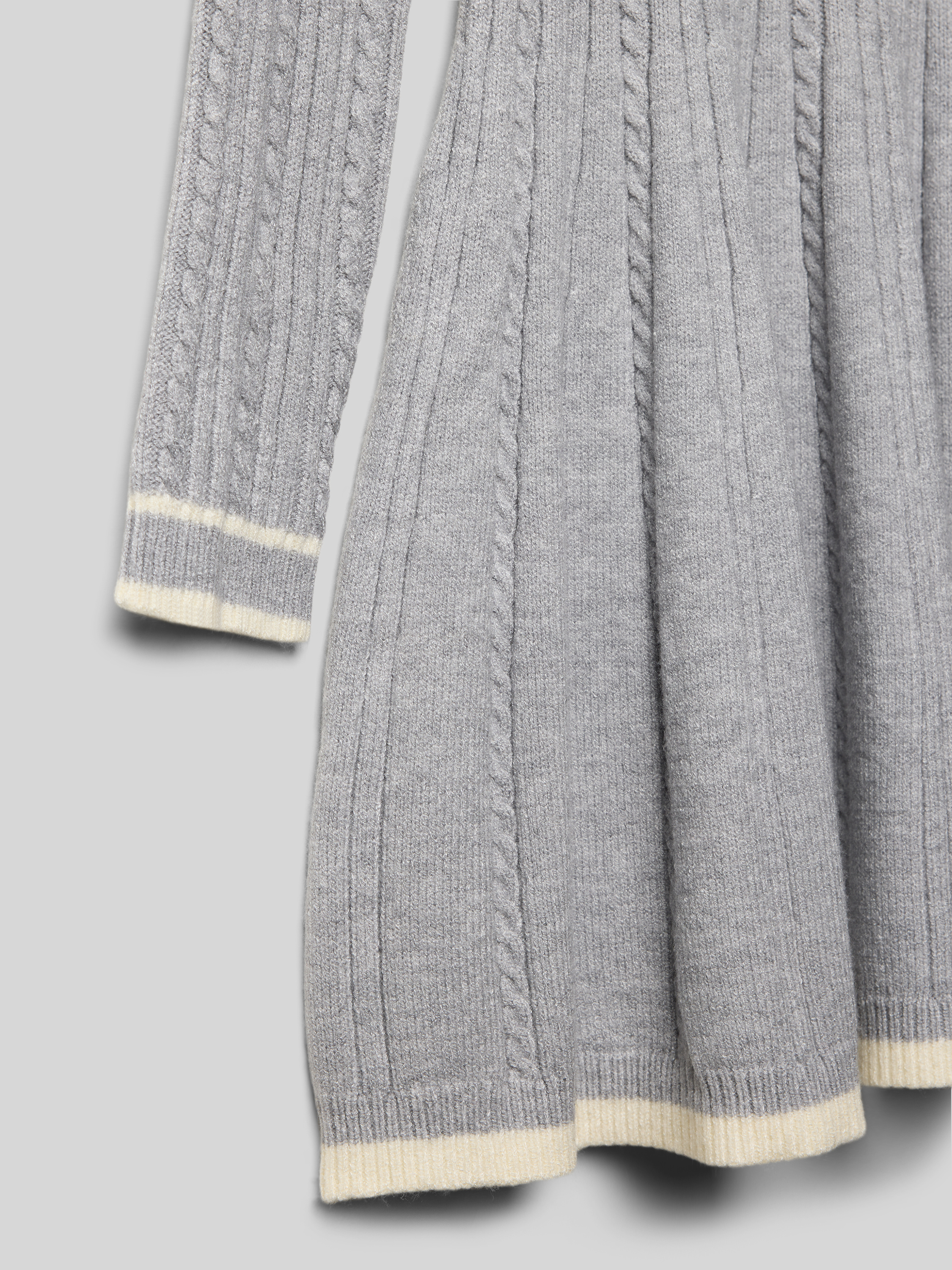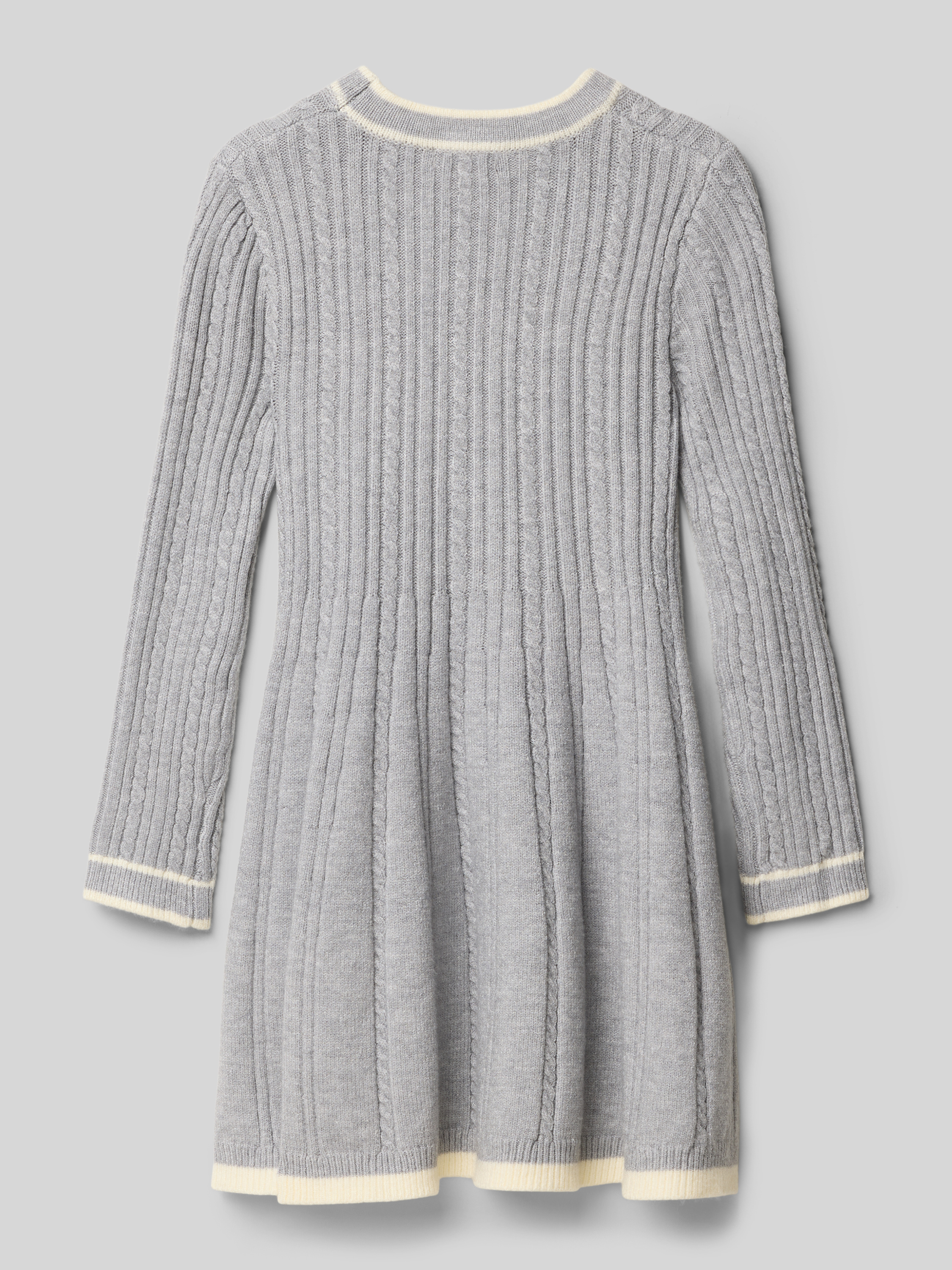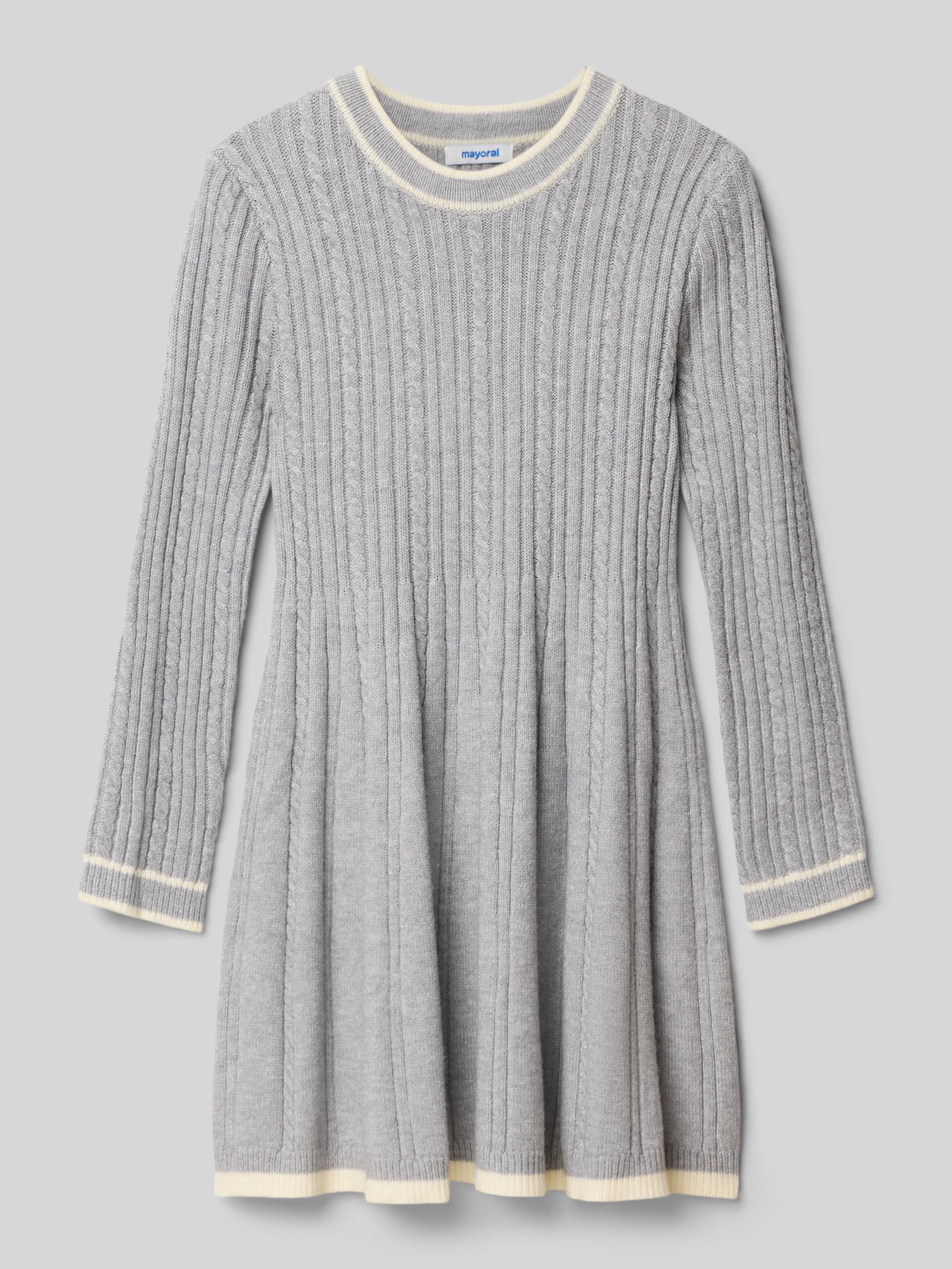 Das Kinderkleid von Mayoral zeigt sich in einem leicht ausgestellten Schnitt und legt sich dadurch angenehm um den Körper. Der Viskose-Mix sorgt für ein weiches Tragegefühl, während das markante Zopfmuster dem Kleid mit Zopfmuster eine besondere Note verleiht. Ein klassischer Rundhalsausschnitt rundet das Design ab.