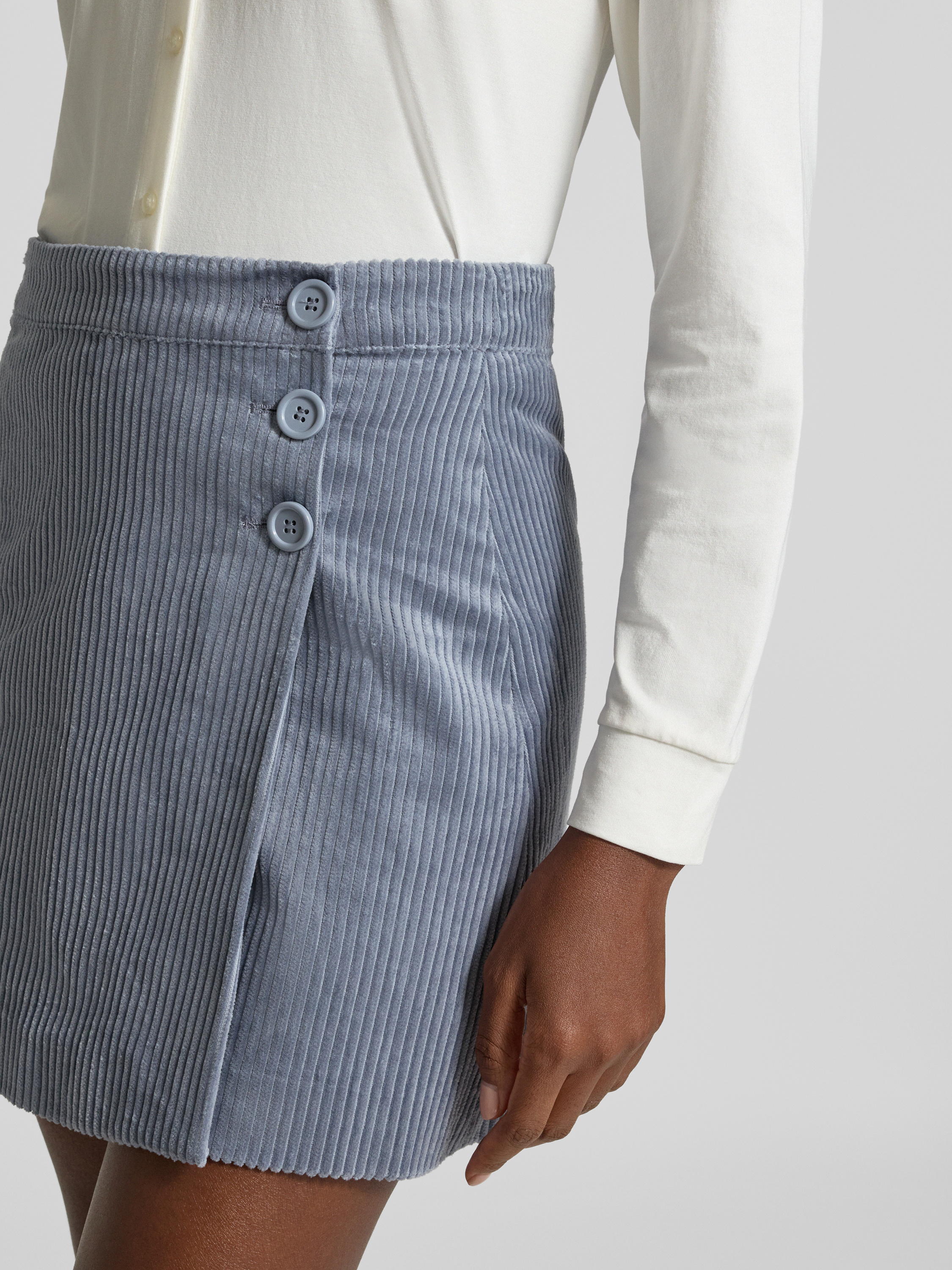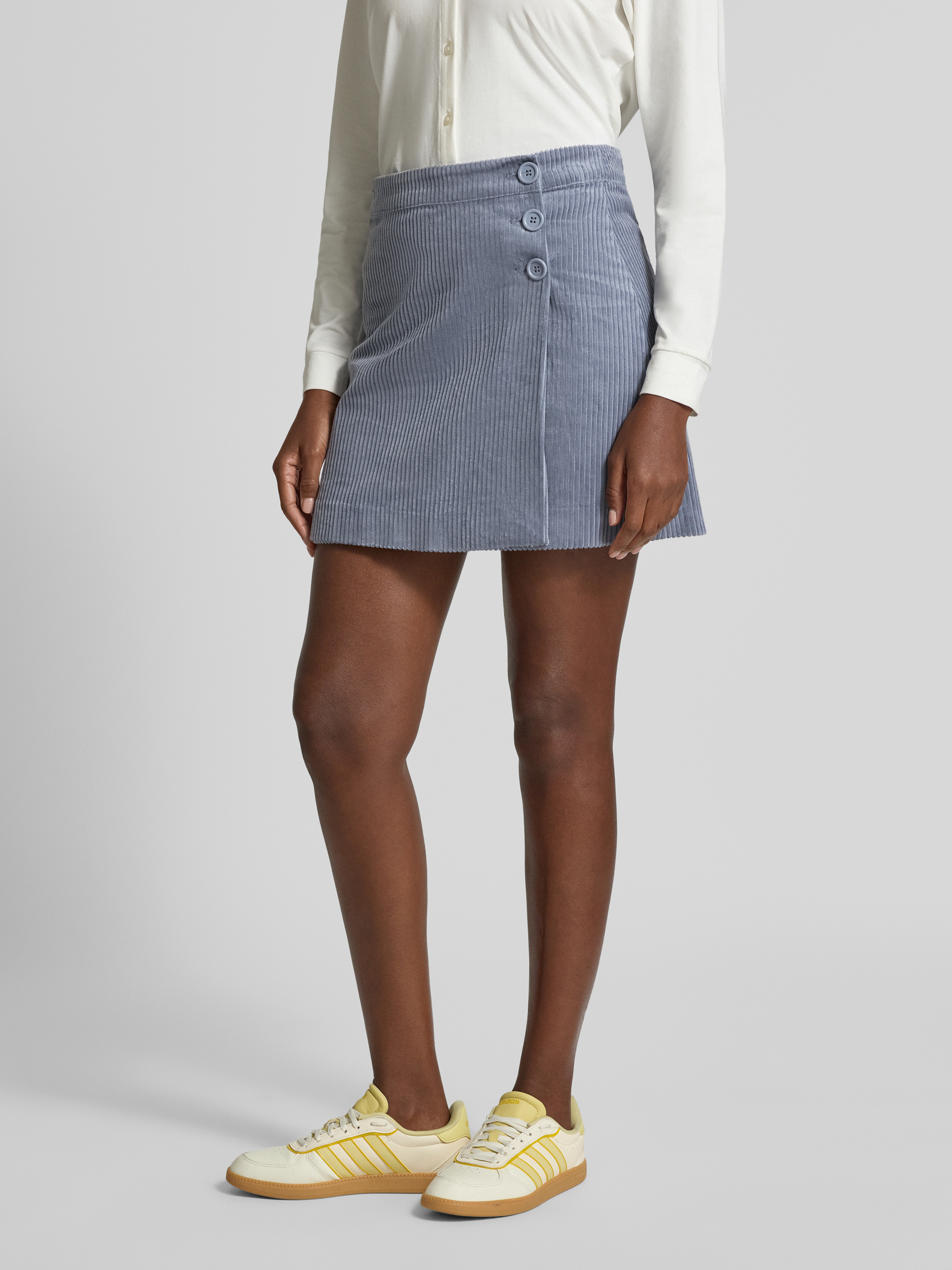 Der Minirock von mbyM, Modell Marlie, präsentiert sich in einer markanten Cord-Optik und bringt durch die A-Linie eine angenehme Bewegungsfreiheit mit sich. Reine Baumwolle sorgt dabei für ein natürliches Tragegefühl. Zierknöpfe am Bund setzen dezente Akzente und lockern das Design auf.