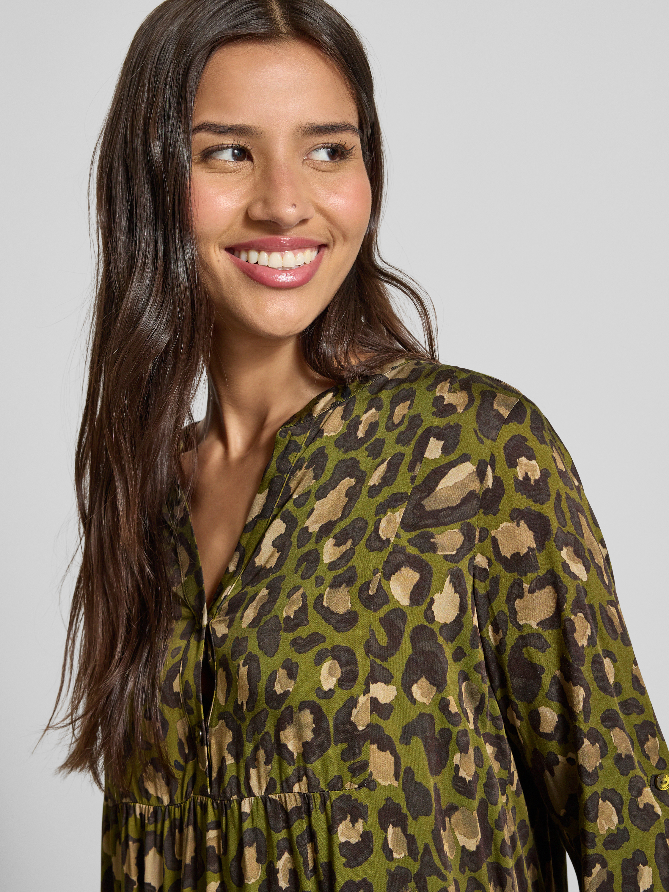 Das Damenkleid von Milano Italy präsentiert sich in knielanger Form und lockerer Silhouette, wodurch Bewegungsfreiheit im Alltag unterstützt wird. Der Tunikakragen verleiht dem Modell einen entspannten Akzent, während das angenehm leichte Material den Tragekomfort unterstreicht. So entsteht ein vielseitig kombinierbares Kleidungsstück.