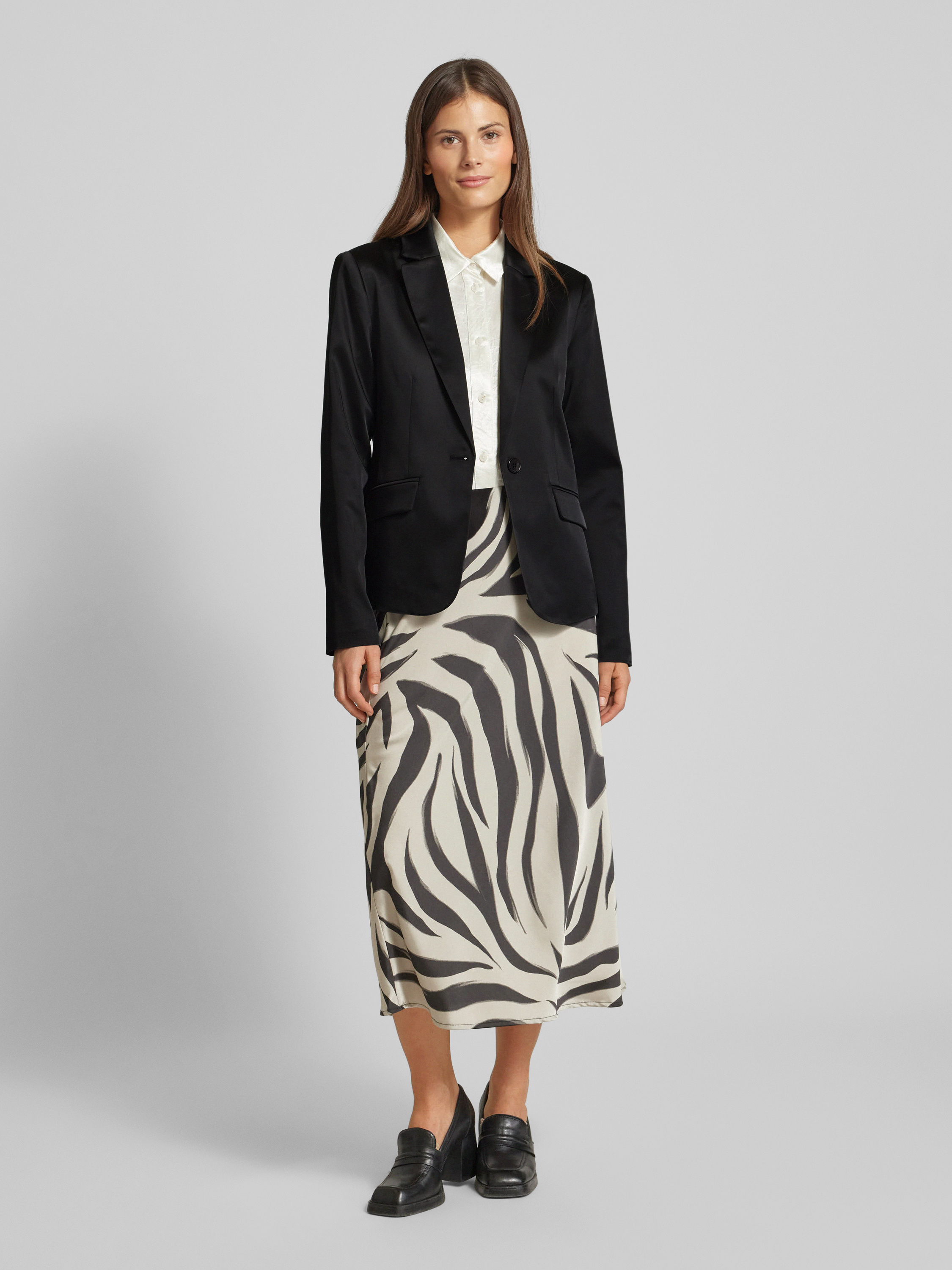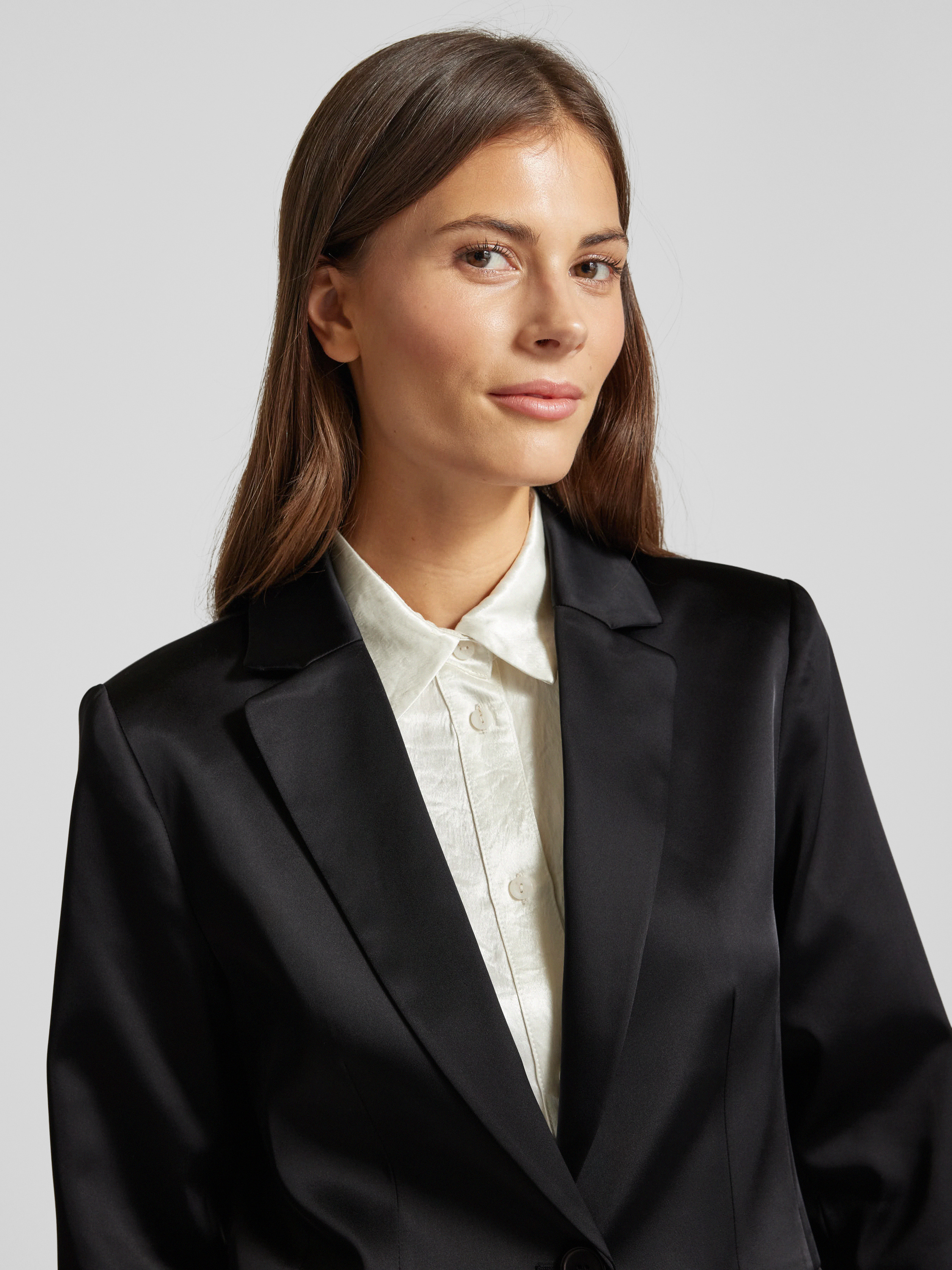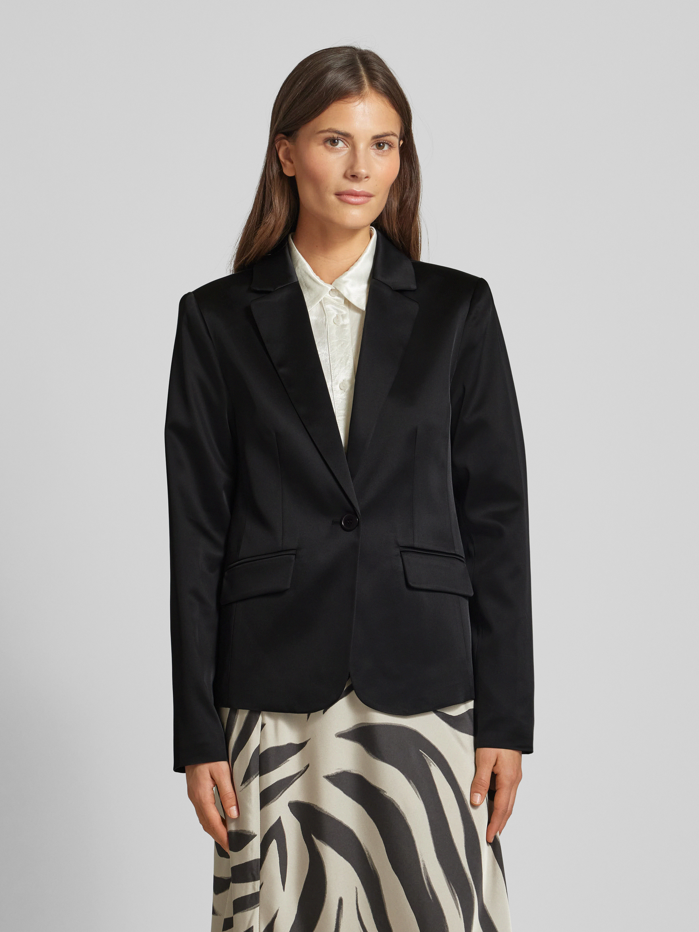 Der Damen Blazer von monari kombiniert einen eleganten Reverskragen mit einem angenehmen Material-Mix, der durch seinen Stretch-Anteil Bewegungsfreiheit ermöglicht. Der leicht taillierte Schnitt sorgt für eine schmeichelnde Silhouette, während die praktischen Pattentaschen nützliche Aufbewahrungsmöglichkeiten bieten.