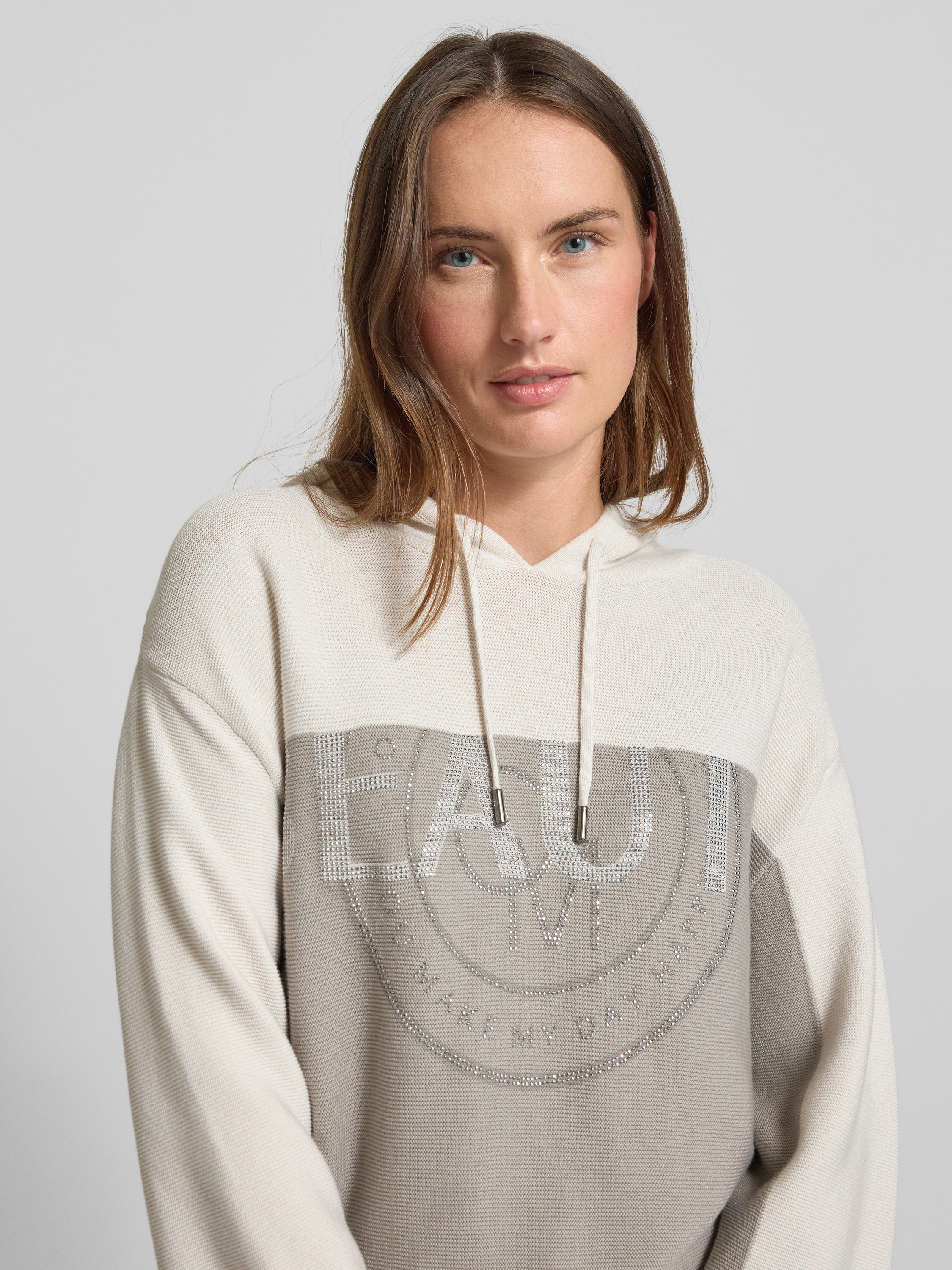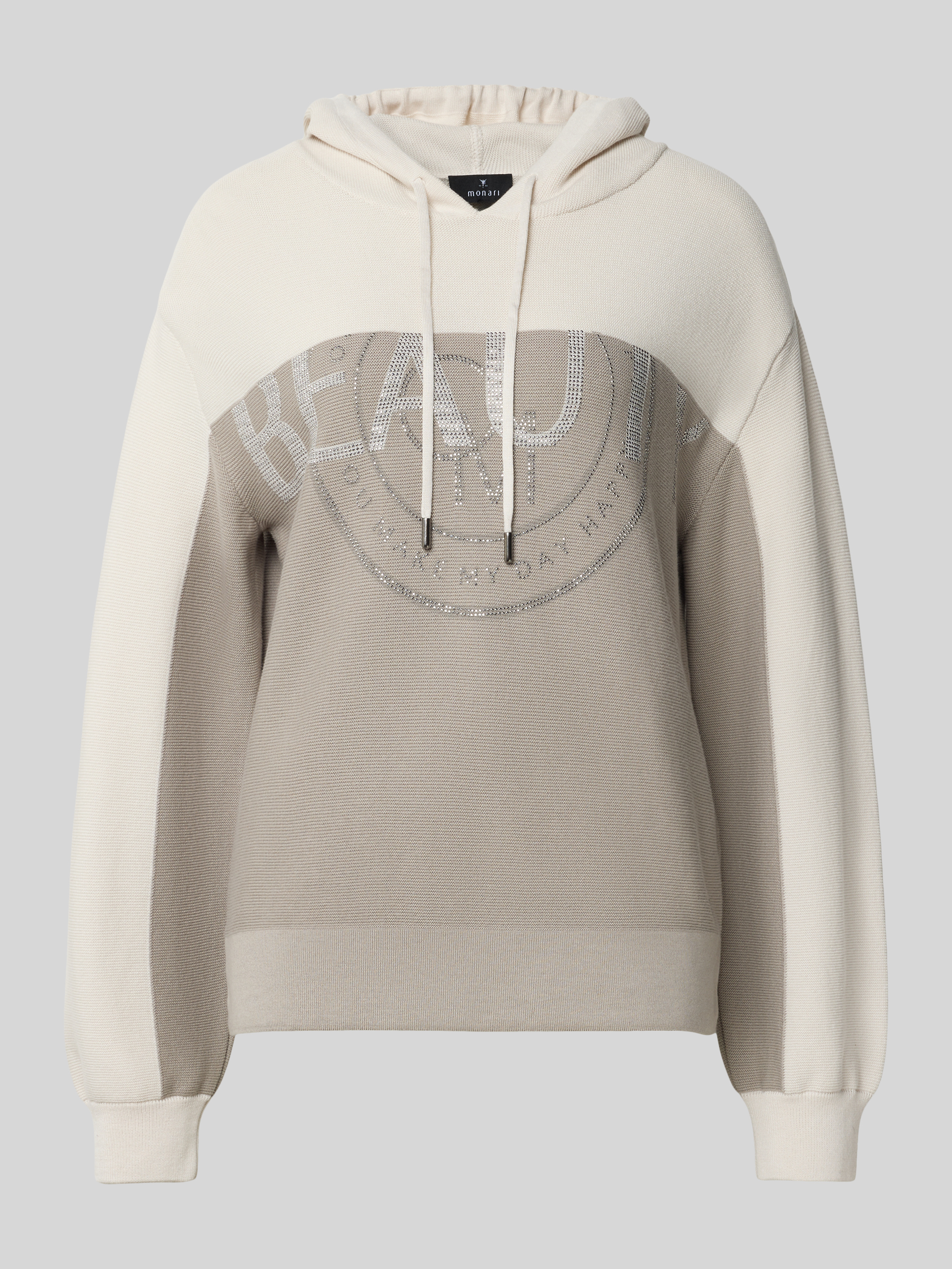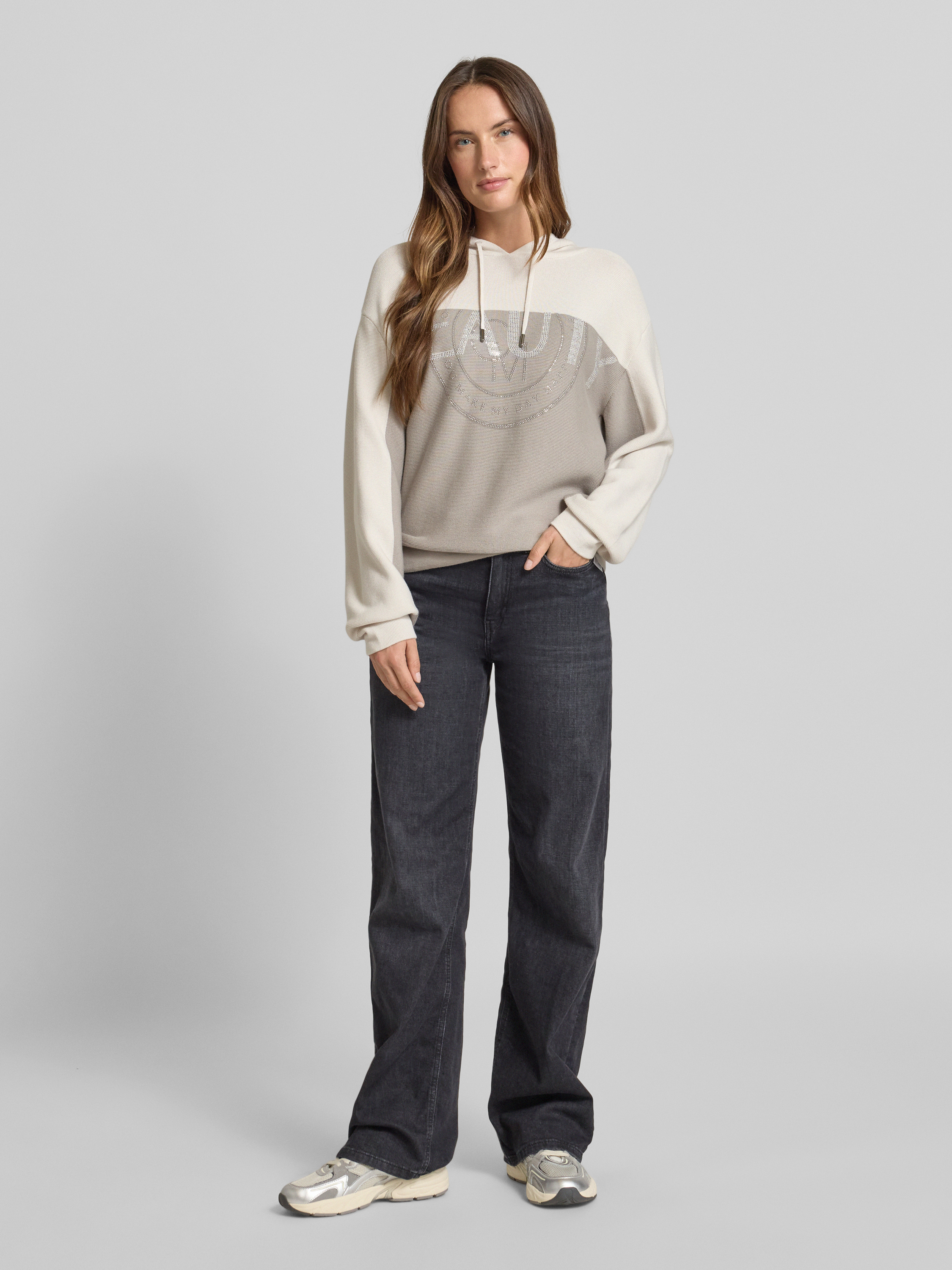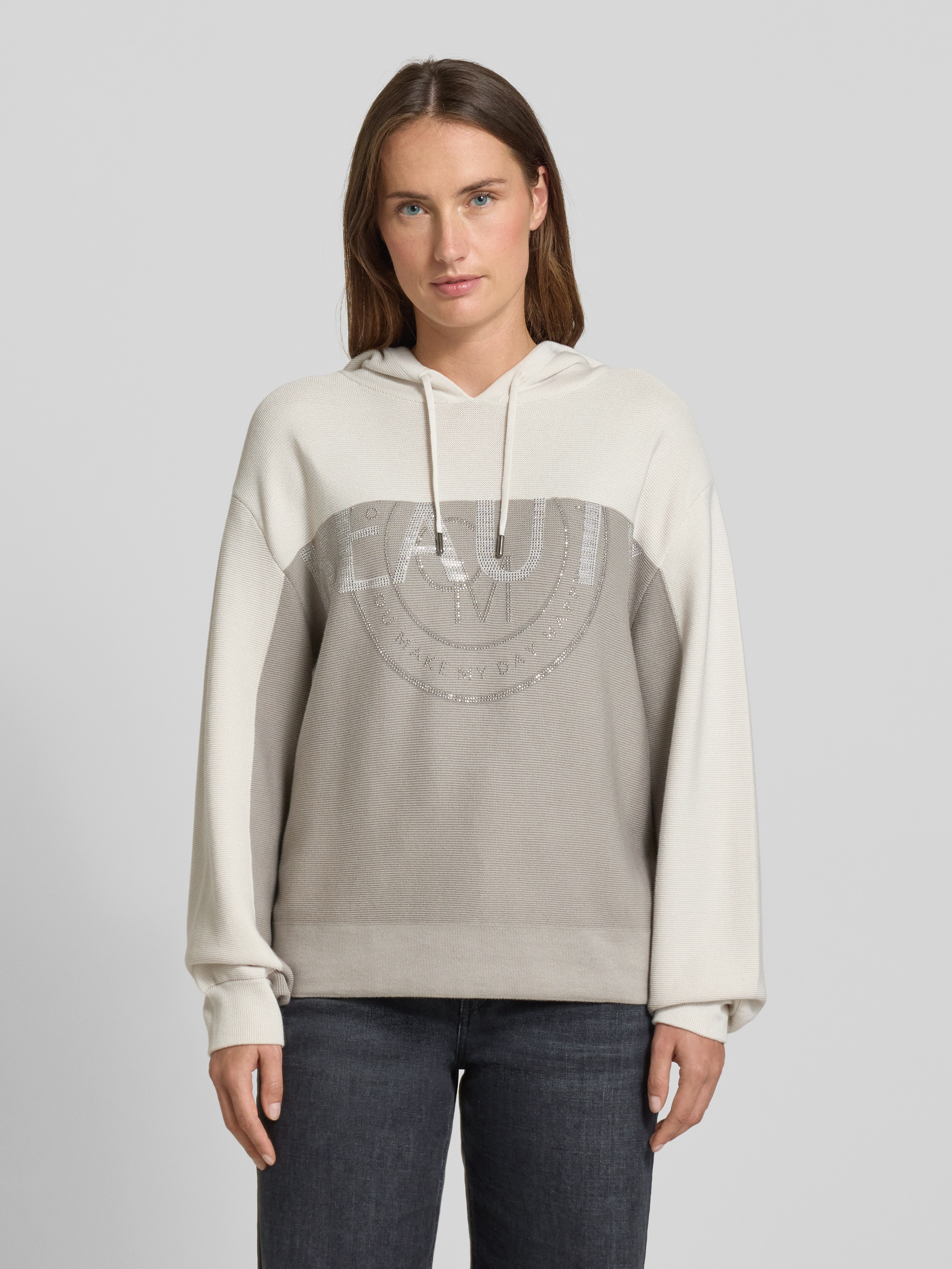 Der Damen Hoodie von monari aus reiner Baumwolle legt sich angenehm weich auf die Haut und lässt durch den lockeren Schnitt Bewegungsfreiheit zu. Dezente Strasssteine setzen feine Akzente, während die Kapuze mit Tunnelzug unkomplizierte Lässigkeit in den Alltag bringt. So entsteht ein entspanntes Tragegefühl, das stilvolle Details integriert.