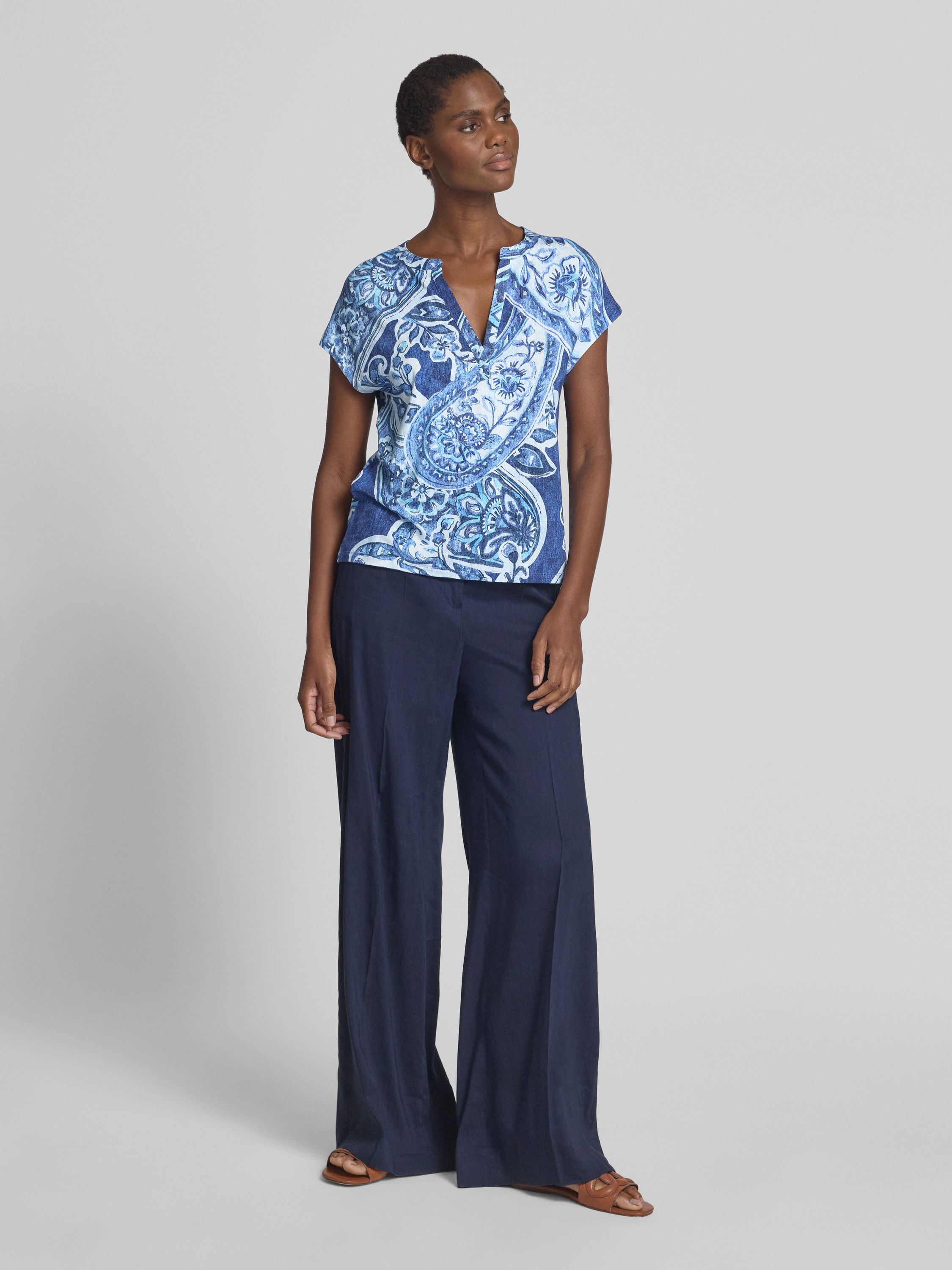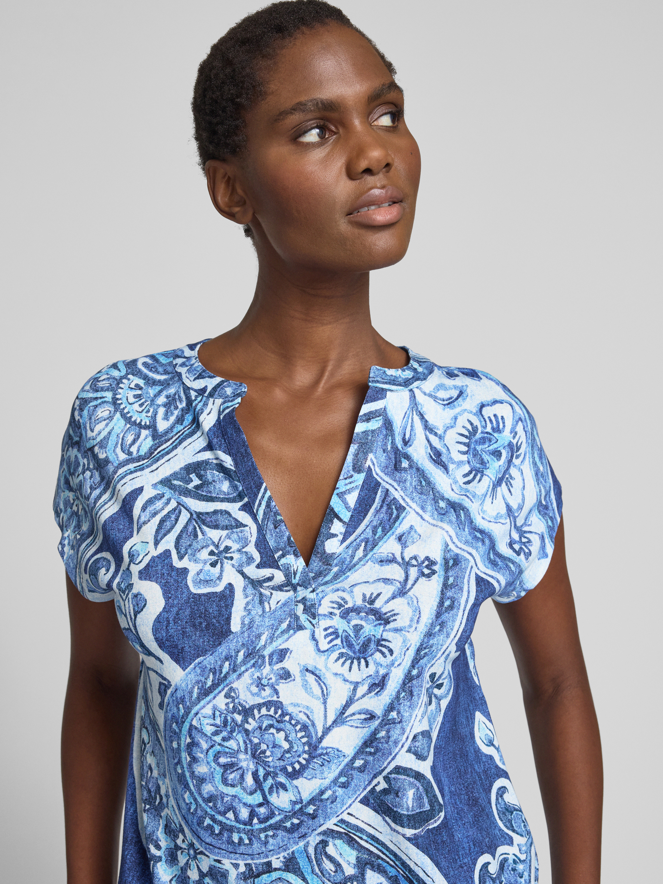 Das Damen T-Shirt von monari kombiniert einen bequemen, geraden Schnitt mit einem eleganten Tunikakragen. Der Viskose-Elasthan-Mix sorgt für ein angenehmes Tragegefühl und die Kappärmel fügen eine dezente, stilvolle Note hinzu. Ideal geeignet für entspannte und modische Auftritte.