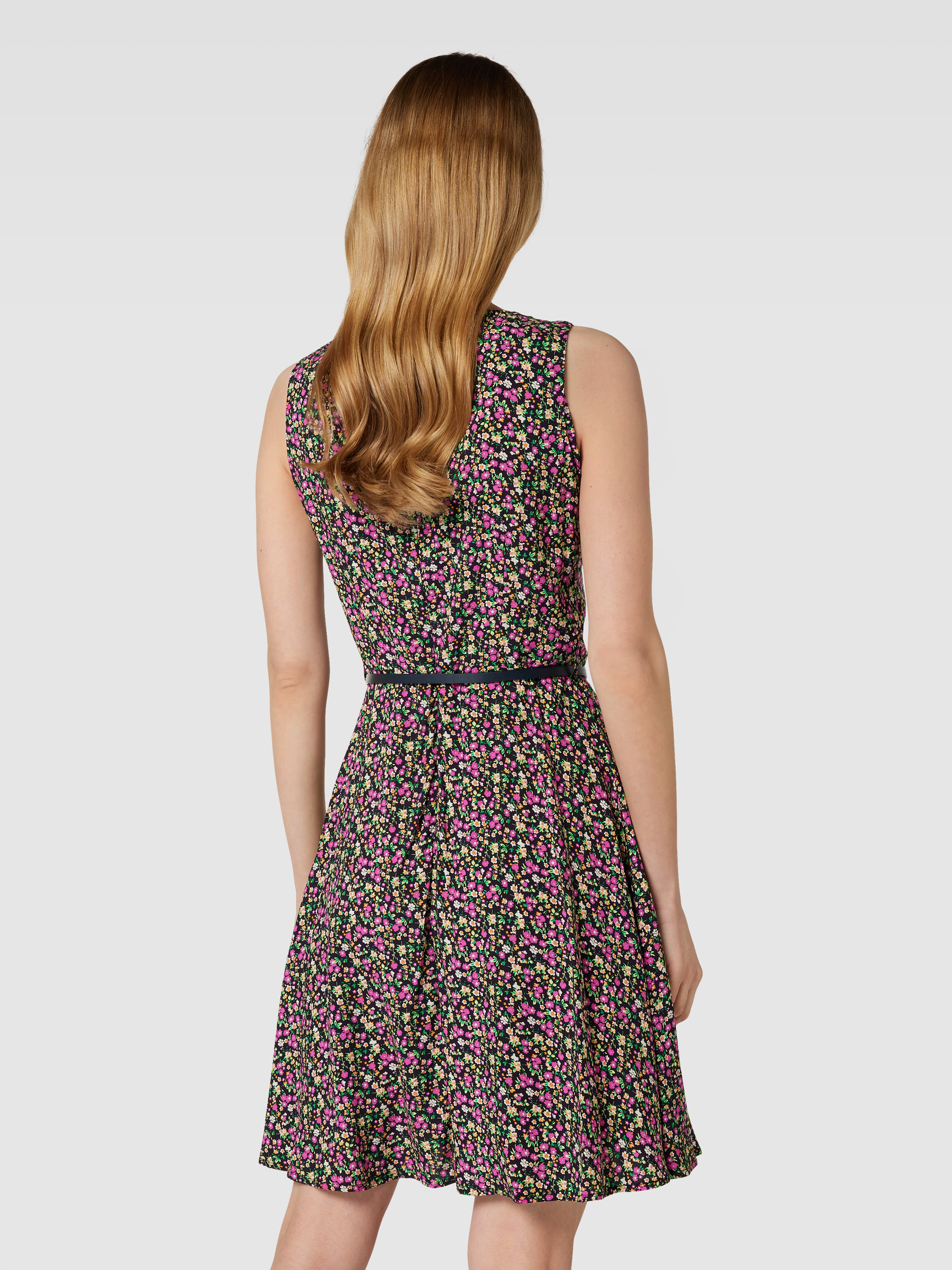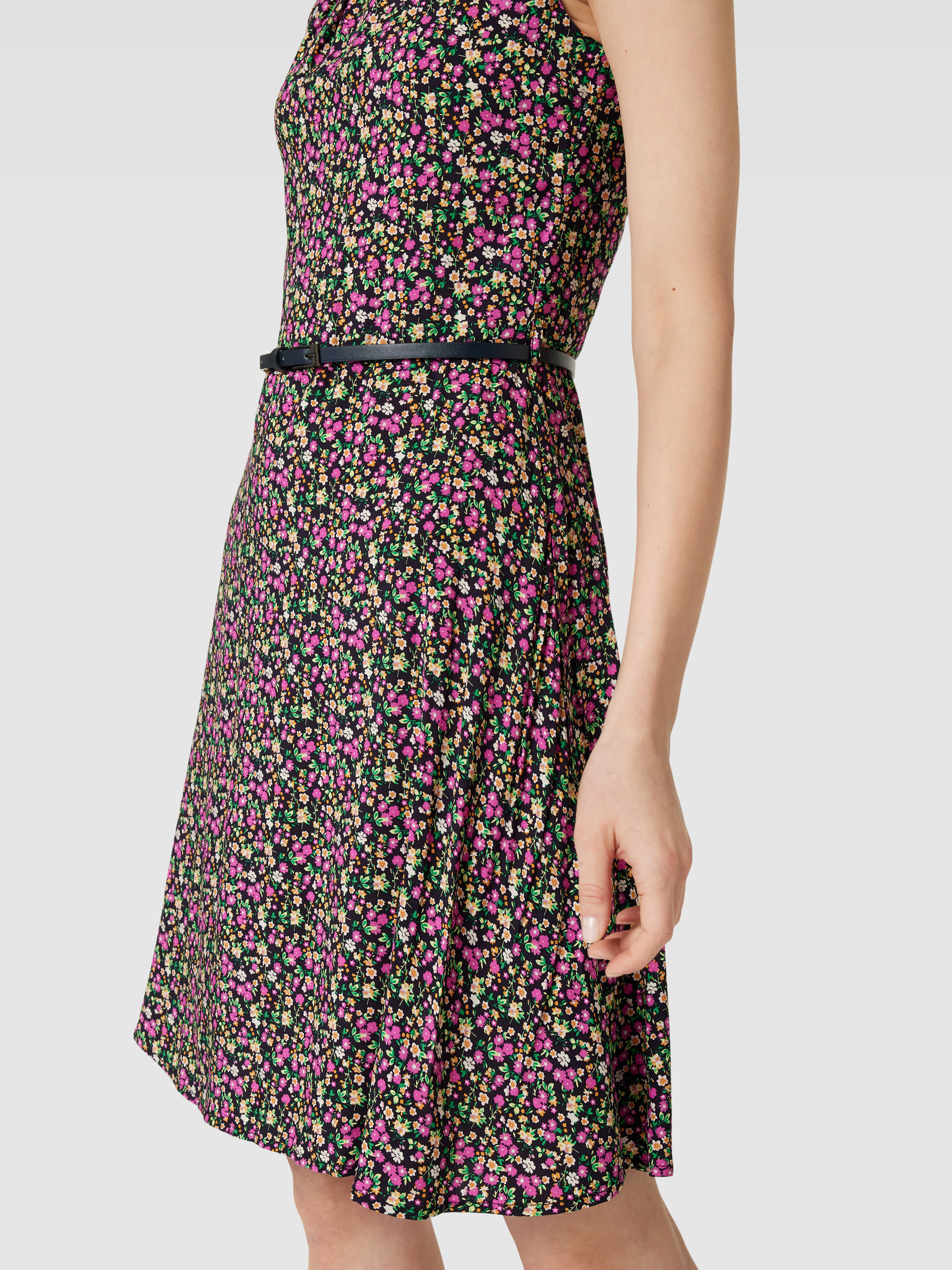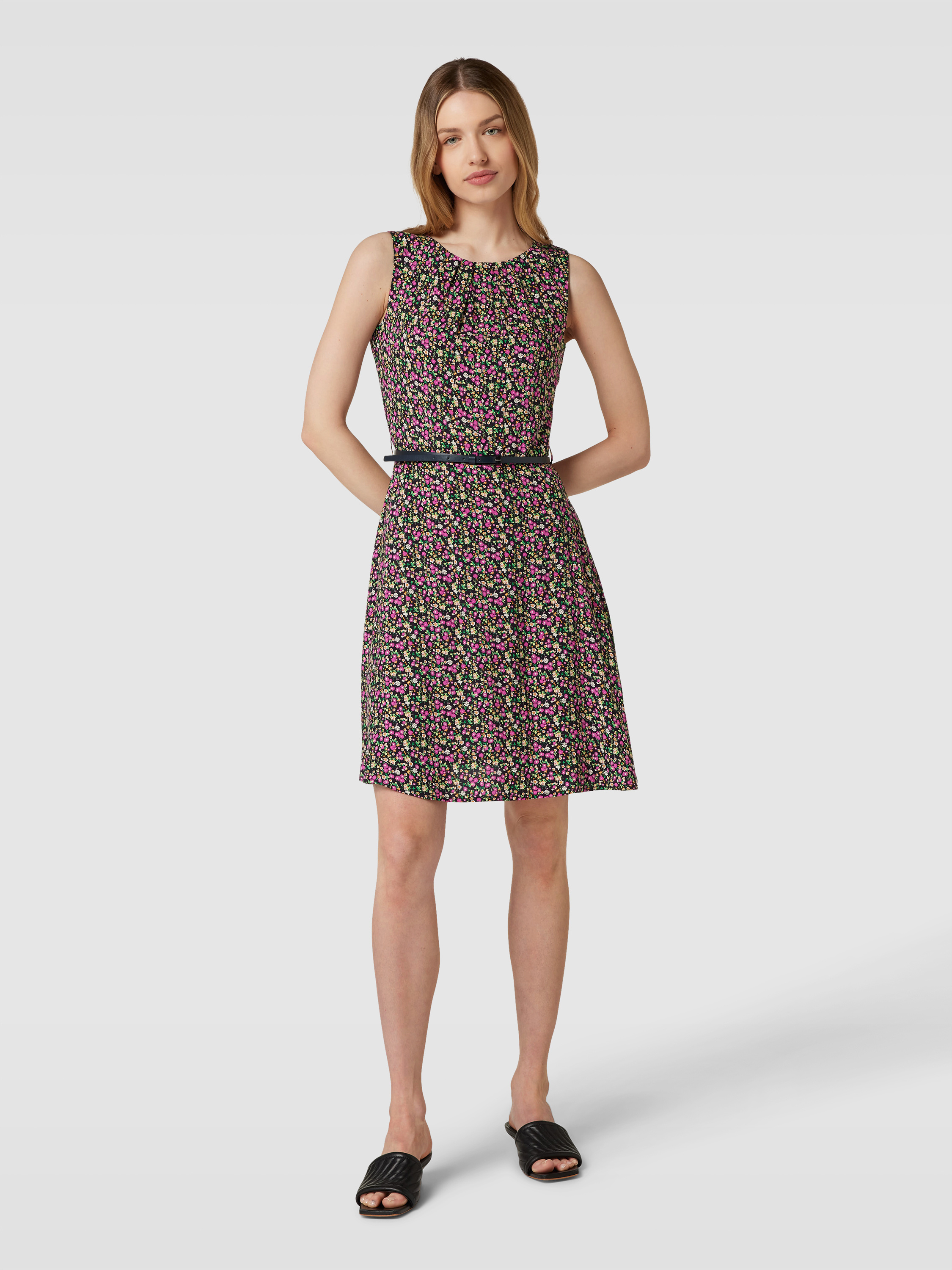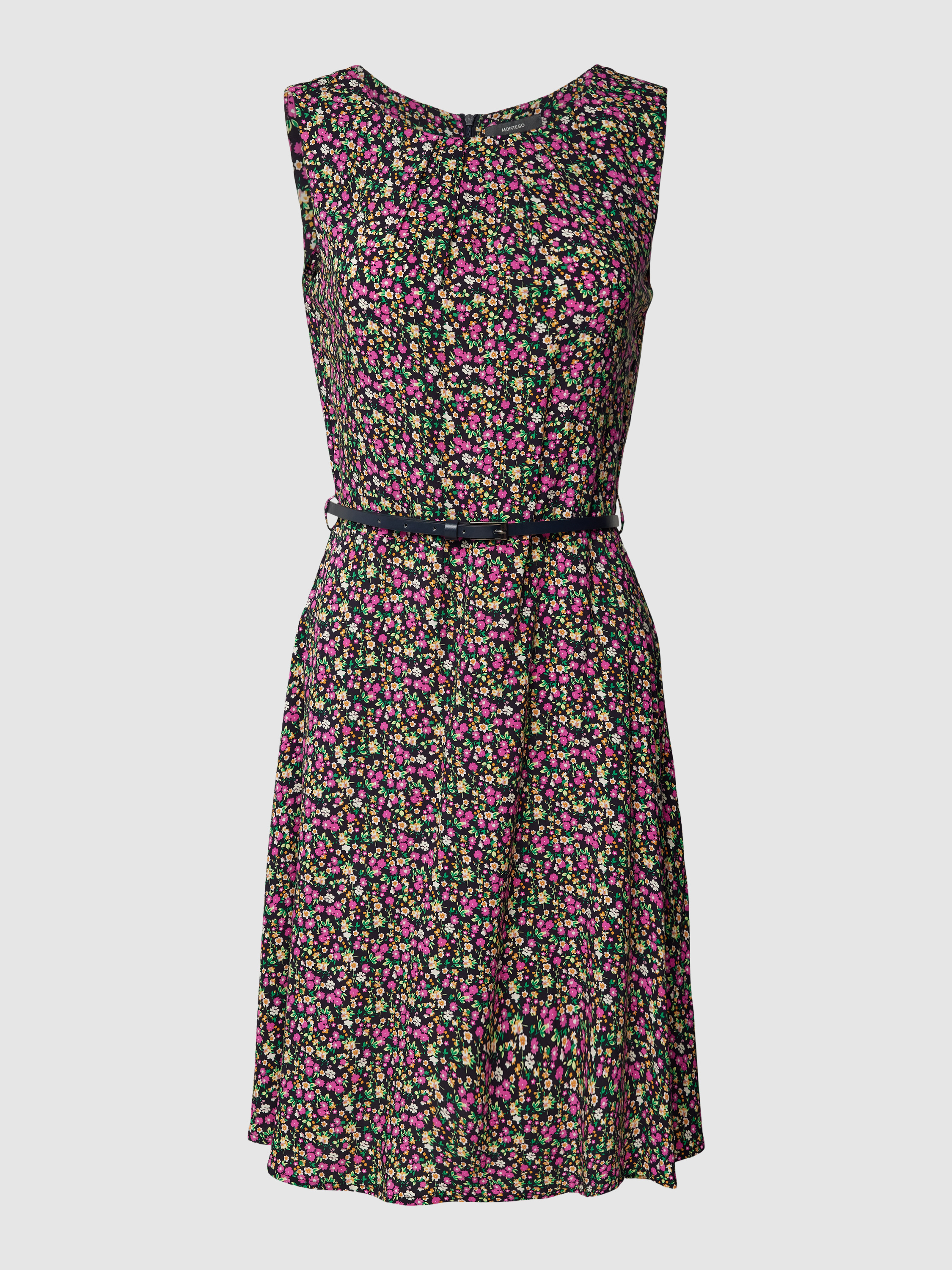 Das knielange Kleid von MONTEGO aus reiner Viskose verbindet Komfort mit einem femininen Look. Der florale Print und der gerade Schnitt sorgen für eine angenehme Passform, während der Taillengürtel eine sanfte Silhouette formt. Der Rundhalsausschnitt rundet das elegante Design ab.