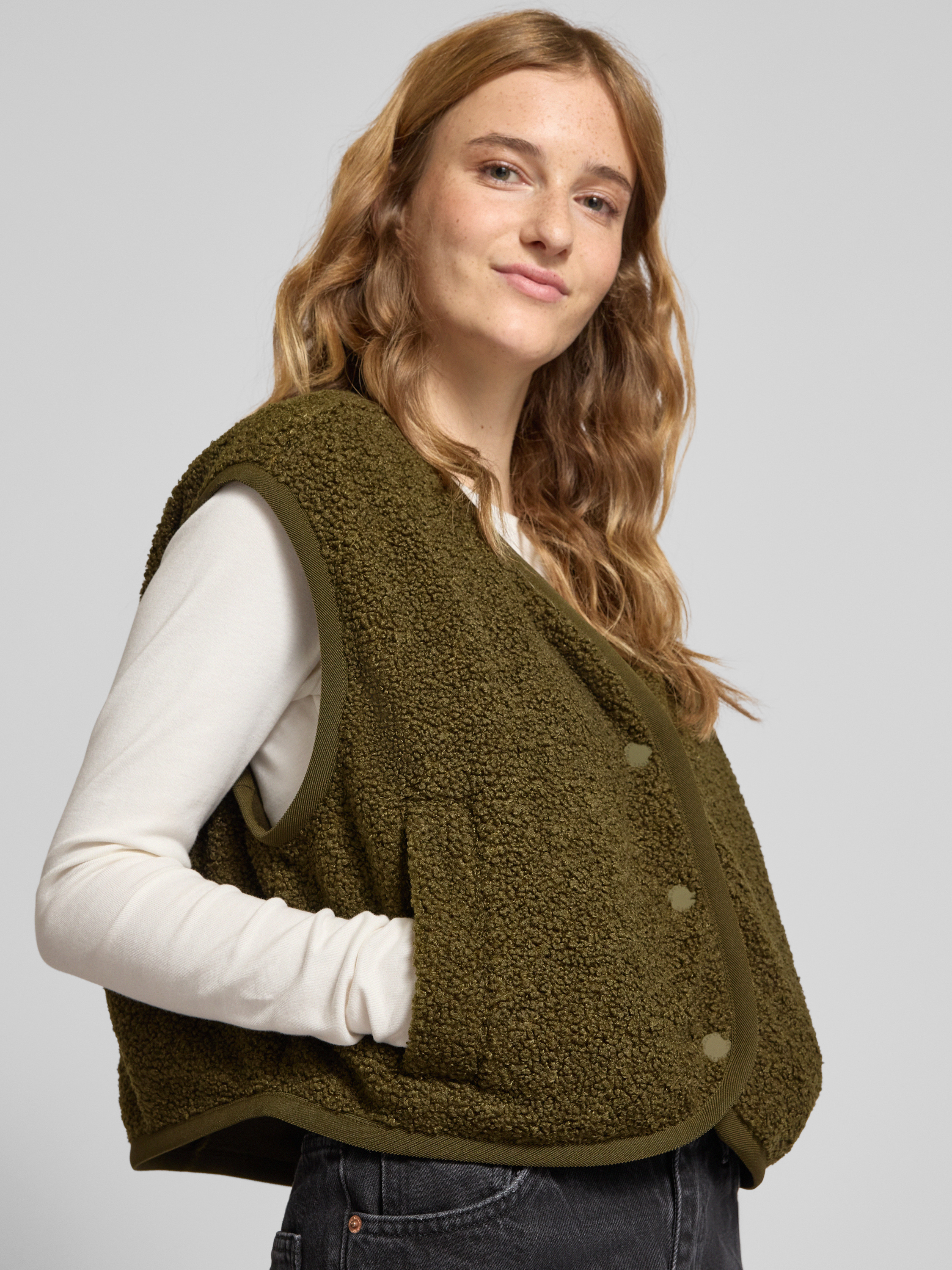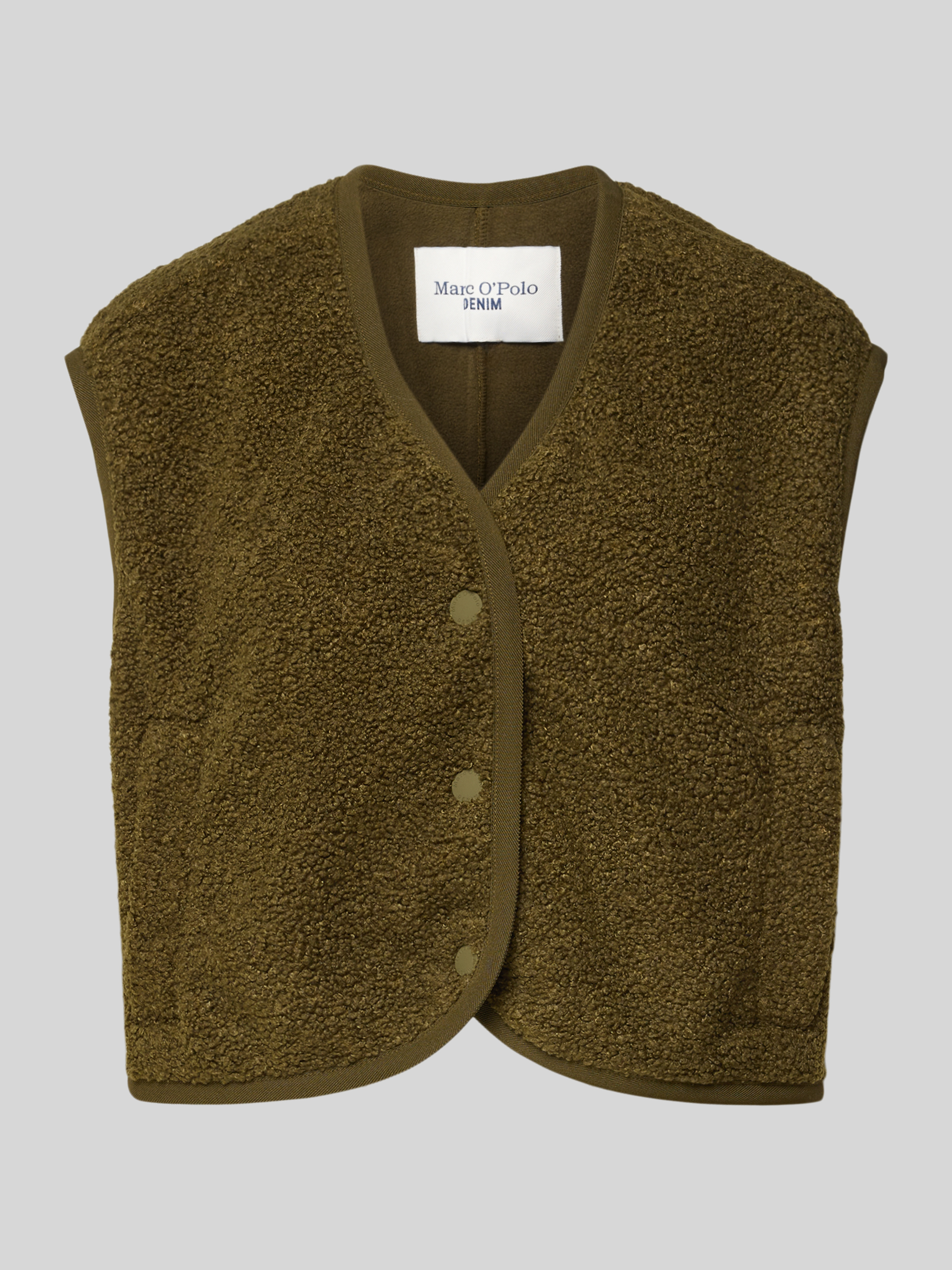 Marc O'Polo DenimBoxy Fit Teddyfell-Weste mit Druckknopfleiste in oliv