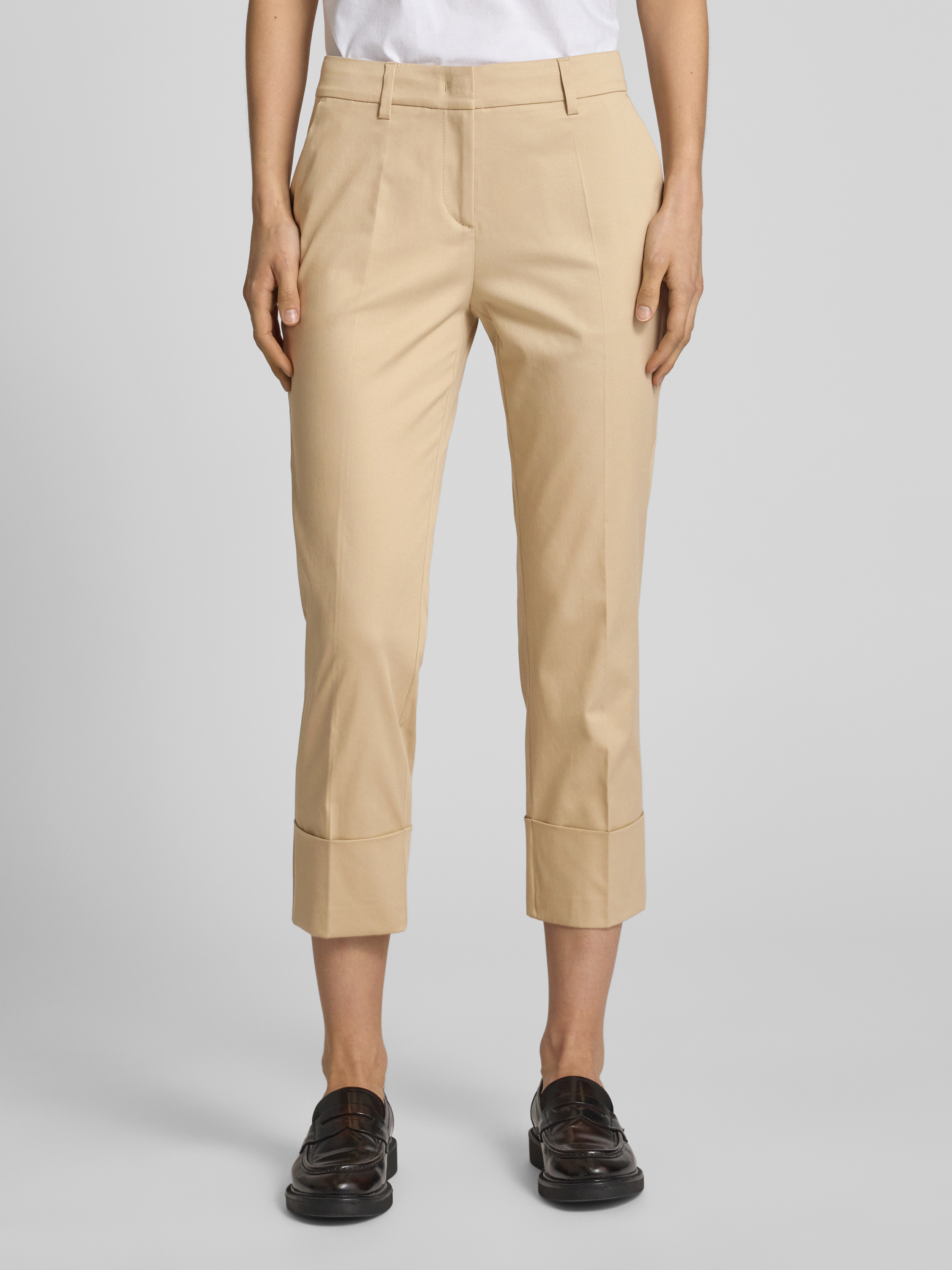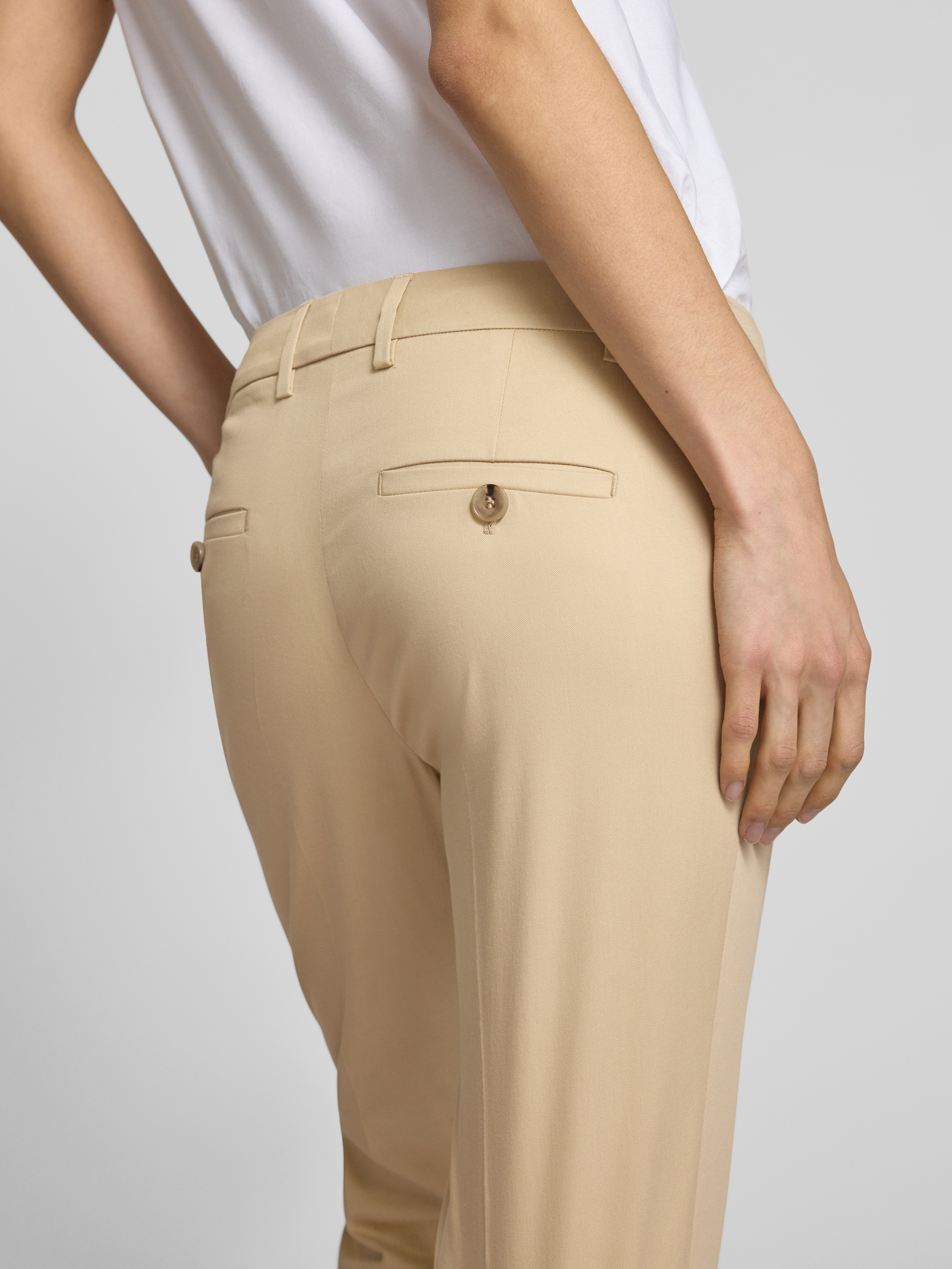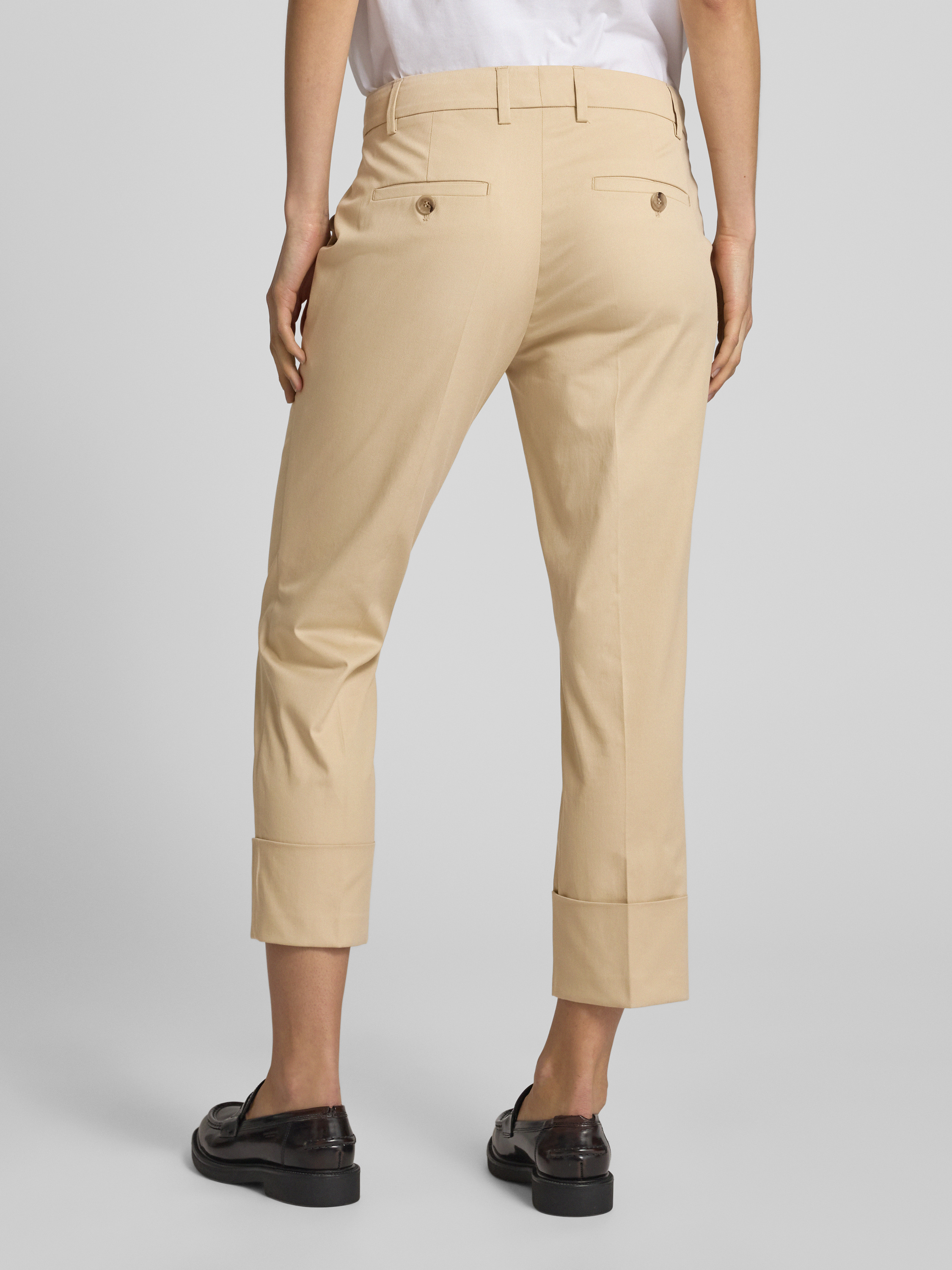 Die Damenhose von MORE kombiniert einen angenehmen Baumwoll-Mix mit einem Lyocell-Anteil, der für eine sanfte Haptik sorgt. Der Regular Fit und die eleganten Bügelfalten schaffen einen stilvollen Look, während die Gesäßtaschen praktischen Stauraum bieten. Ideal für vielseitige Anlässe.
