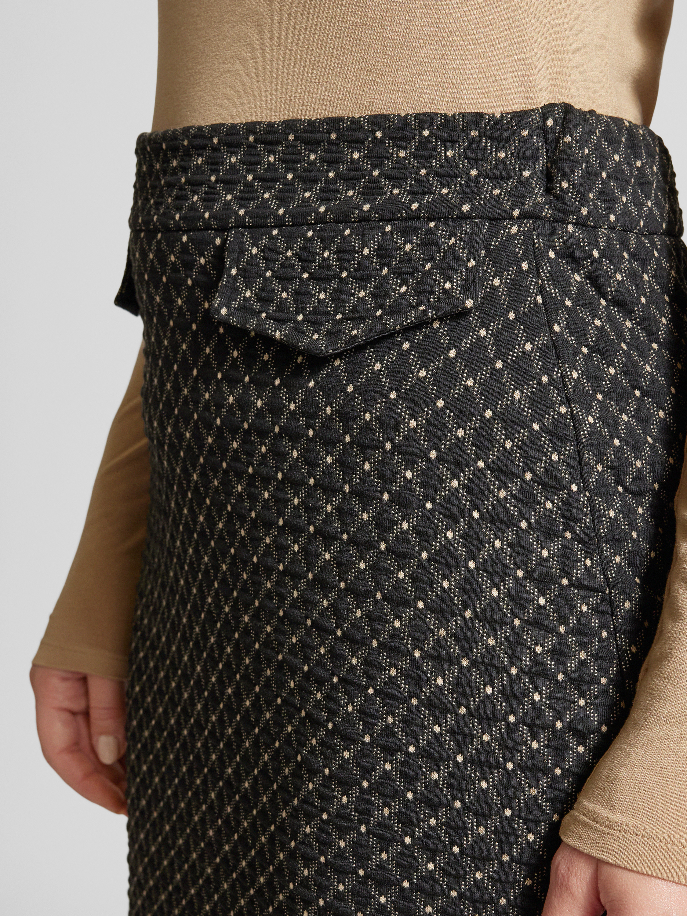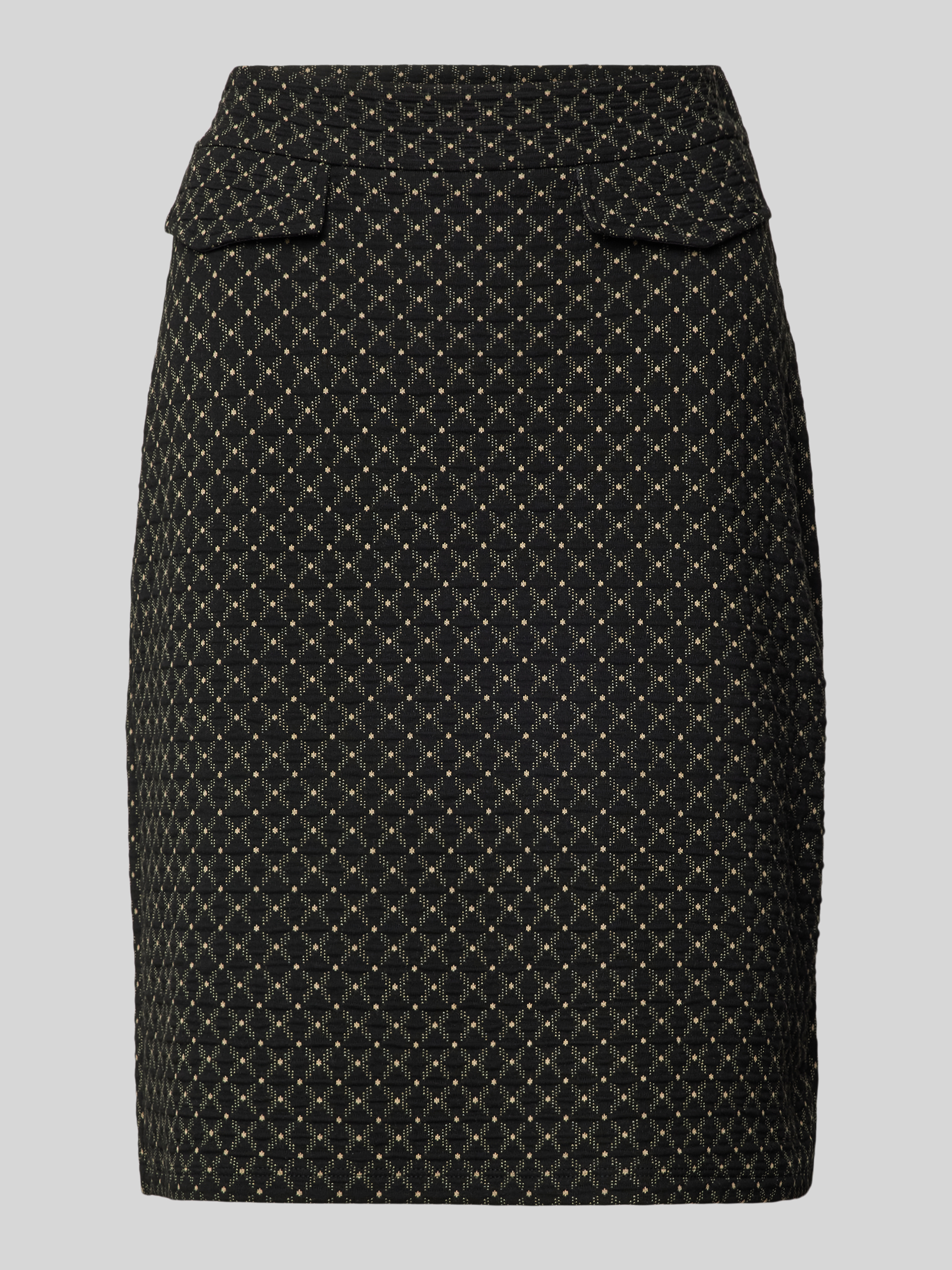 Der Rock von MORE & MORE in knielanger Ausführung kombiniert einen geraden Schnitt mit einem Material-Mix, der Viskose enthält. Die Pattentaschen und die Teilungsnähte verleihen dem Design eine strukturierte Eleganz. Er eignet sich ideal für unterschiedliche Anlässe und bietet vielseitige Kombinationsmöglichkeiten.