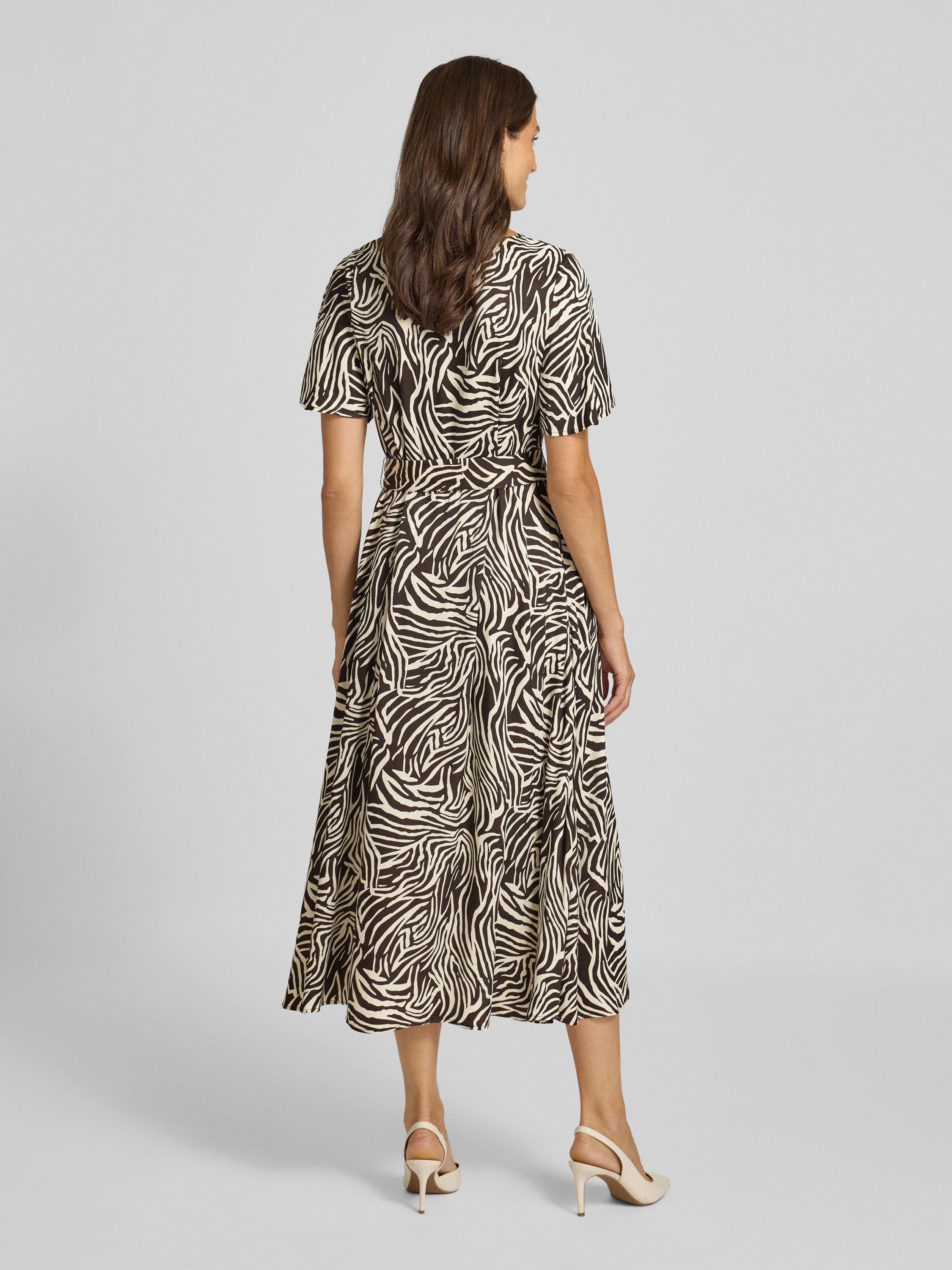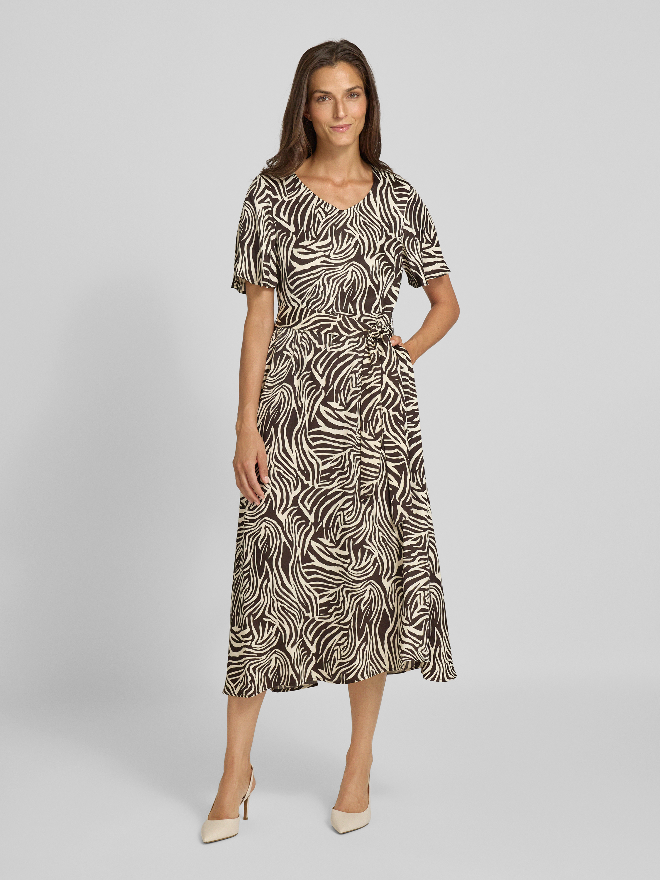 Das Midikleid von More & More aus reiner Viskose schmiegt sich mit seinem taillierten Schnitt sanft an die Silhouette an. Ein Rundhalsausschnitt und ein passender Taillengürtel verleihen dem kurzärmeligen Design eine feminine Note. Ideal für verschiedenste Anlässe.