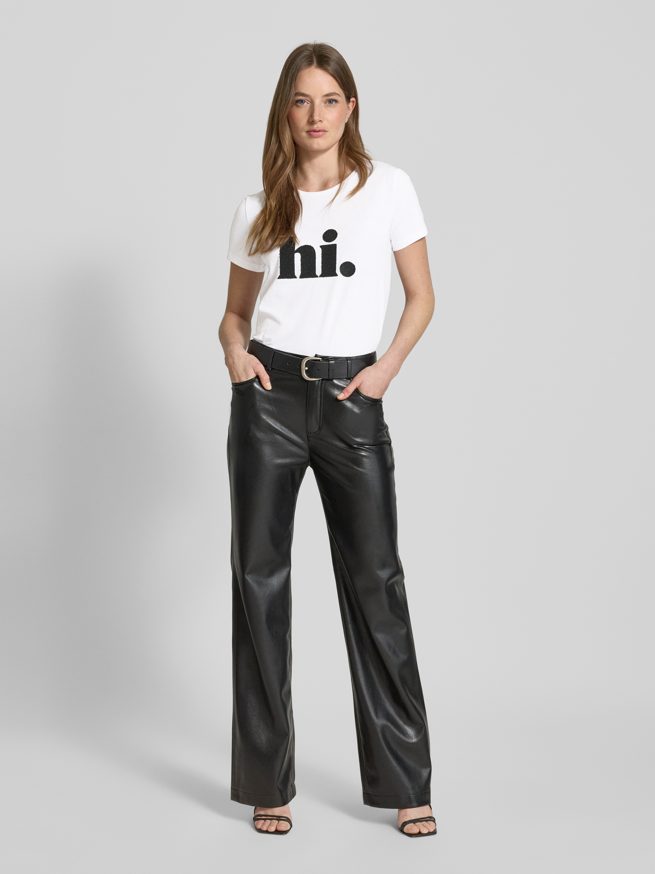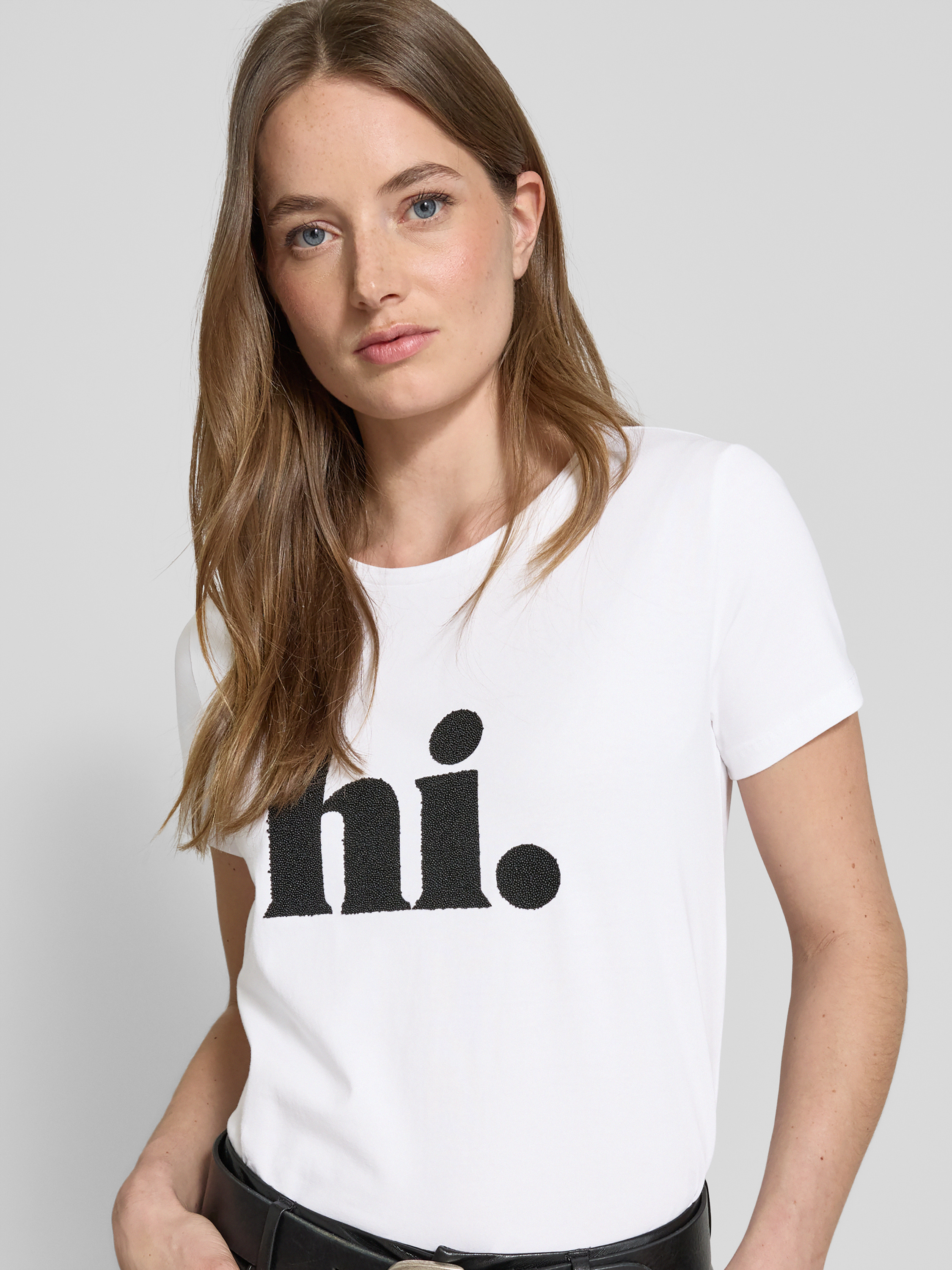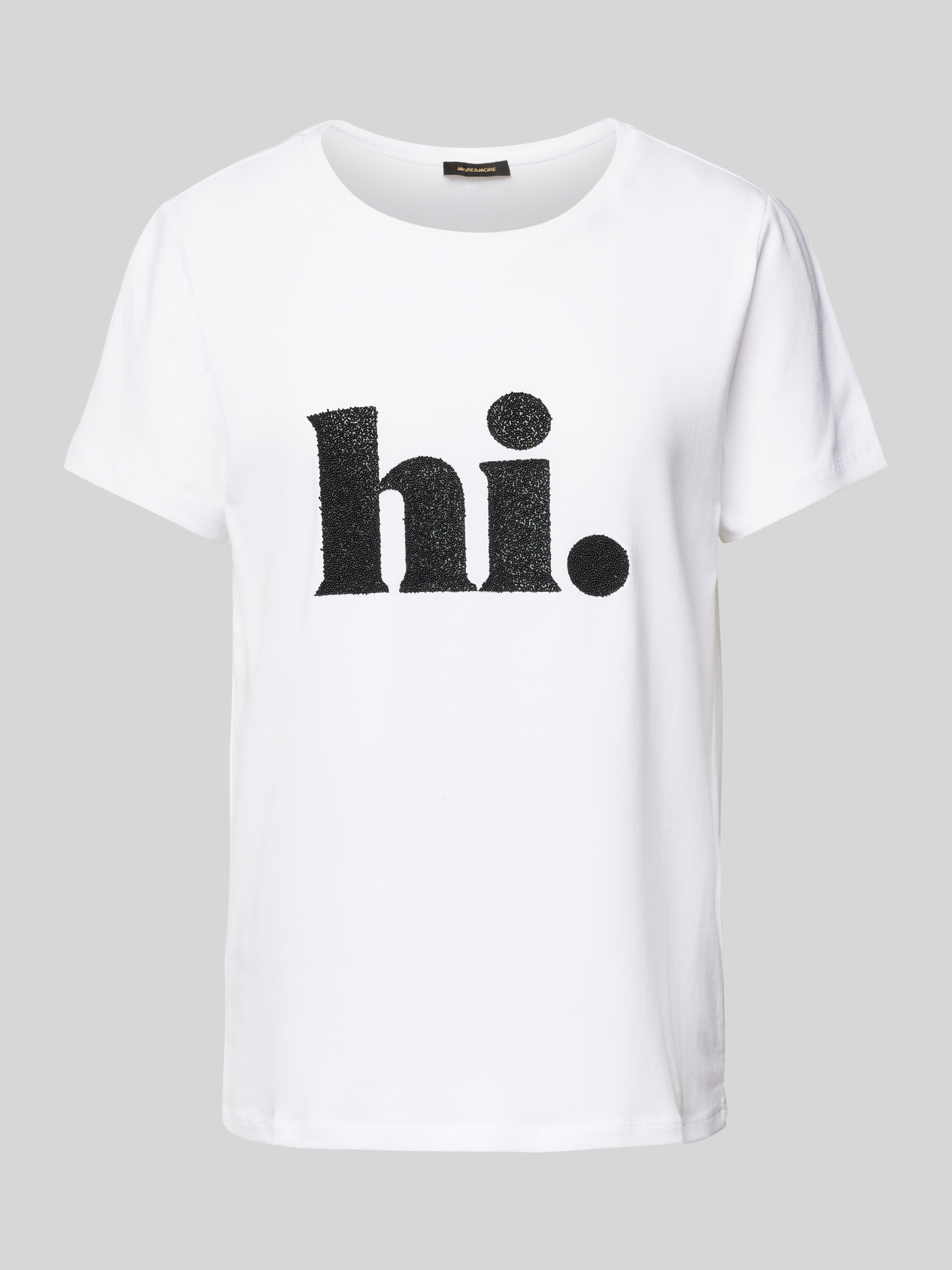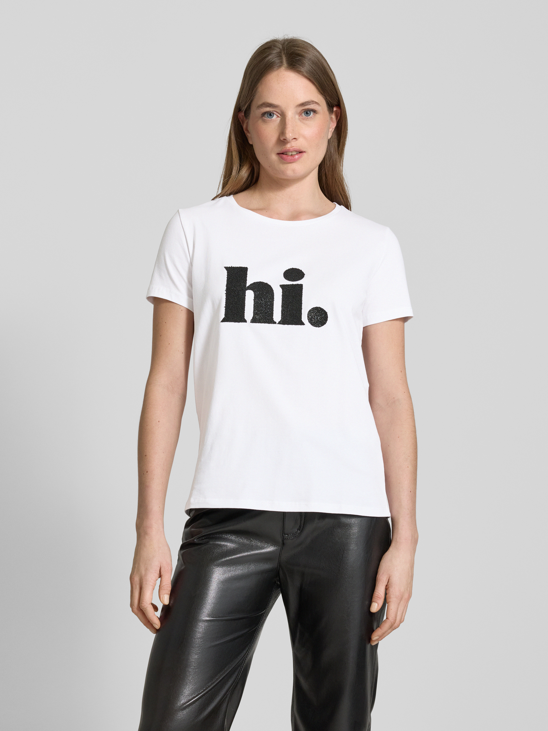 Das Damen T-Shirt von MORE & MORE zeichnet sich durch einen geraden Schnitt und einen klassischen Rundhalsausschnitt aus. Der Baumwoll-Mix mit Stretch-Anteil sorgt für einen angenehmen Tragekomfort. Der auffällige Statement-Print und der Ziersteinbesatz setzen stilvolle Akzente.