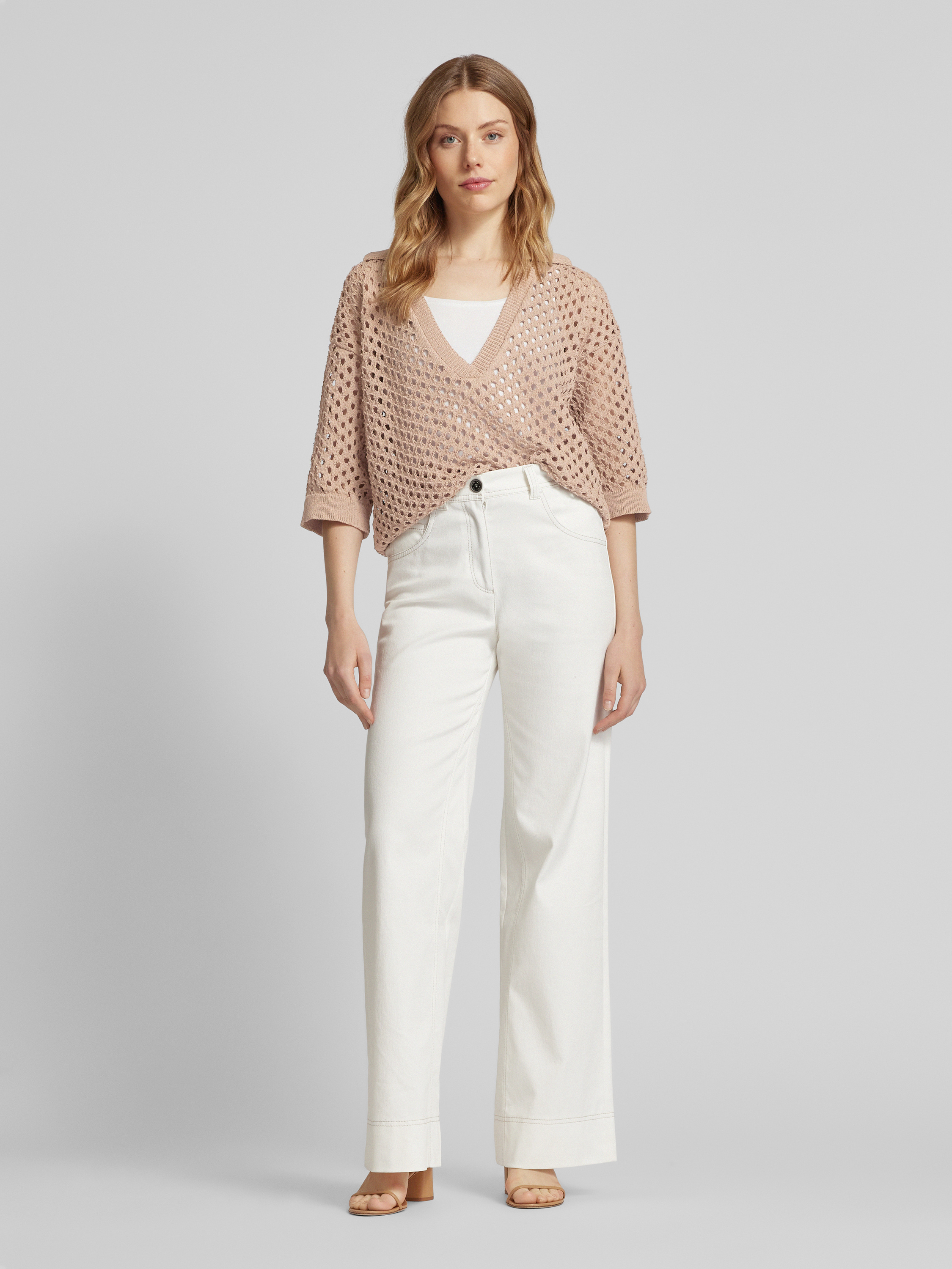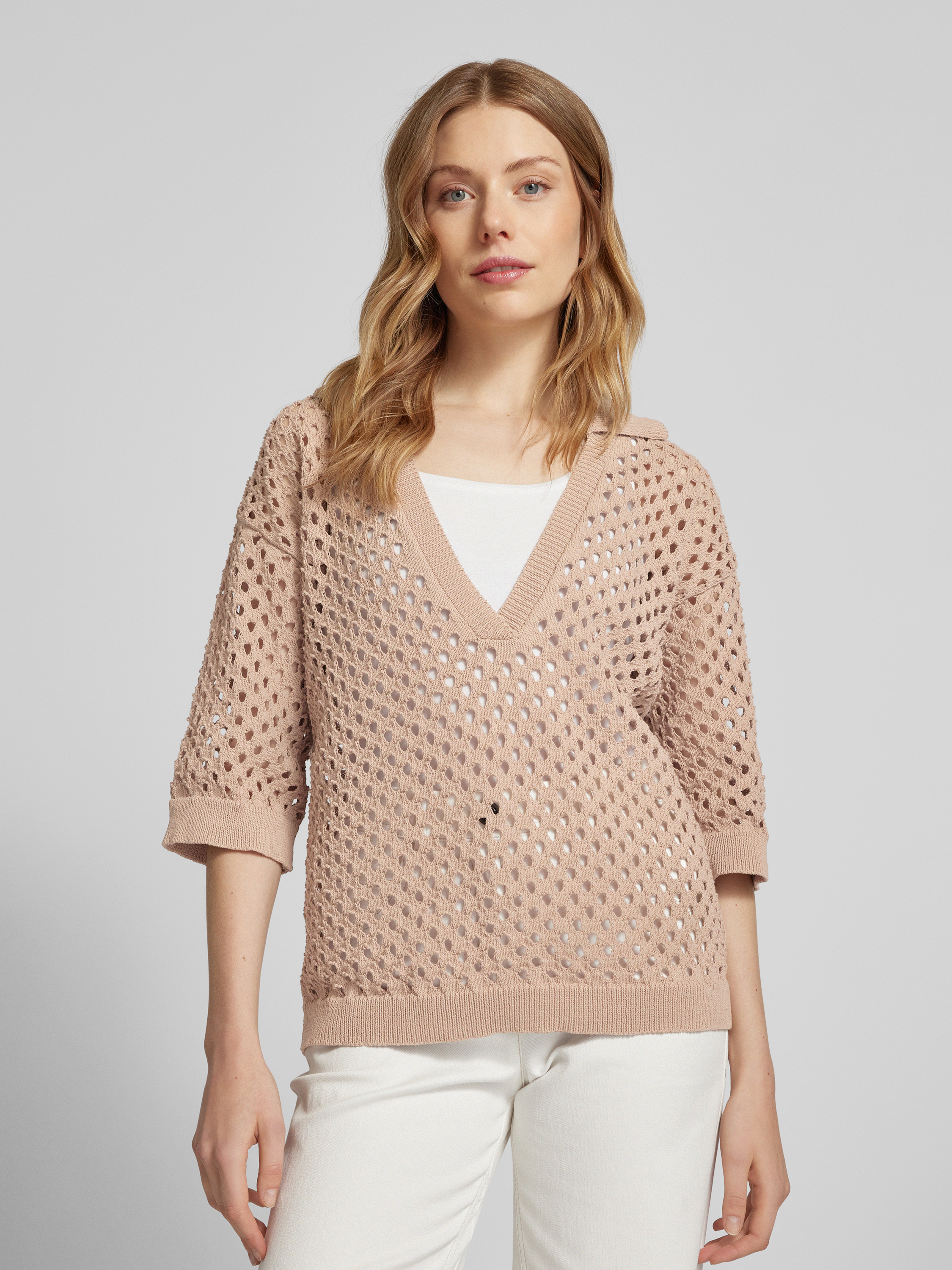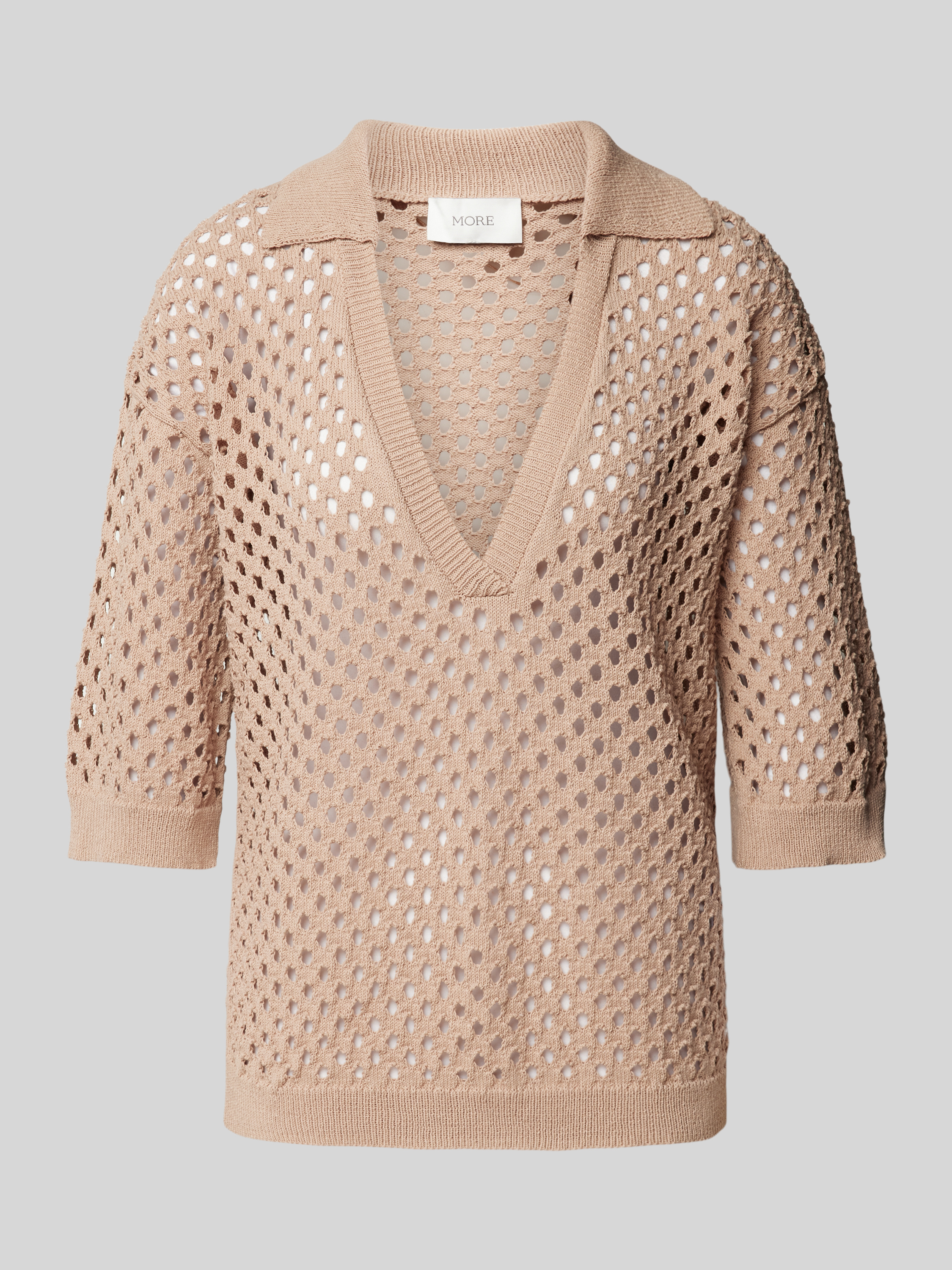 Das Damen Strickshirt von MORE im geraden Schnitt kombiniert einen Baumwoll-Mix mit einem ansprechenden Lochmuster. Der Reverskragen und der V-Ausschnitt verleihen dem Shirt eine dezente Eleganz, während die gerippten Abschlüsse für einen angenehmen Sitz sorgen. Ideal für vielseitige Alltagskombinationen.