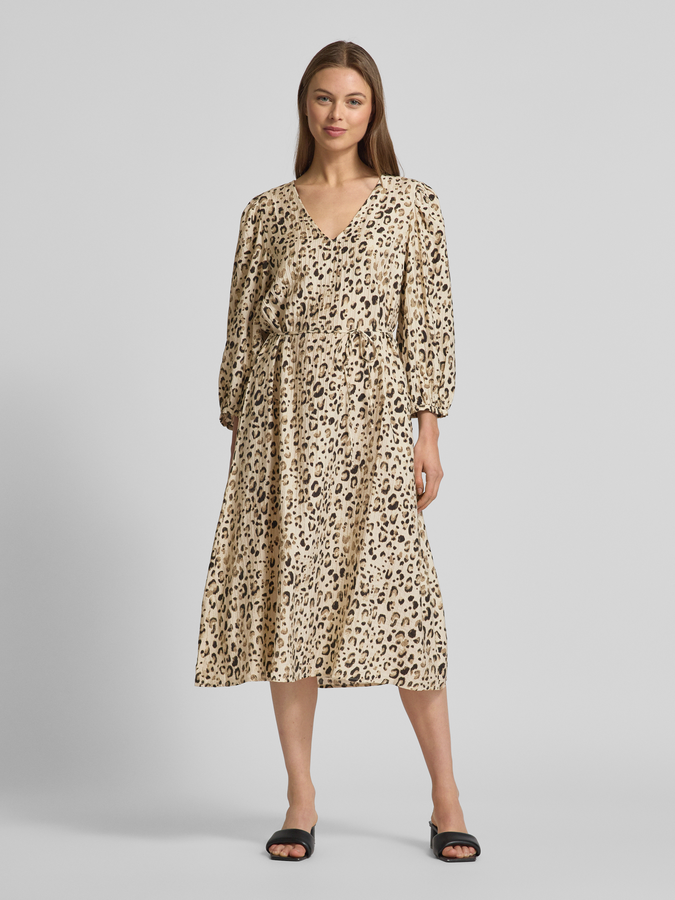 Das knielange Kleid mit V-Ausschnitt Modell 'Alyona Vlora' von MSCH COPENHAGEN kombiniert einen geraden Schnitt mit einem eleganten Bindegürtel, wodurch es sich vielseitig anpassen lässt. Der Viskose-Mix sorgt für ein angenehmes Tragegefühl. Dank der 3/4-Ärmel wirkt es stilvoll und zeitgemäß.
