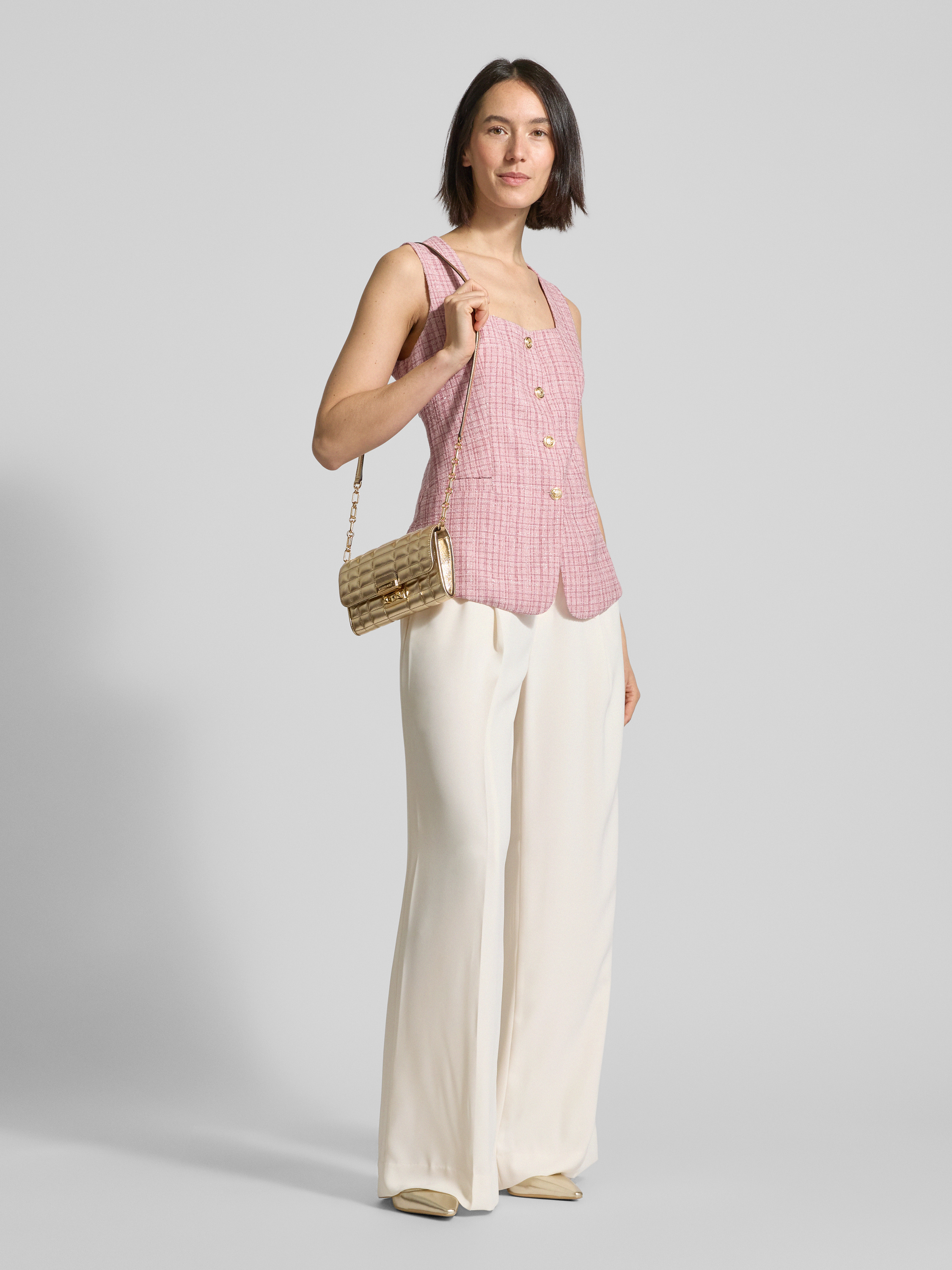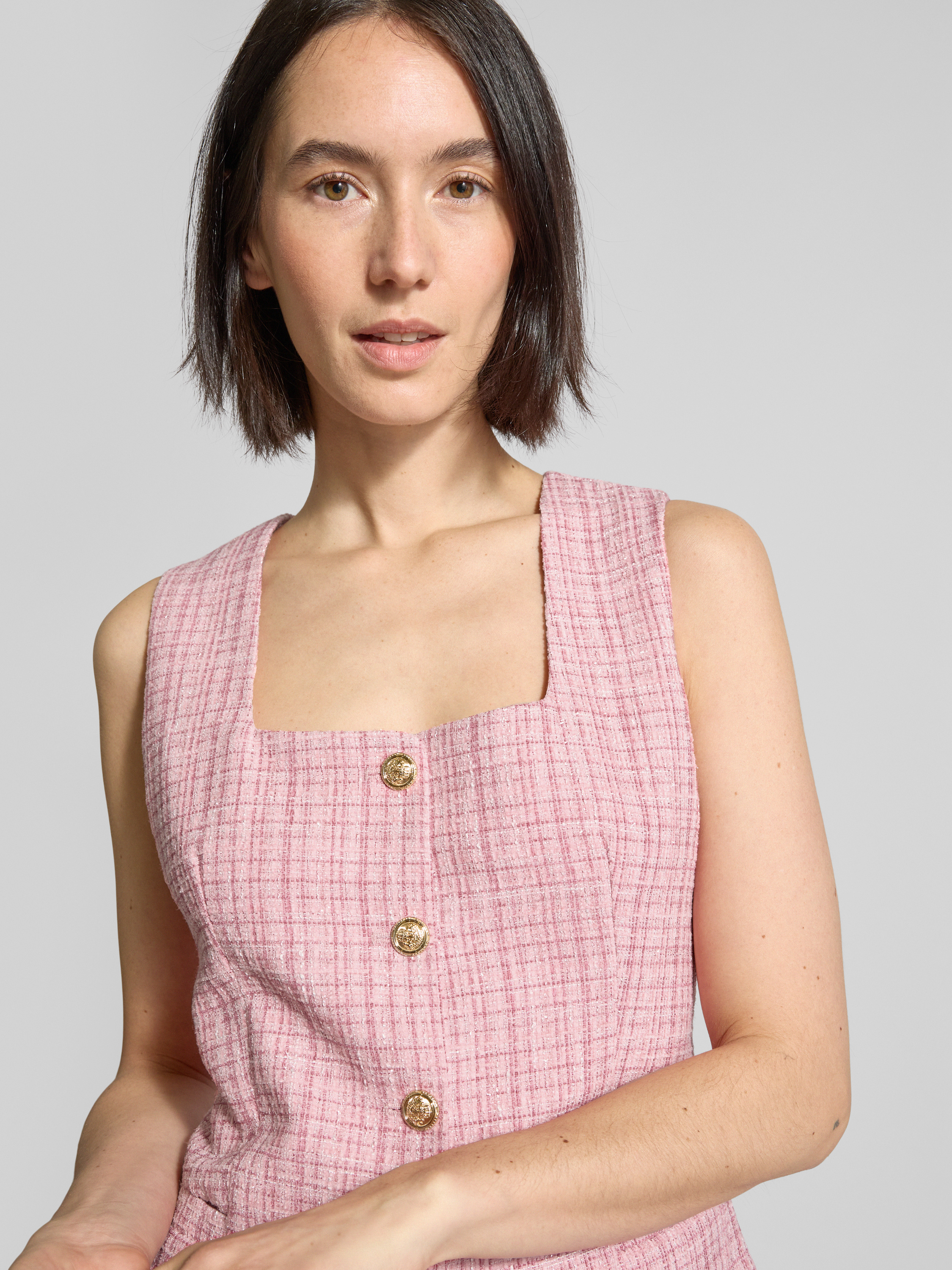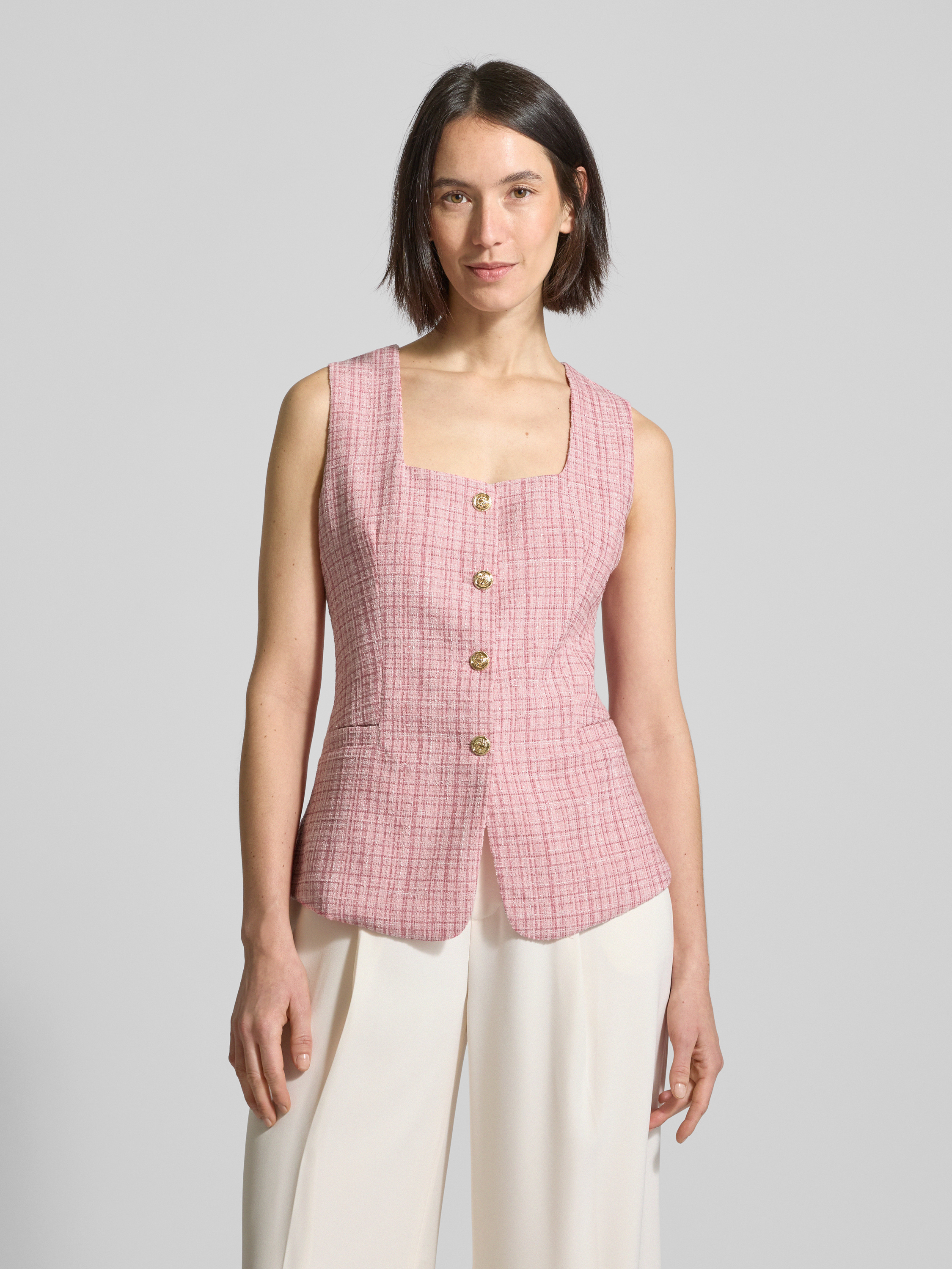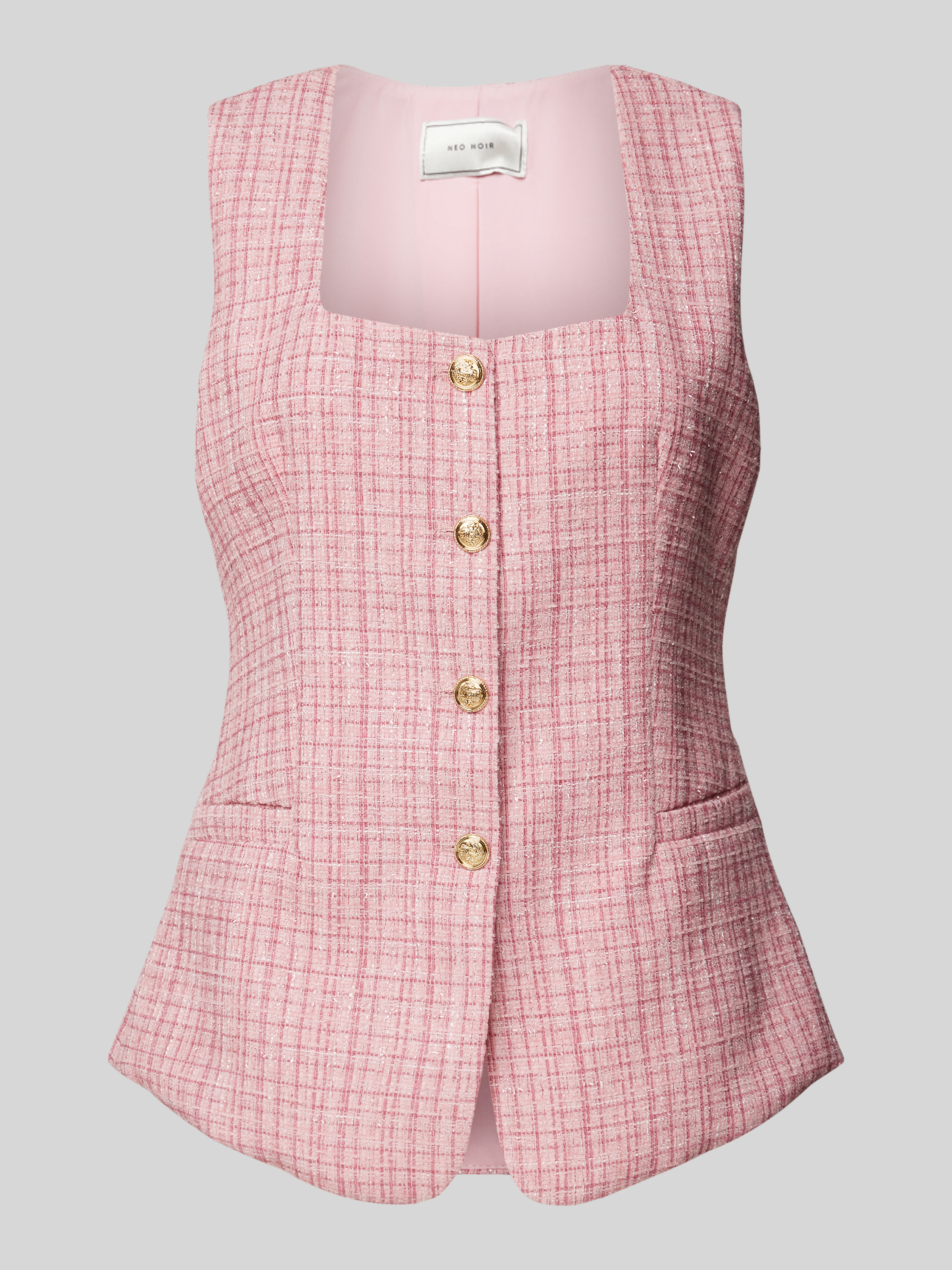 Die Weste von Neo Noir, Modell 'Perni', kombiniert einen eleganten Material-Mix mit einem taillierten Schnitt, der für eine schmeichelhafte Silhouette sorgt. Der Karree-Ausschnitt verleiht dem Design eine moderne Note, während die Leistentaschen praktische Funktionalität bieten. Diese vielseitige Weste eignet sich hervorragend für unterschiedliche Anlässe.