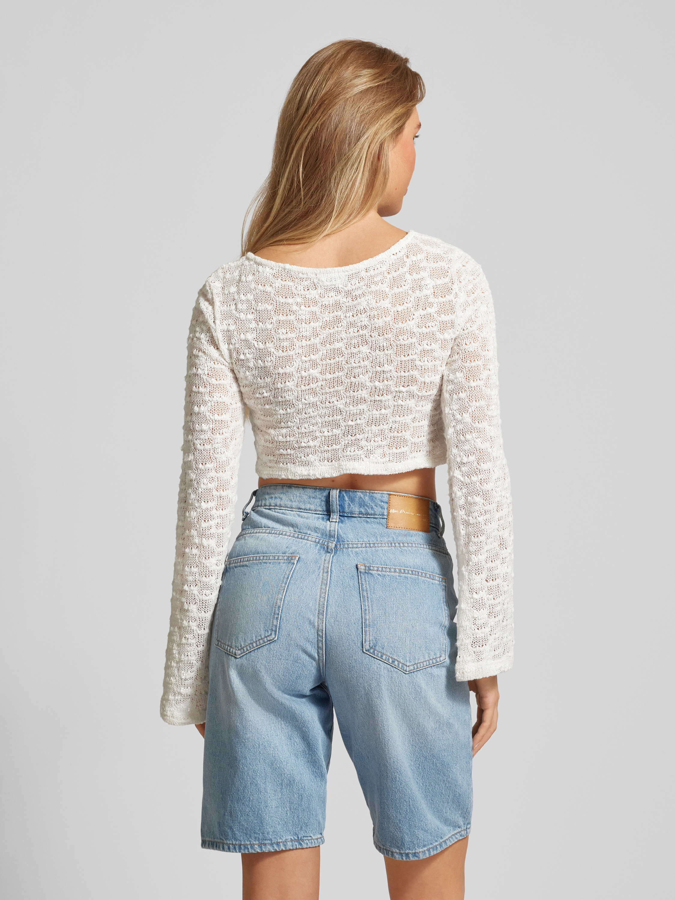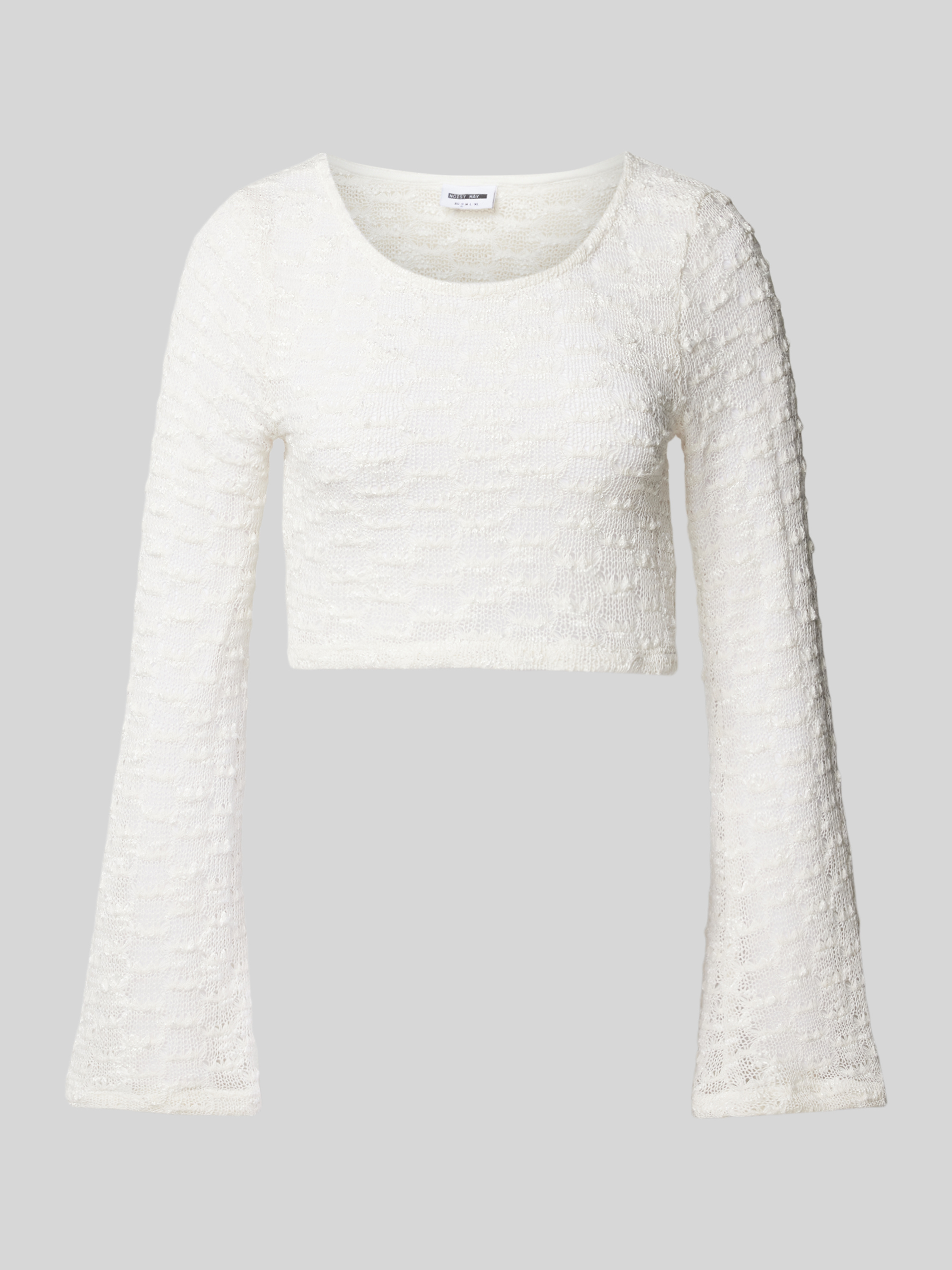 Das Cropped Longsleeve von Noisy may kombiniert einen modischen Material-Mix mit einem Viskose-Anteil, der für ein angenehmes Tragegefühl sorgt. Der Rundhalsausschnitt und die eleganten Trompetenärmel verleihen dem Oberteil eine stilvolle Note, während der Cropped-Schnitt vielseitig einsetzbar ist.