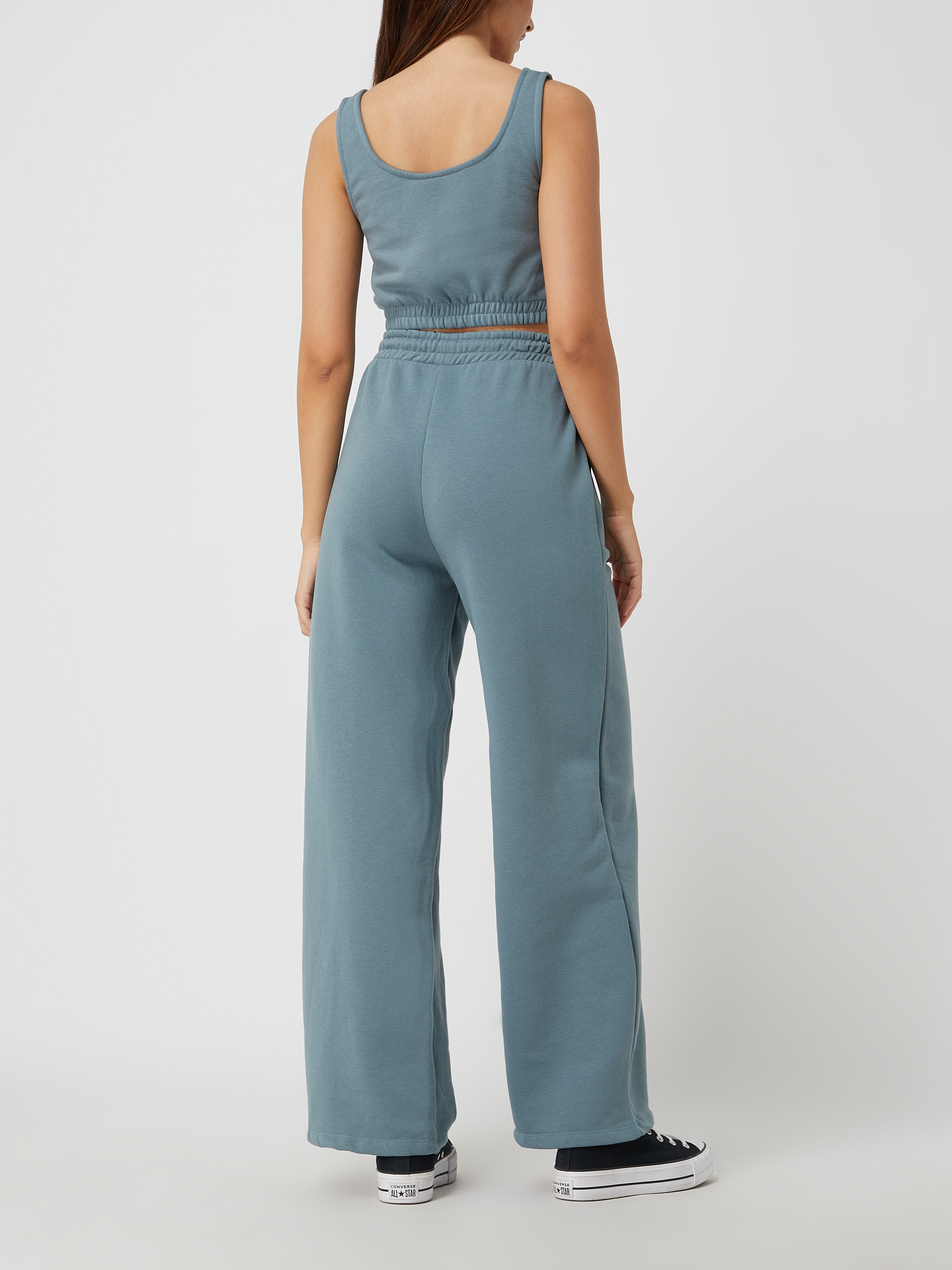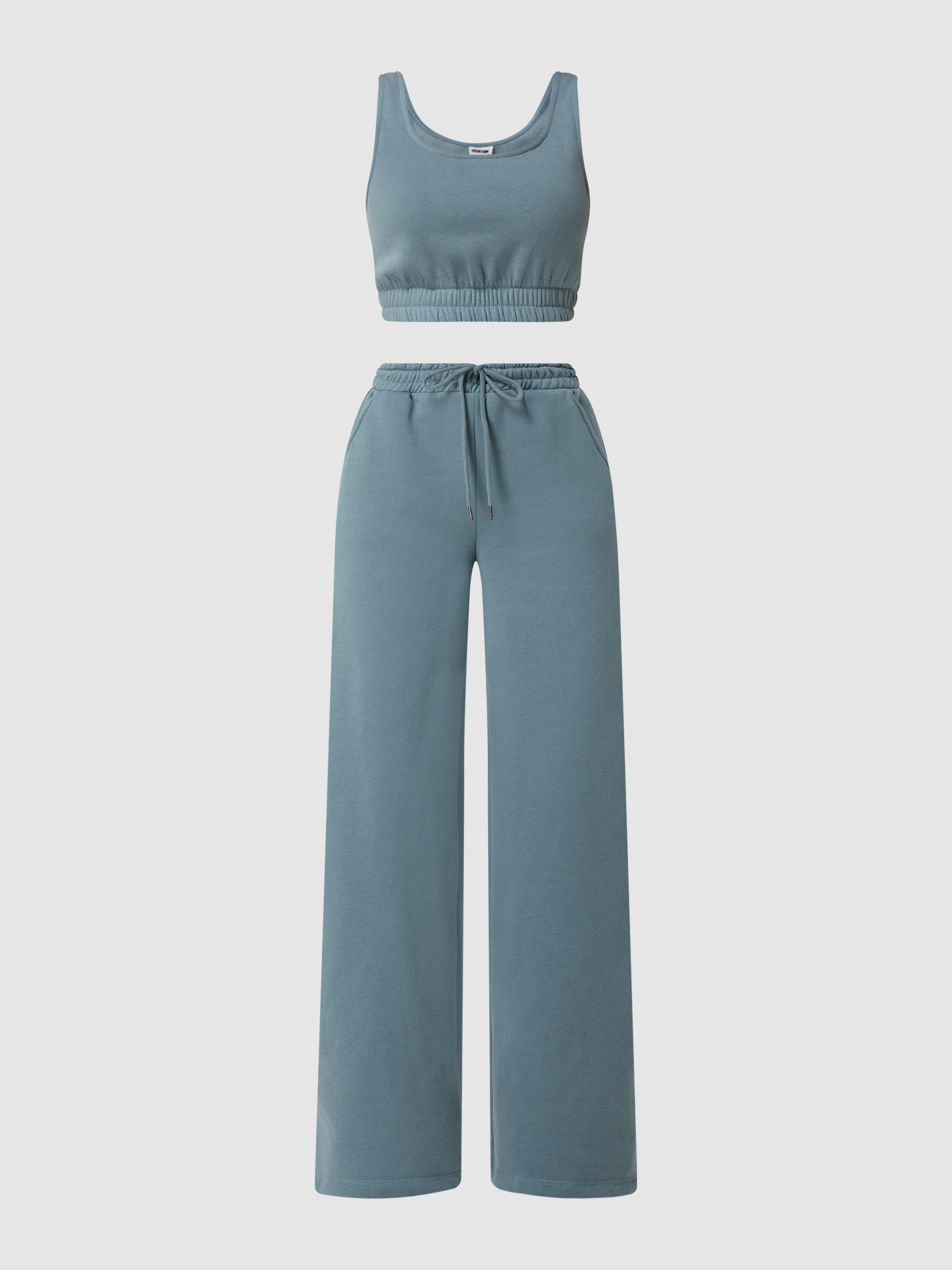 Die Loungewear von Noisy May ist aus einer Baumwollmischung gefertigt und locker geschnitten. Das Oberteil kommt mit Rundhalsausschnitt und elastischem Saum. Die Hose zeigt sich mit weitem Bein und elastischem Bund.