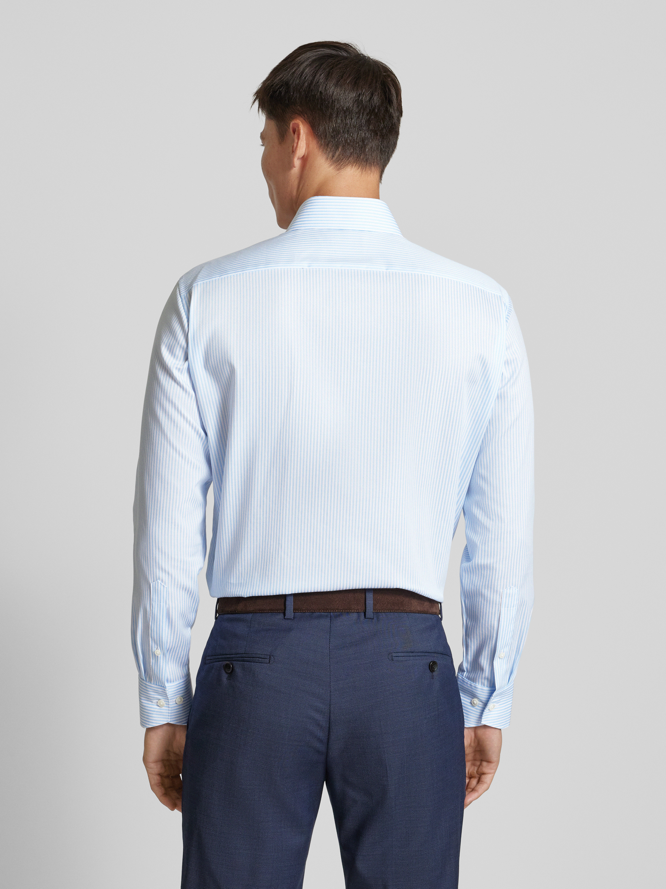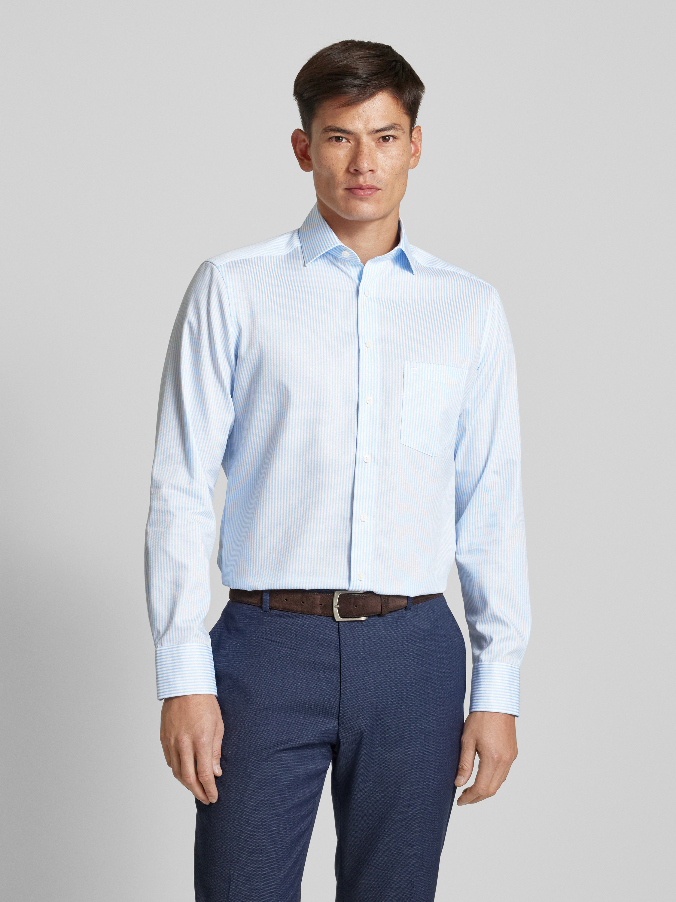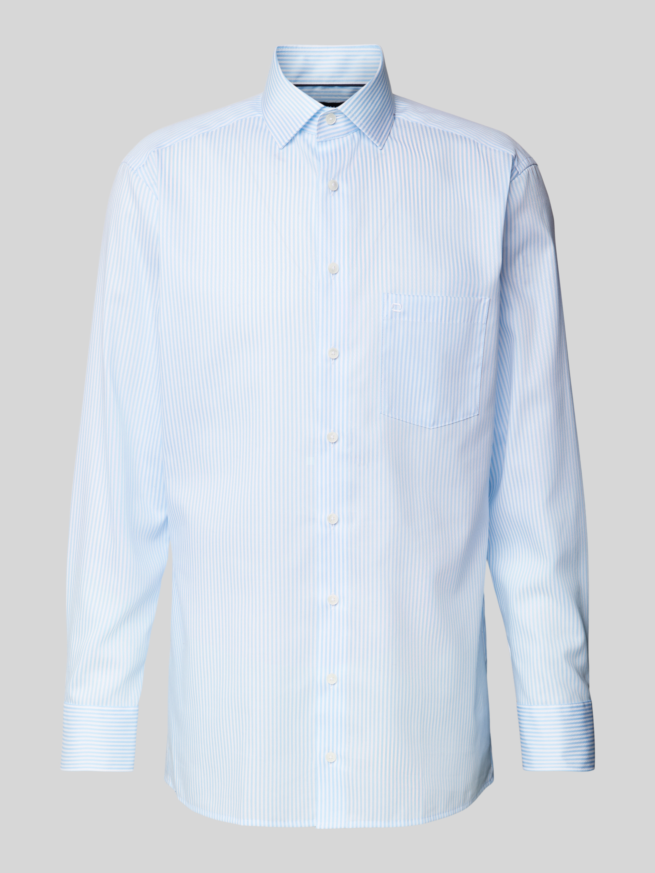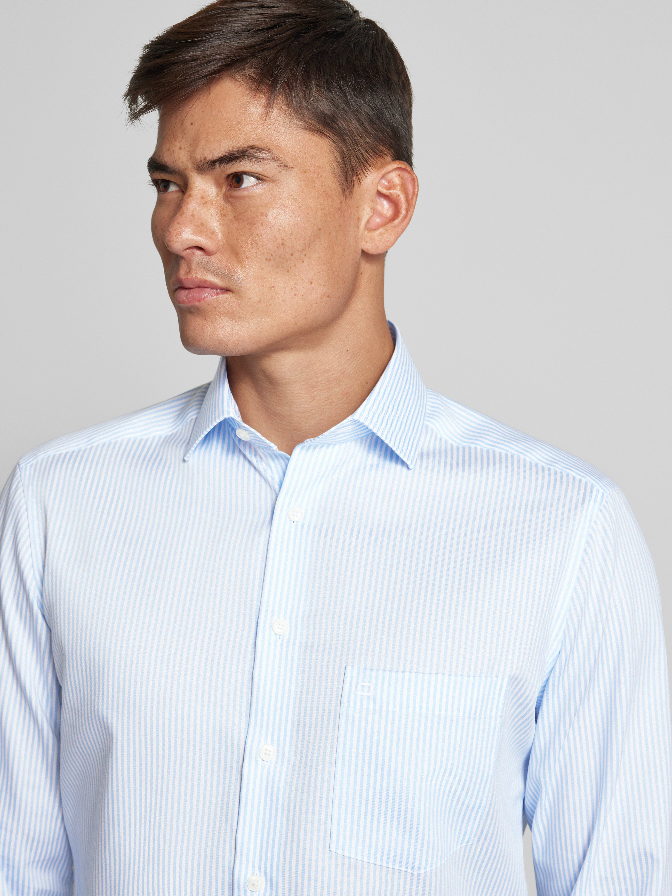 Das Herrenhemd von OLYMP im Regular Fit zeigt sich mit gestreiftem Allover-Muster und klassischem Kentkragen. Dank reiner Baumwolle fühlt sich das Modell angenehm auf der Haut an und bleibt bügelfrei. Die aufgesetzte Brusttasche ergänzt das Hemd um einen praktischen Akzent.