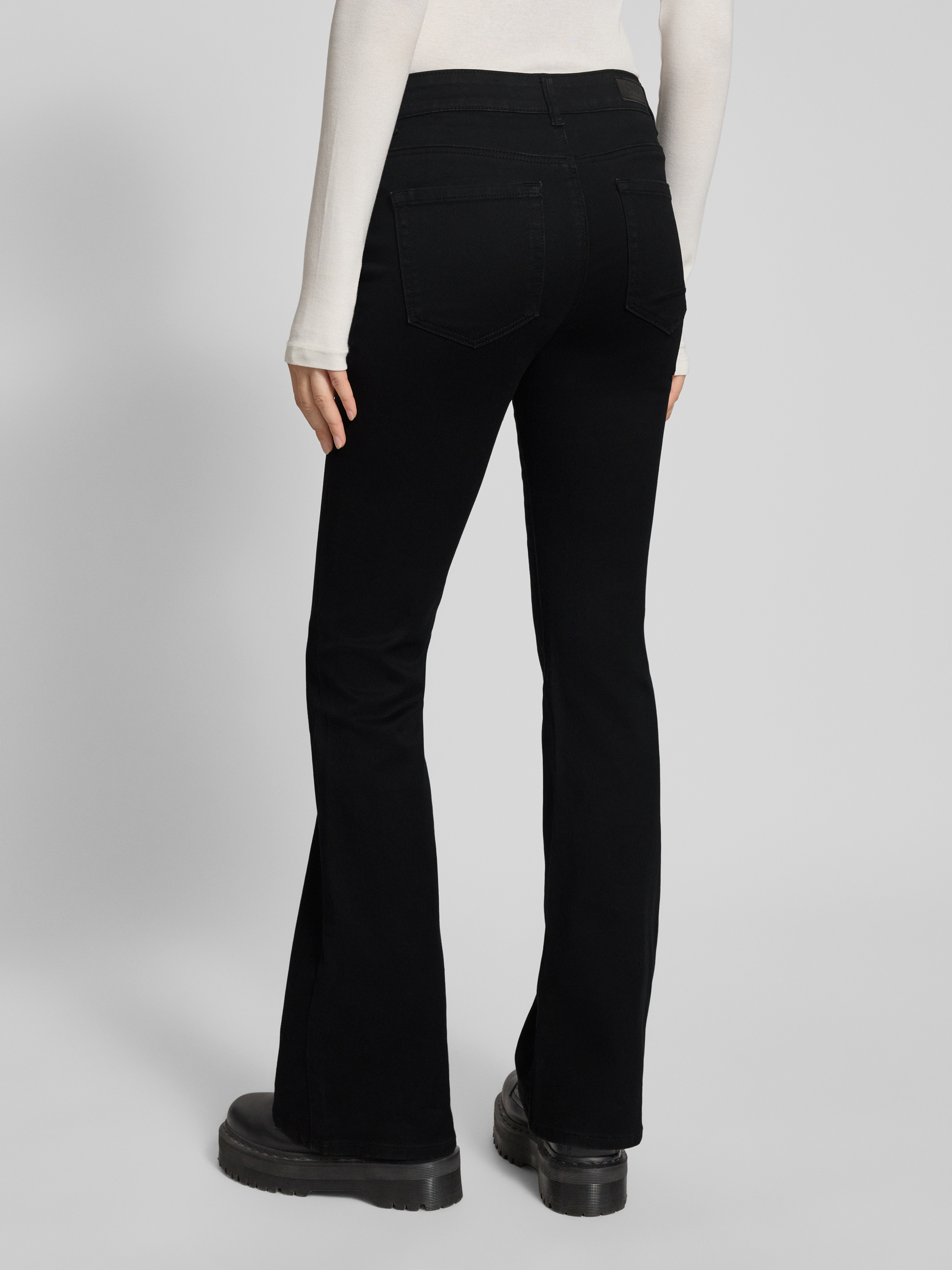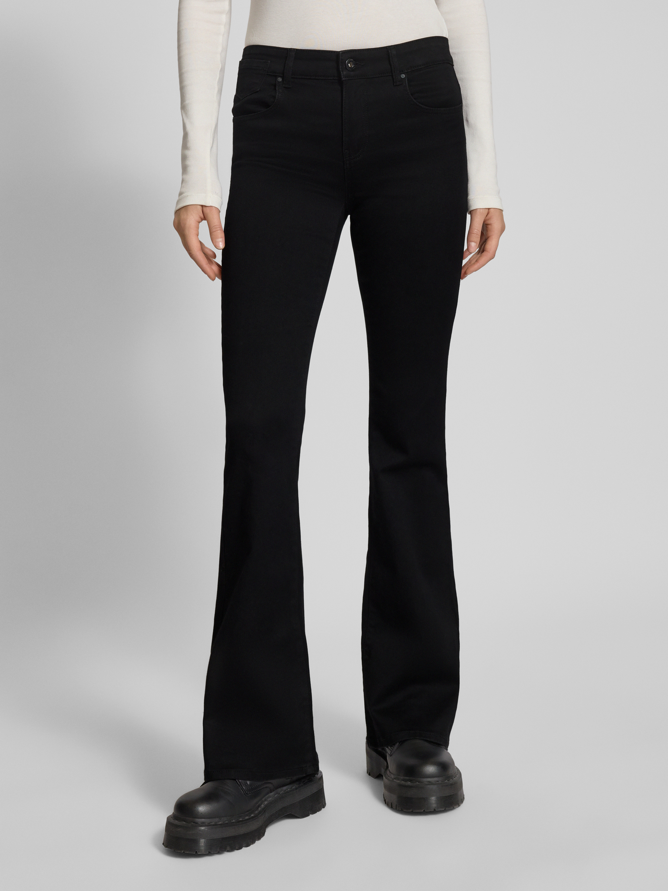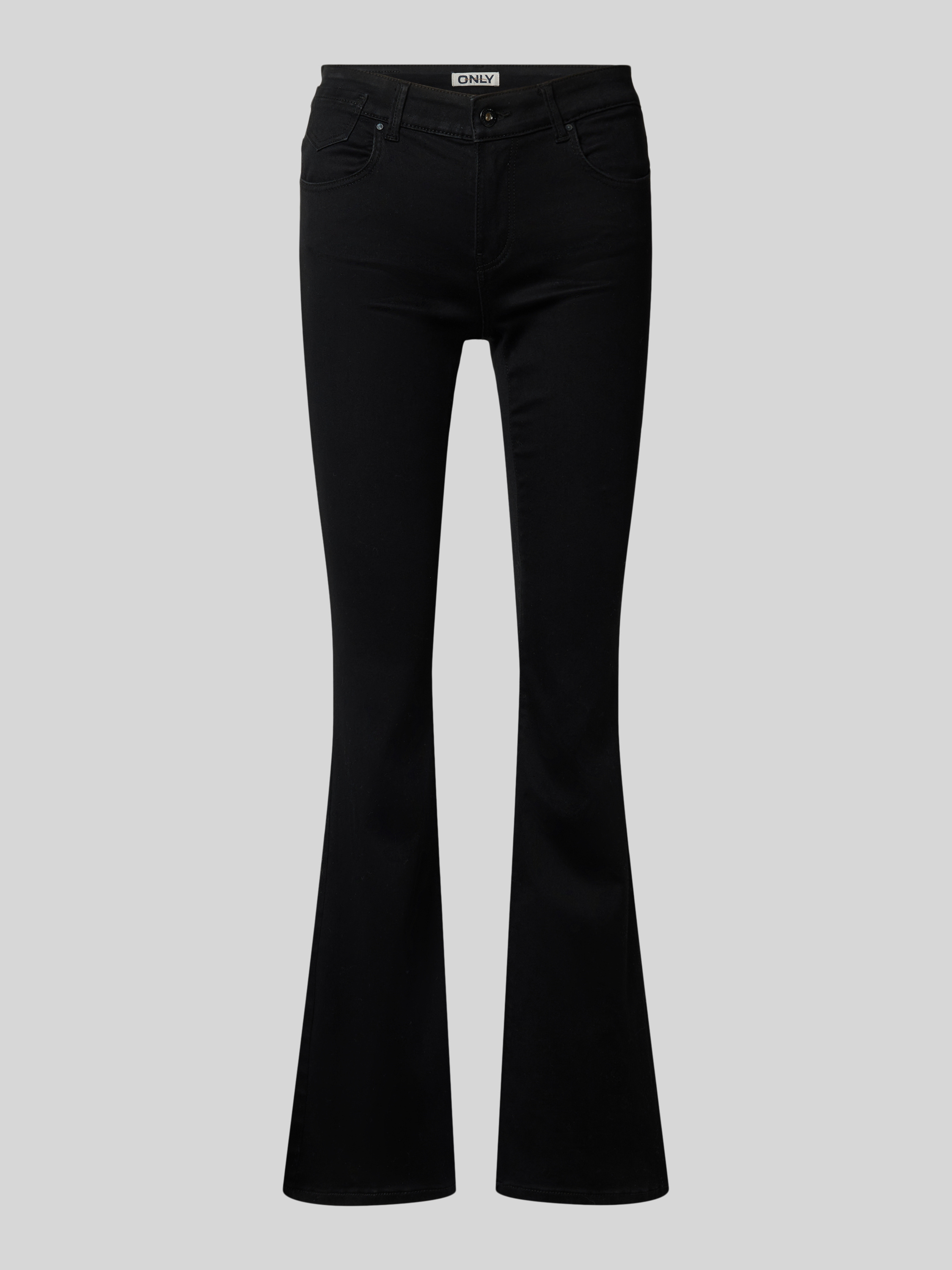Die Damen Bootcut Jeans von Only, Modell 'Reese', überzeugt durch ihre ausgestellte Passform und einen leichten Retro-Flair. Dank dem Baumwoll-Mix fühlt sich das Denim angenehm auf der Haut an, was ein komfortables Tragegefühl im Alltag unterstützt. Dezente Nieten und Kontrastnähte setzen unaufdringliche Akzente und ergänzen das unifarbene Design.