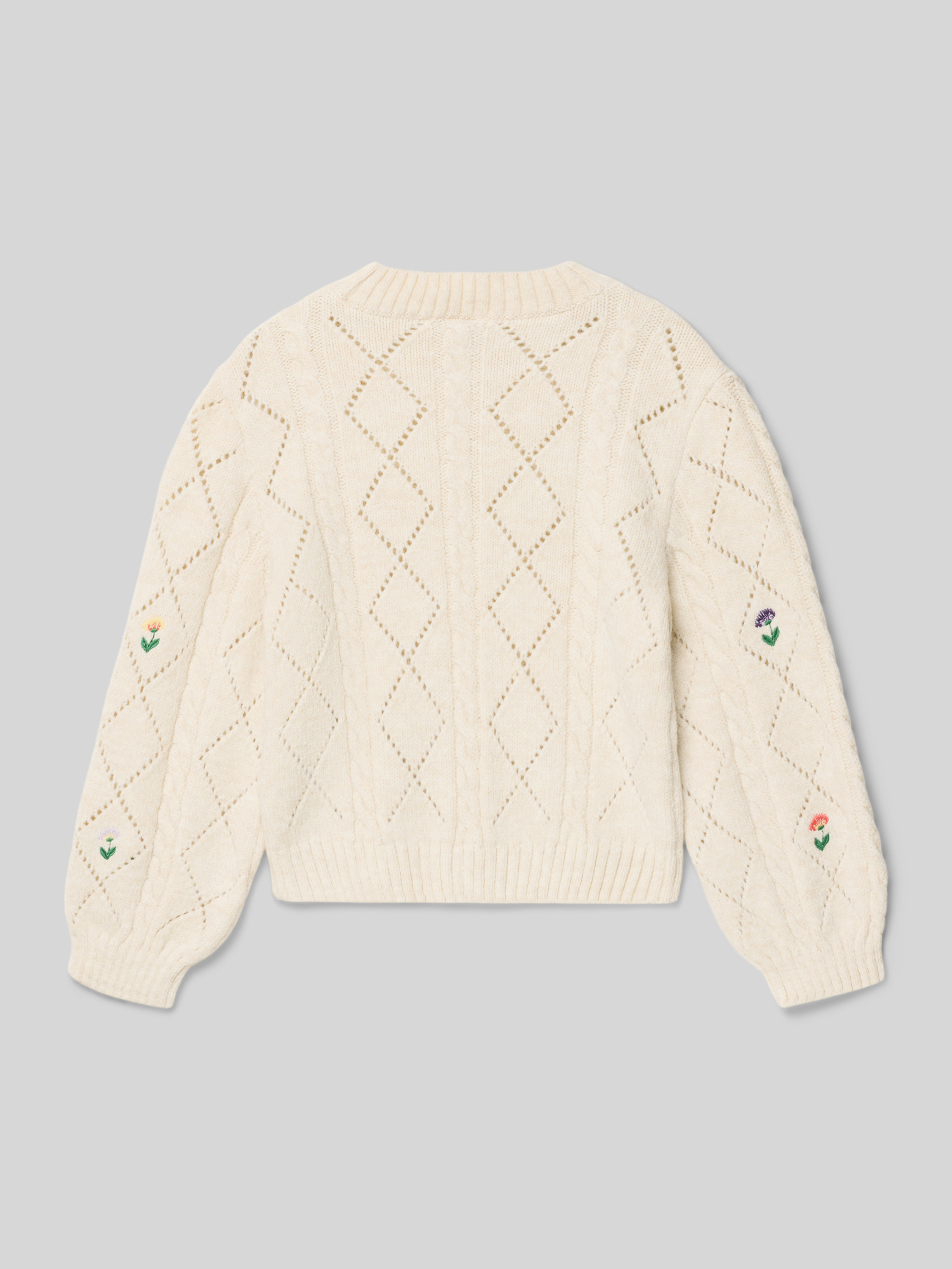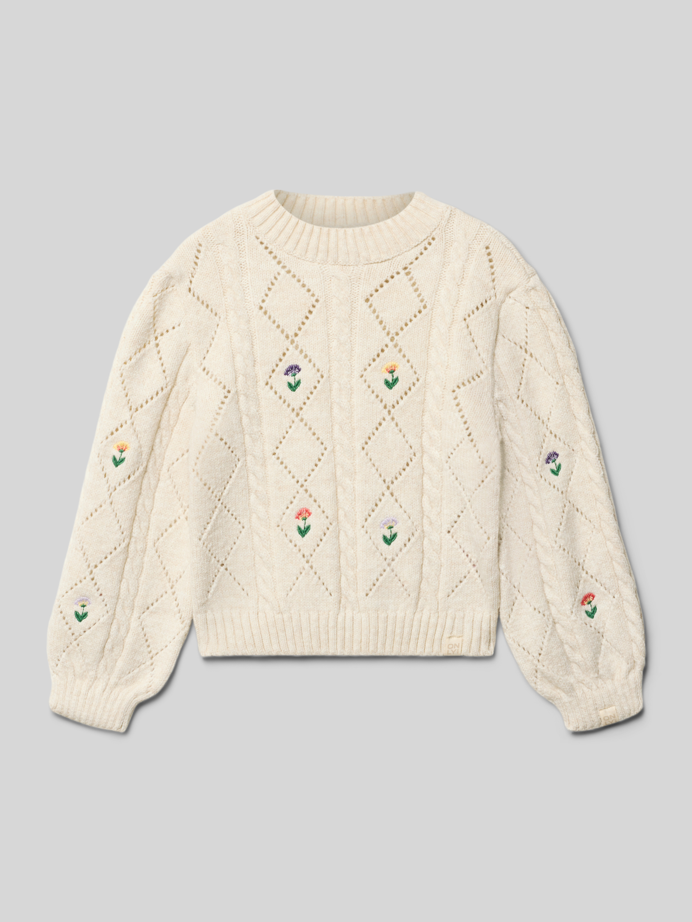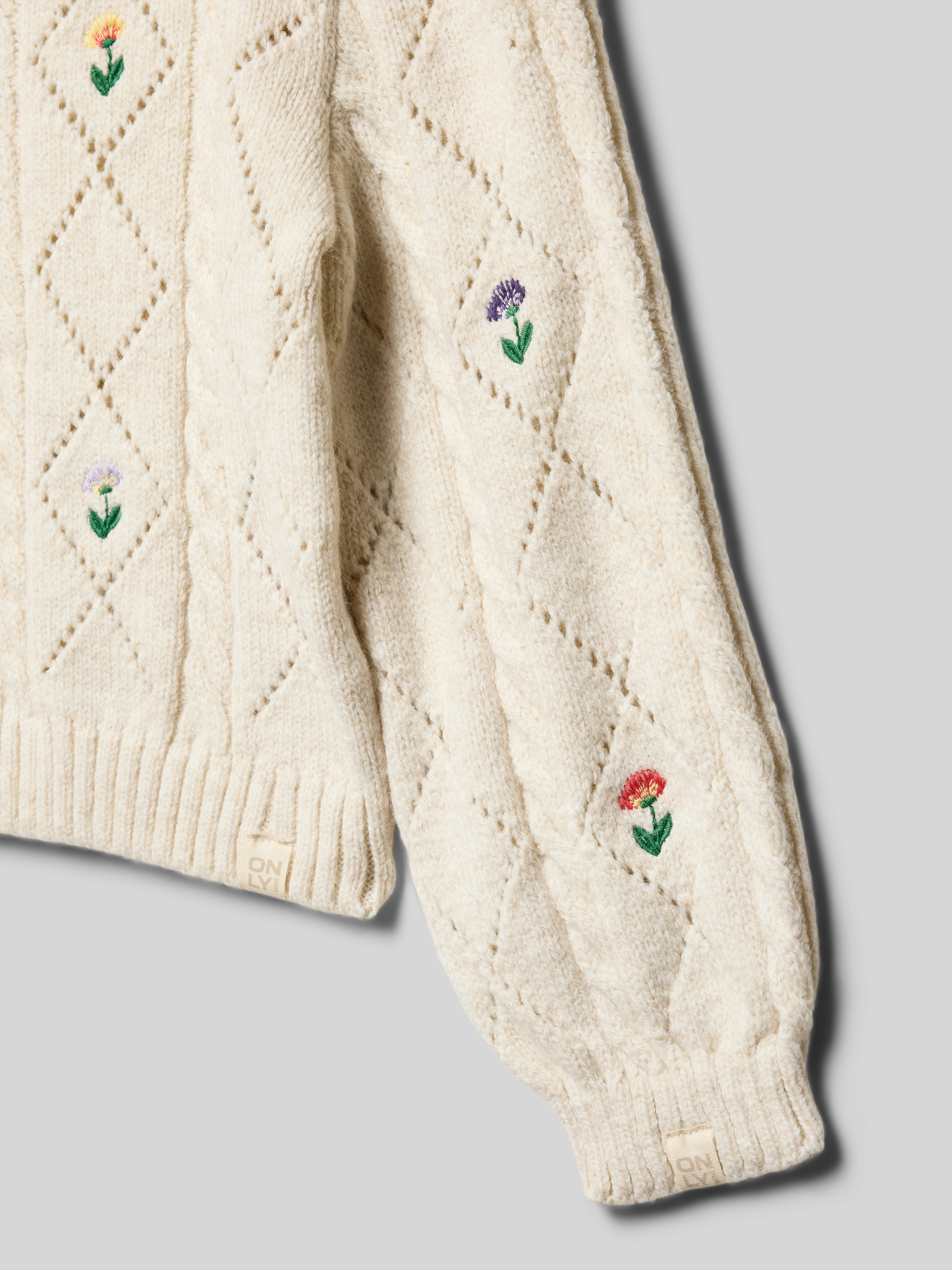 Der Regular Fit Strickpullover von Only, Modell 'Flower', zeigt sich in strukturierter Lochstrick-Optik und sorgt durch das Motiv-Stitching für dezente Abwechslung. Dank der lockeren Passform sitzt er angenehm und lässt Bewegungsfreiheit zu. Der klassische Rundhalsausschnitt macht das Anziehen unkompliziert.
