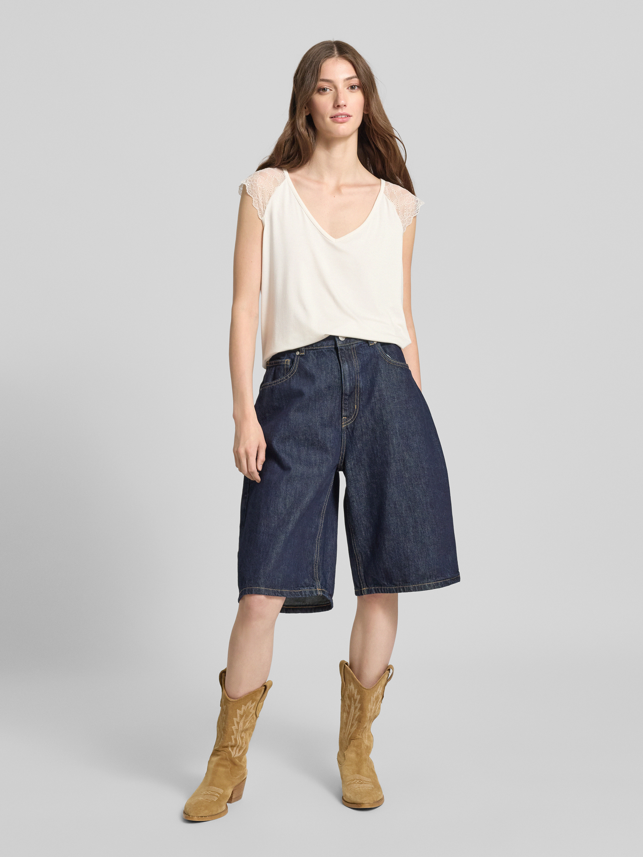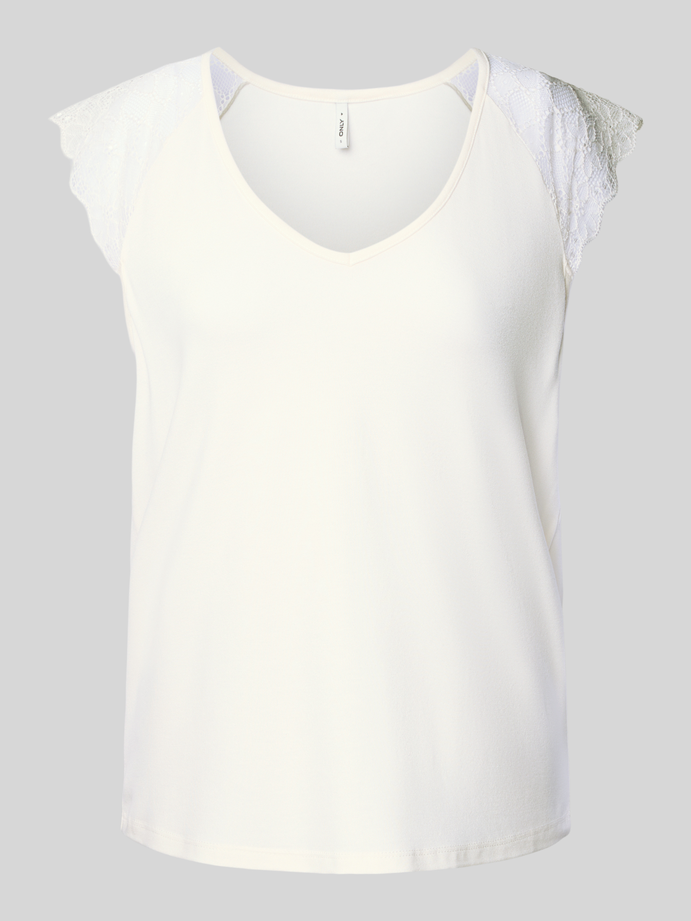 Das Regular Fit T-Shirt Modell 'Petra' von Only bietet durch seine unifarbene Optik vielseitige Kombinationsmöglichkeiten und punktet mit einem femininen V-Ausschnitt. Kappärmel in Spitzenoptik verleihen ihm einen besonderen Charme, während der Viskose-Elasthan-Mix für angenehmen Tragekomfort sorgt. Ein idealer Begleiter für viele Gelegenheiten.