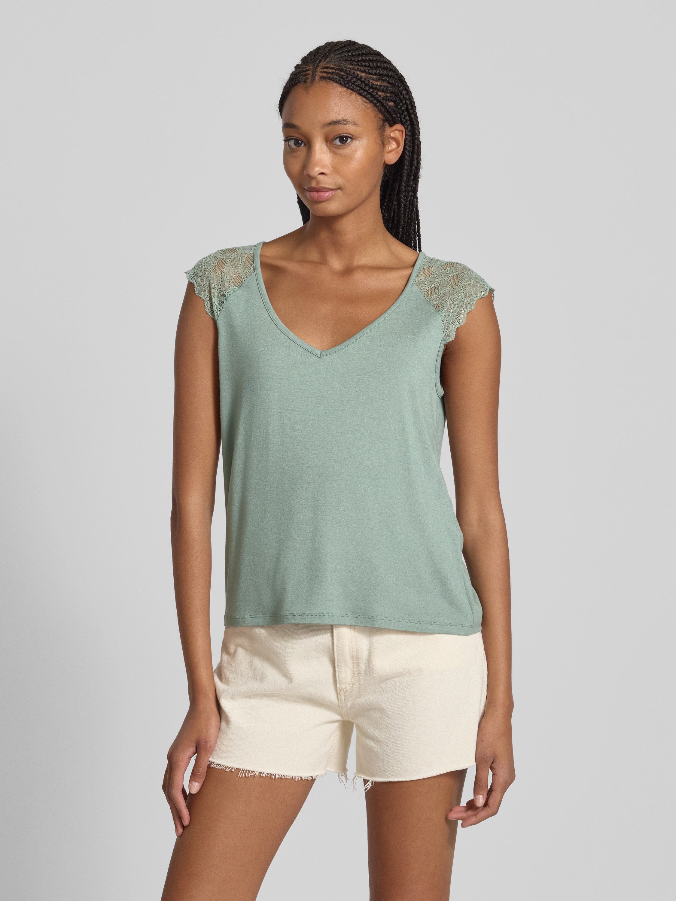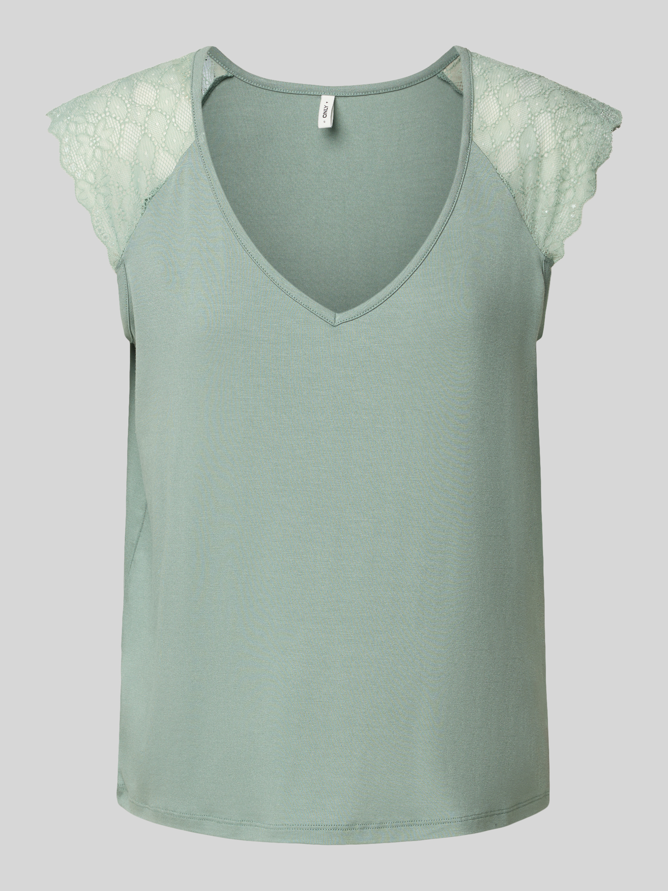 Das Regular Fit T-Shirt Modell 'Petra' von Only bietet durch seine unifarbene Optik vielseitige Kombinationsmöglichkeiten und punktet mit einem femininen V-Ausschnitt. Kappärmel in Spitzenoptik verleihen ihm einen besonderen Charme, während der Viskose-Elasthan-Mix für angenehmen Tragekomfort sorgt. Ein idealer Begleiter für viele Gelegenheiten.
