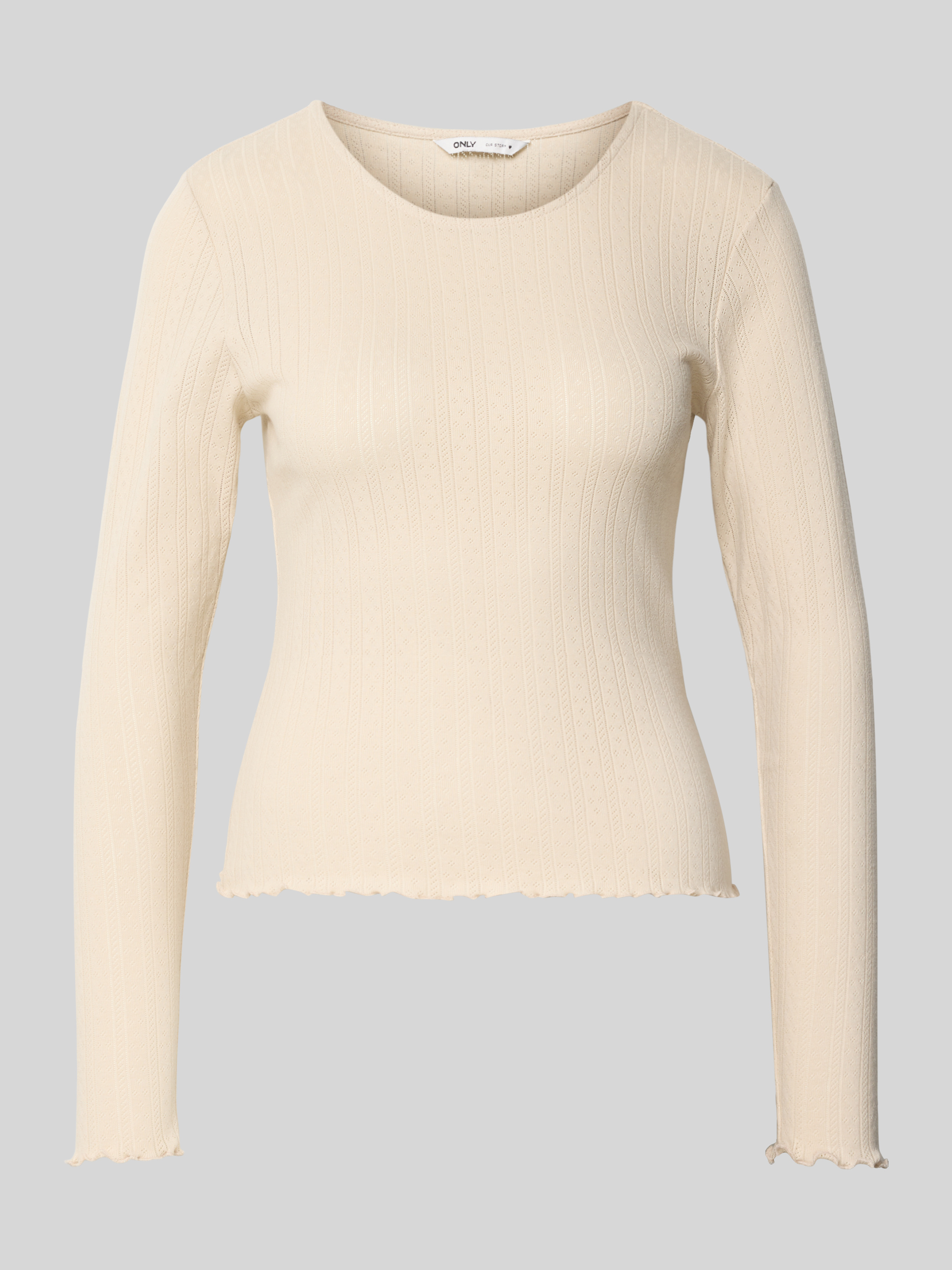 Das Damen Slim Fit Langarmshirt Carlotta von Only liegt angenehm auf der Haut und bringt durch das feine Lochmuster dezente Akzente ins Outfit. Reine Baumwolle sorgt für ein weiches Tragegefühl, während Frill-Details am Abschluss dem Look eine verspielte Note verleihen.