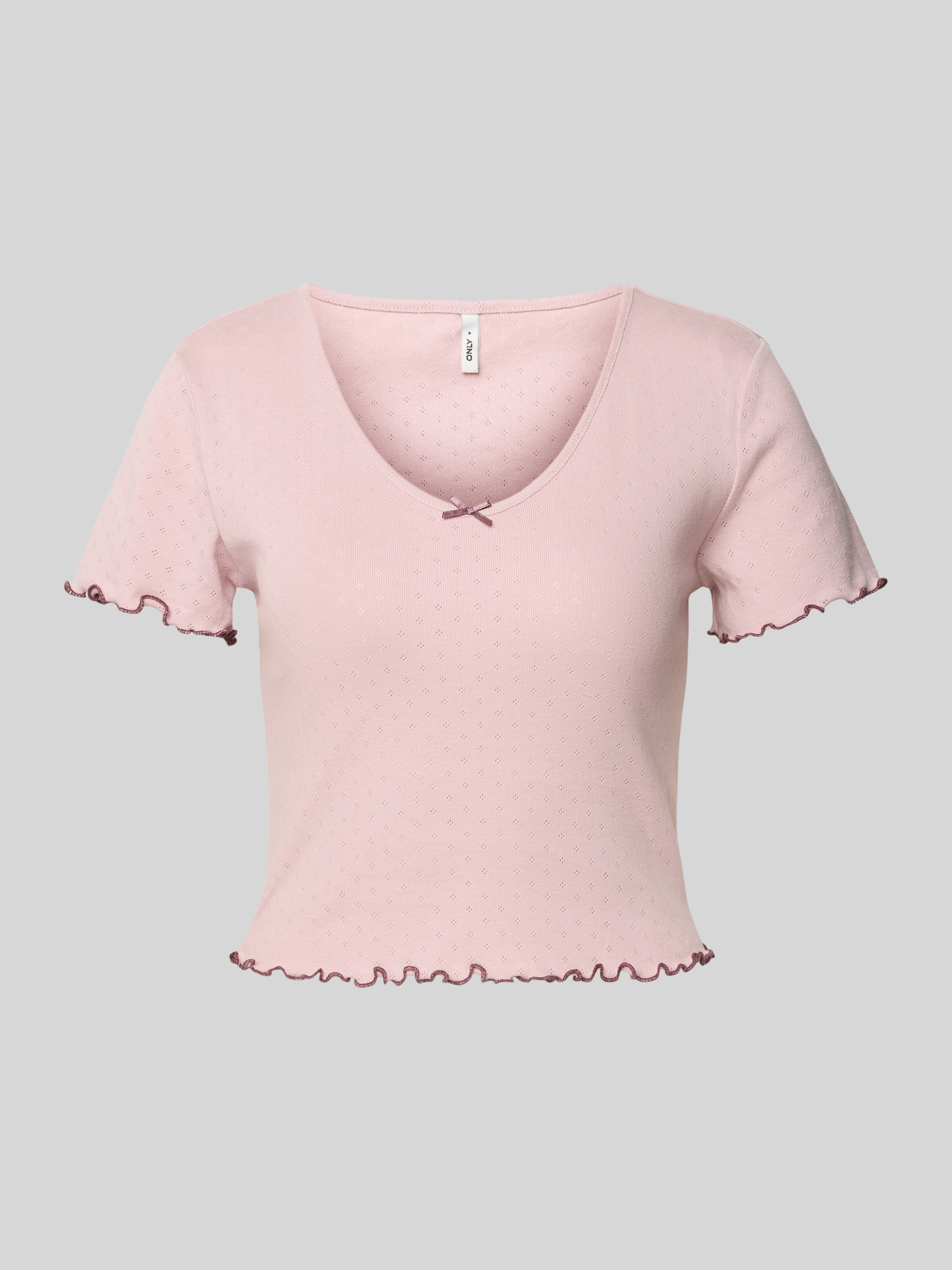 Das Damen Slim Fit T-Shirt von Only, Modell Carlotta, schmiegt sich angenehm an die Silhouette und bringt durch den V-Ausschnitt sowie die Schleifenapplikation dezente Akzente ins Outfit. Der Baumwoll-Mix fühlt sich weich an und sorgt für ein leichtes Tragegefühl. Kurze Ärmel und Frill-Abschlüsse lockern das Design auf.