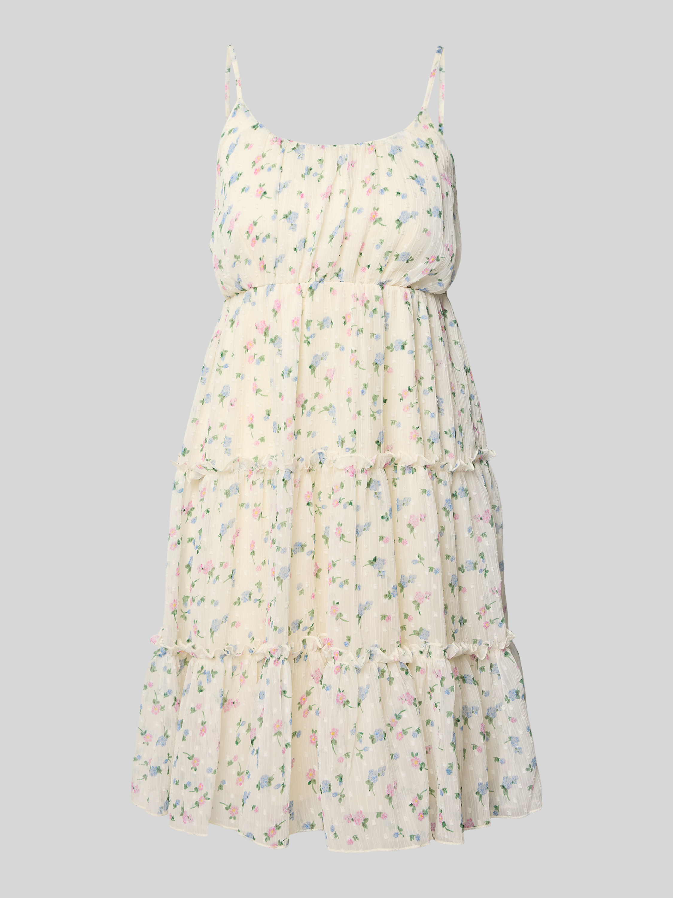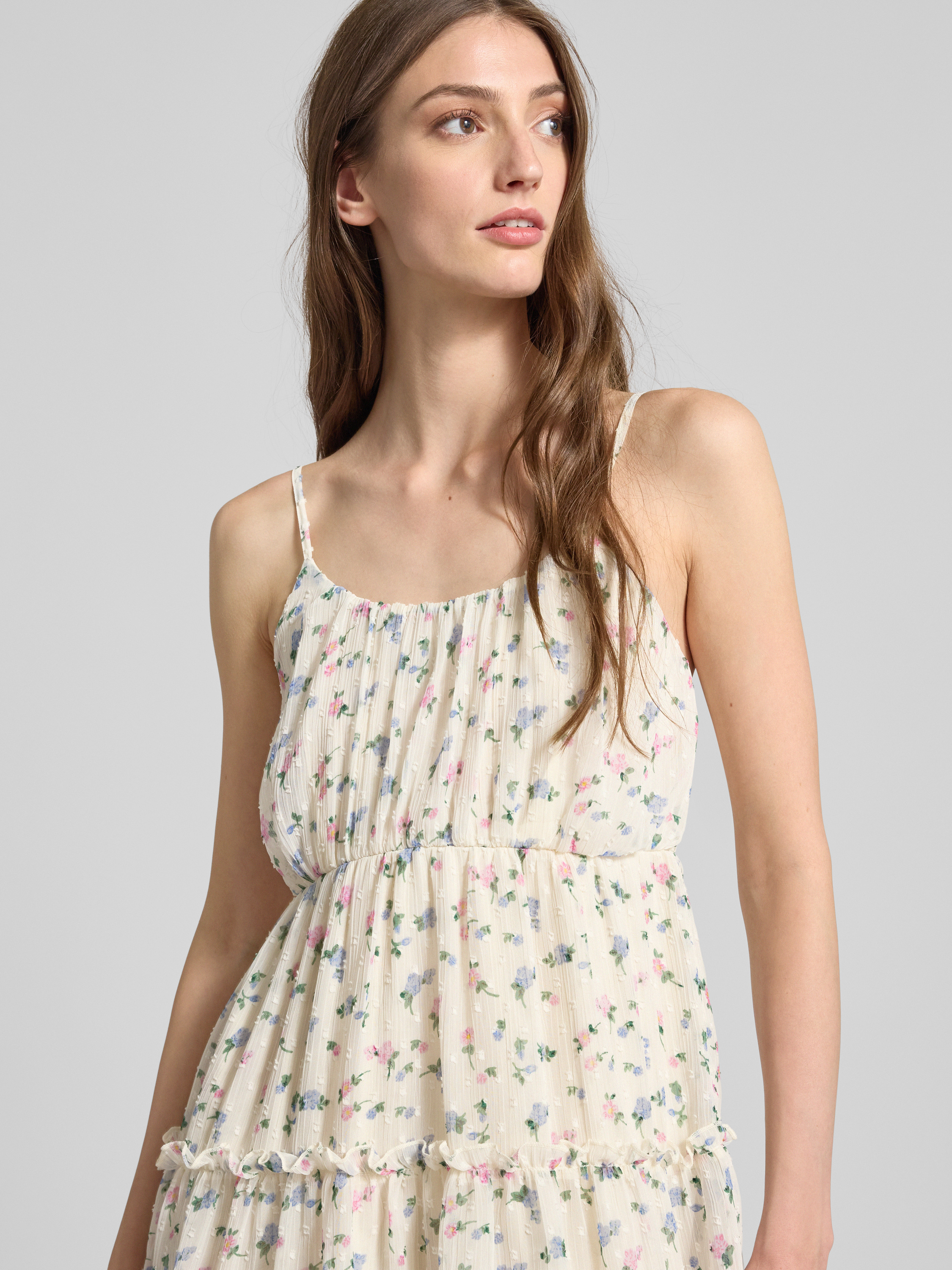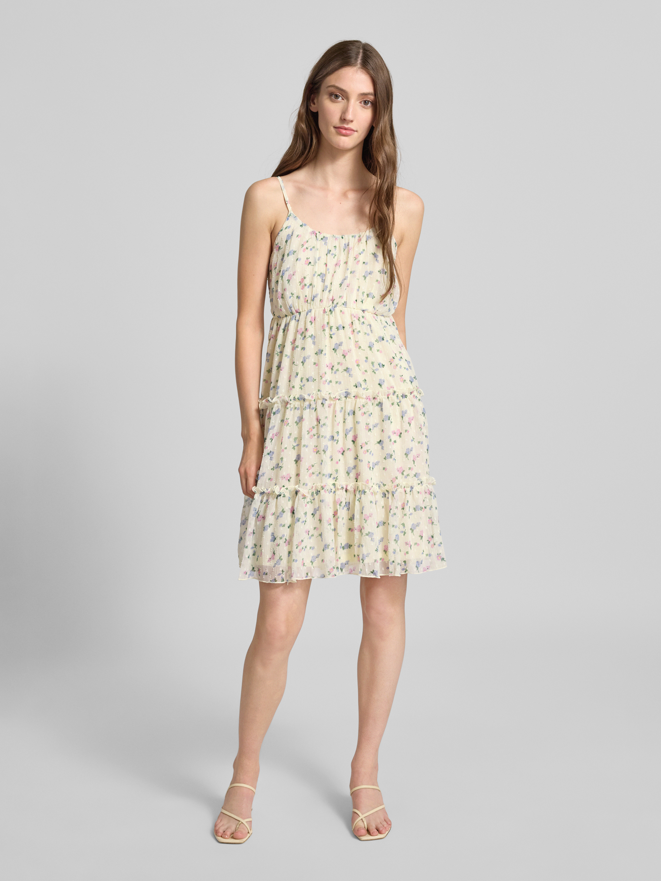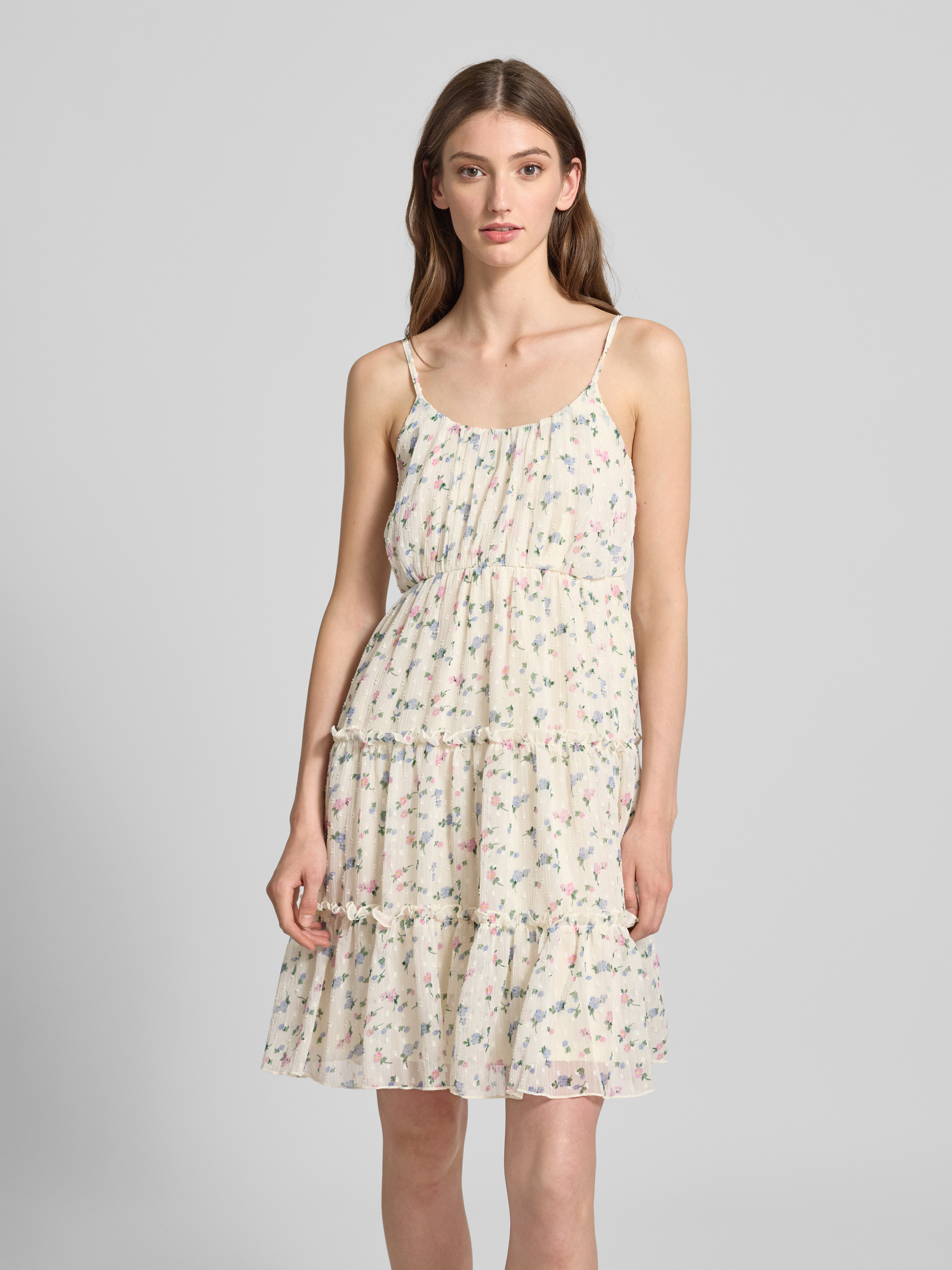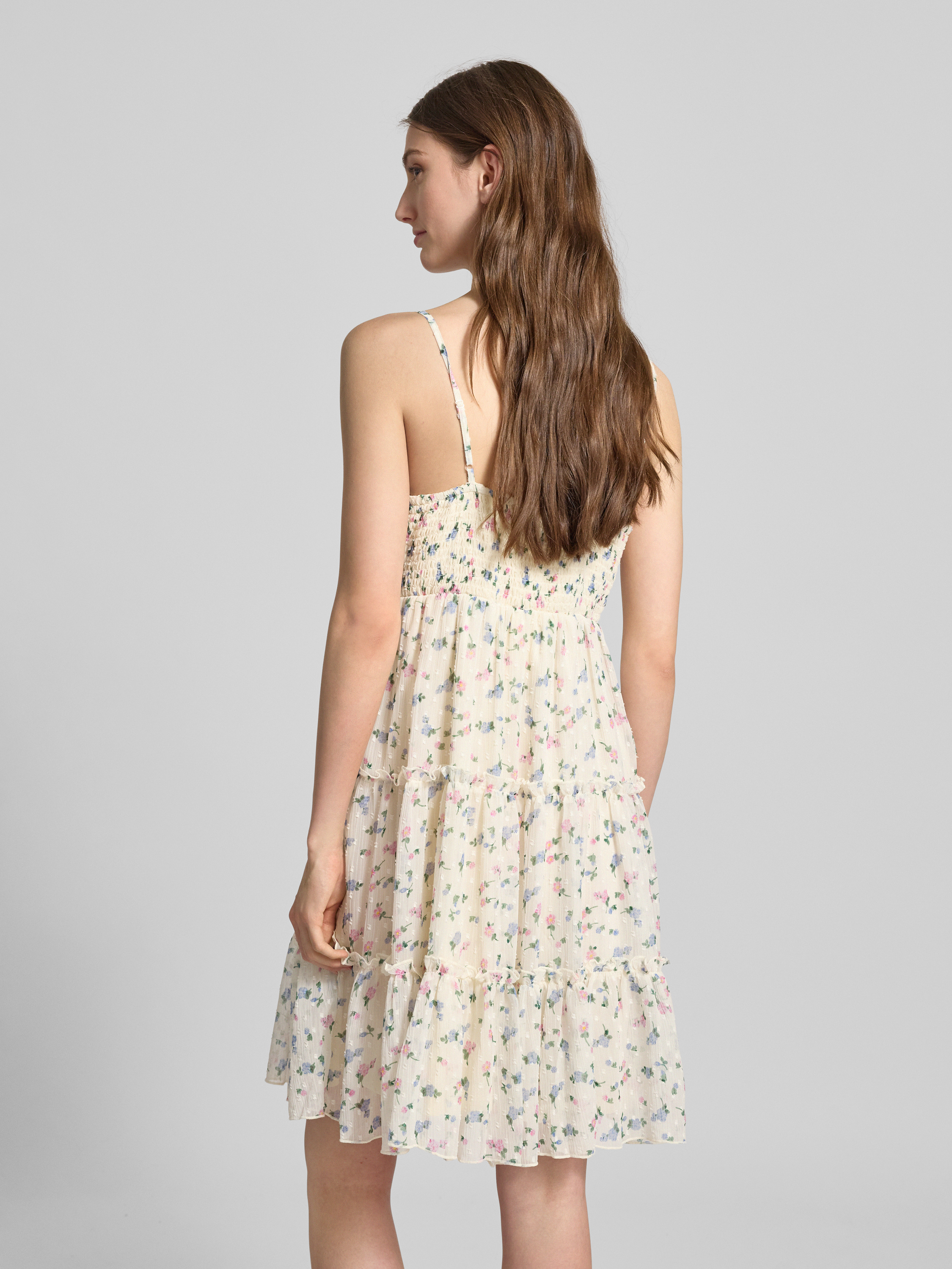Das taillierte Minikleid 'Dina' von Only kombiniert ein verspieltes Allover-Muster mit einem schmeichelhaften Schnitt. Der gesmokte Brustbereich und die Raffung sorgen für eine feminine Silhouette, während der Volant am Rumpfabschluss eine leichte Note verleiht. Chiffon verleiht dem Kleid eine luftige Leichtigkeit.