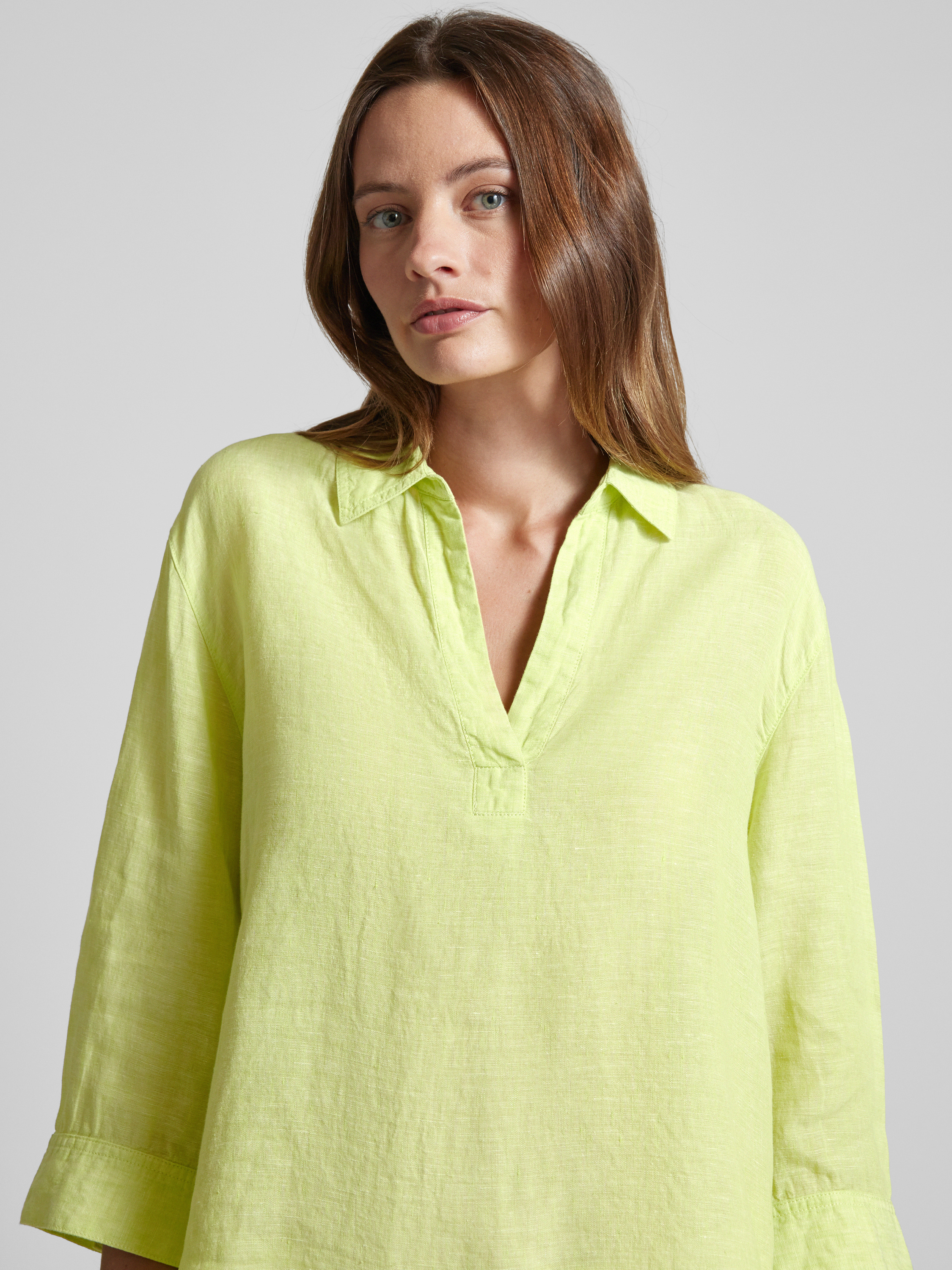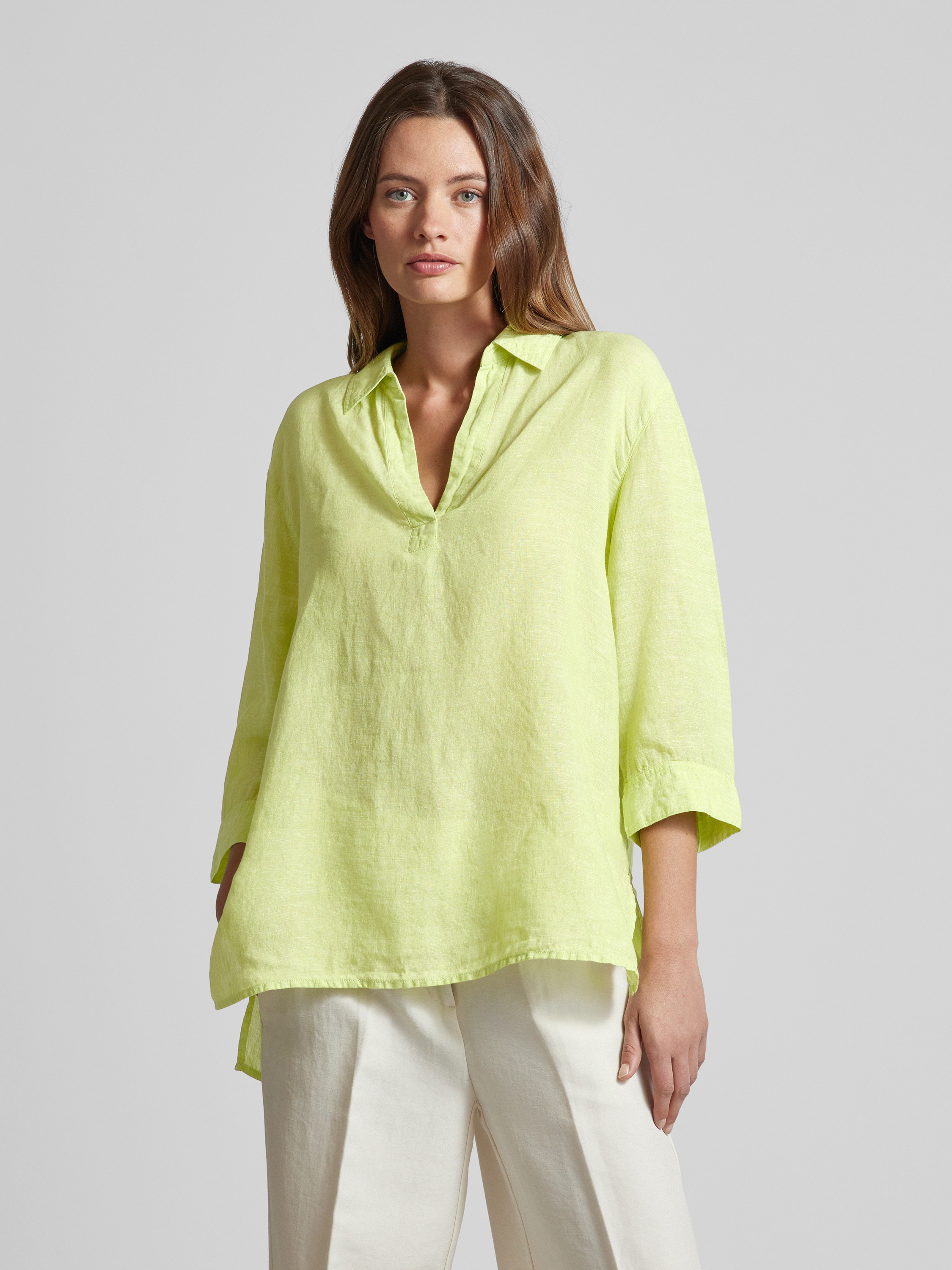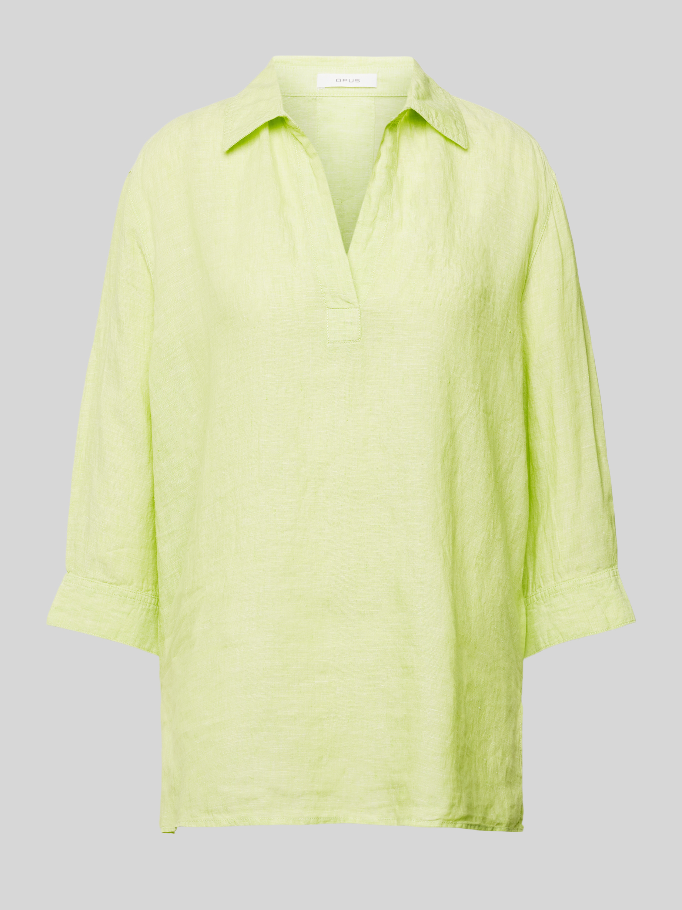 Das OPUS Blusenshirt 'Fengani' aus reinem Leinen überzeugt durch seine luftige Loose Fit-Passform und den eleganten V-Ausschnitt. Der Hemdblusenkragen sowie die 3/4-Ärmel machen es vielseitig einsetzbar. Das unifarbene Design ergänzt mühelos jede Garderobe.