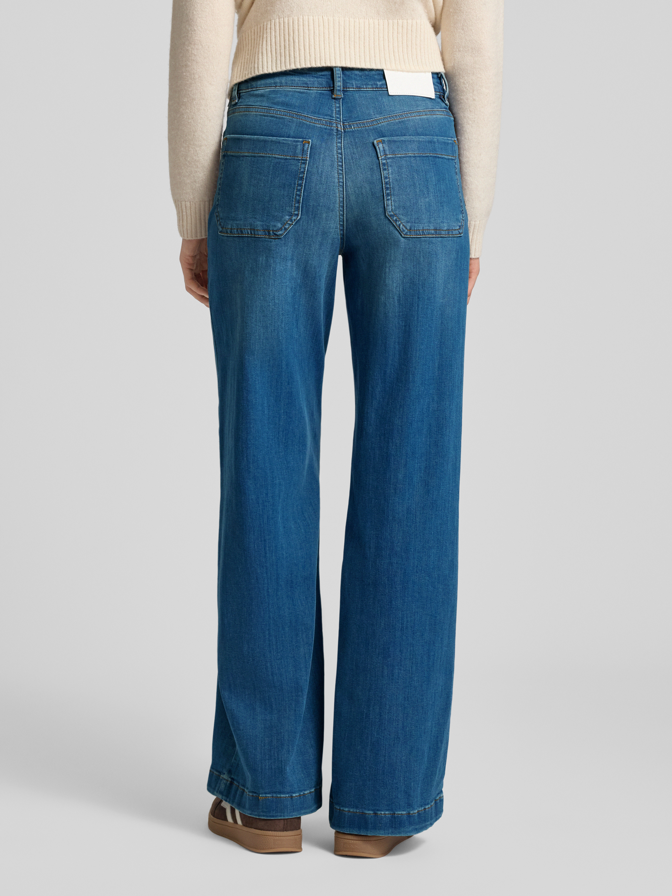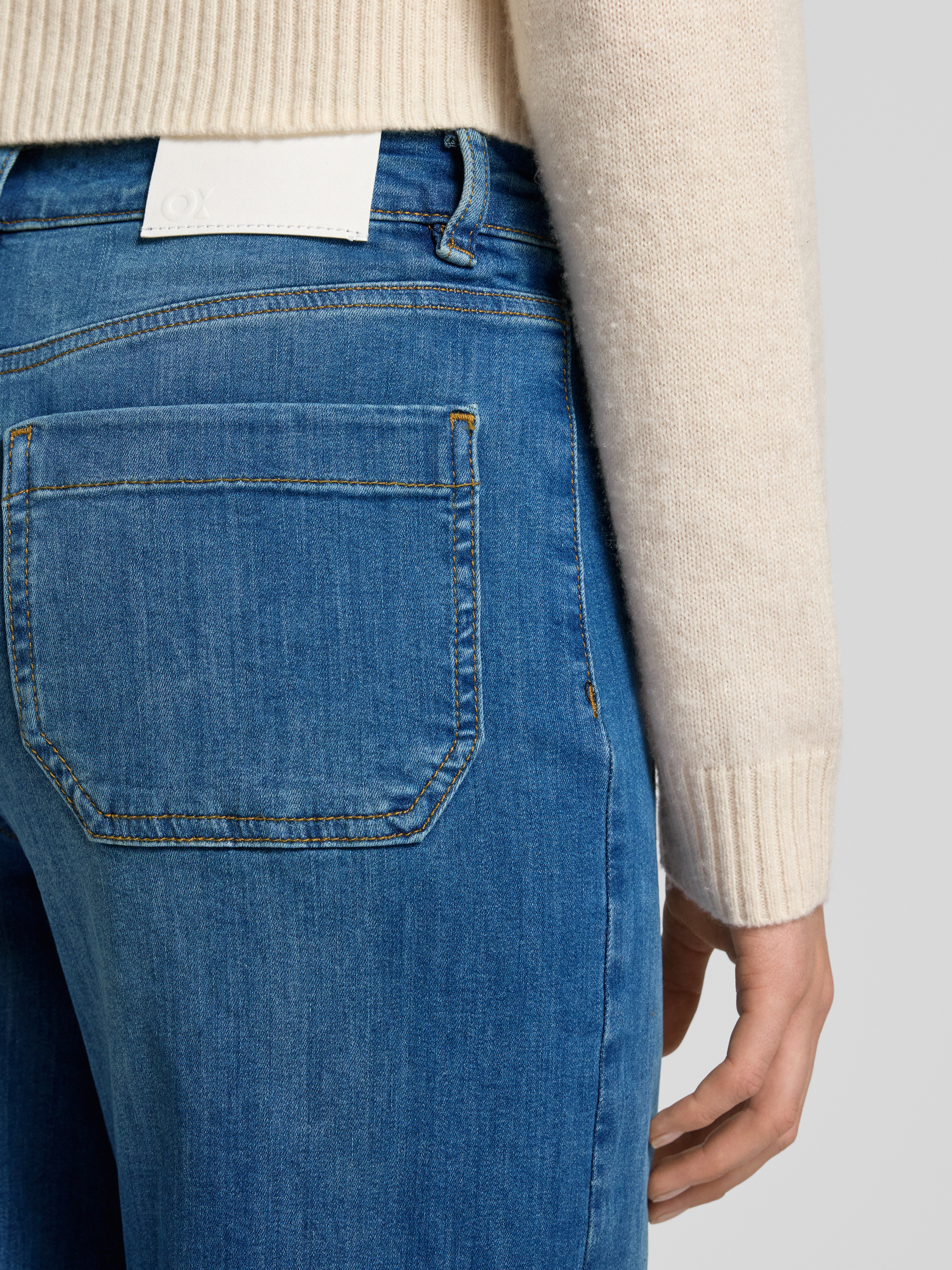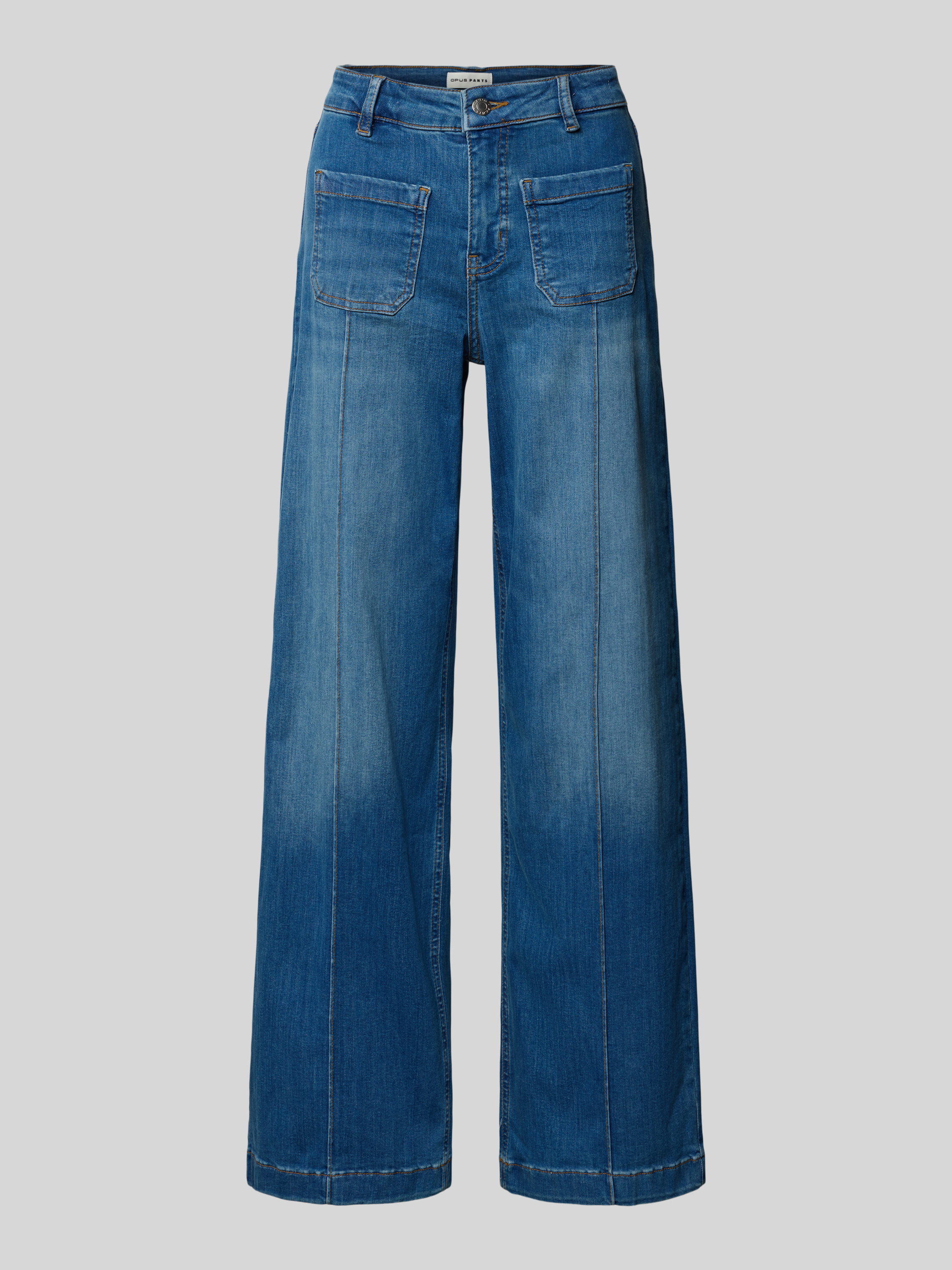 Die Damen Jeans von OPUS PANTS, Modell Melly Groove, fällt durch ihr weites Bein und markante Längsnähte auf. Dank des soften Baumwoll-Mix mit Modal-Anteil liegt sie angenehm auf der Haut. Die aufgesetzten Taschen und der dezente Used-Look runden das Gesamtbild ab.