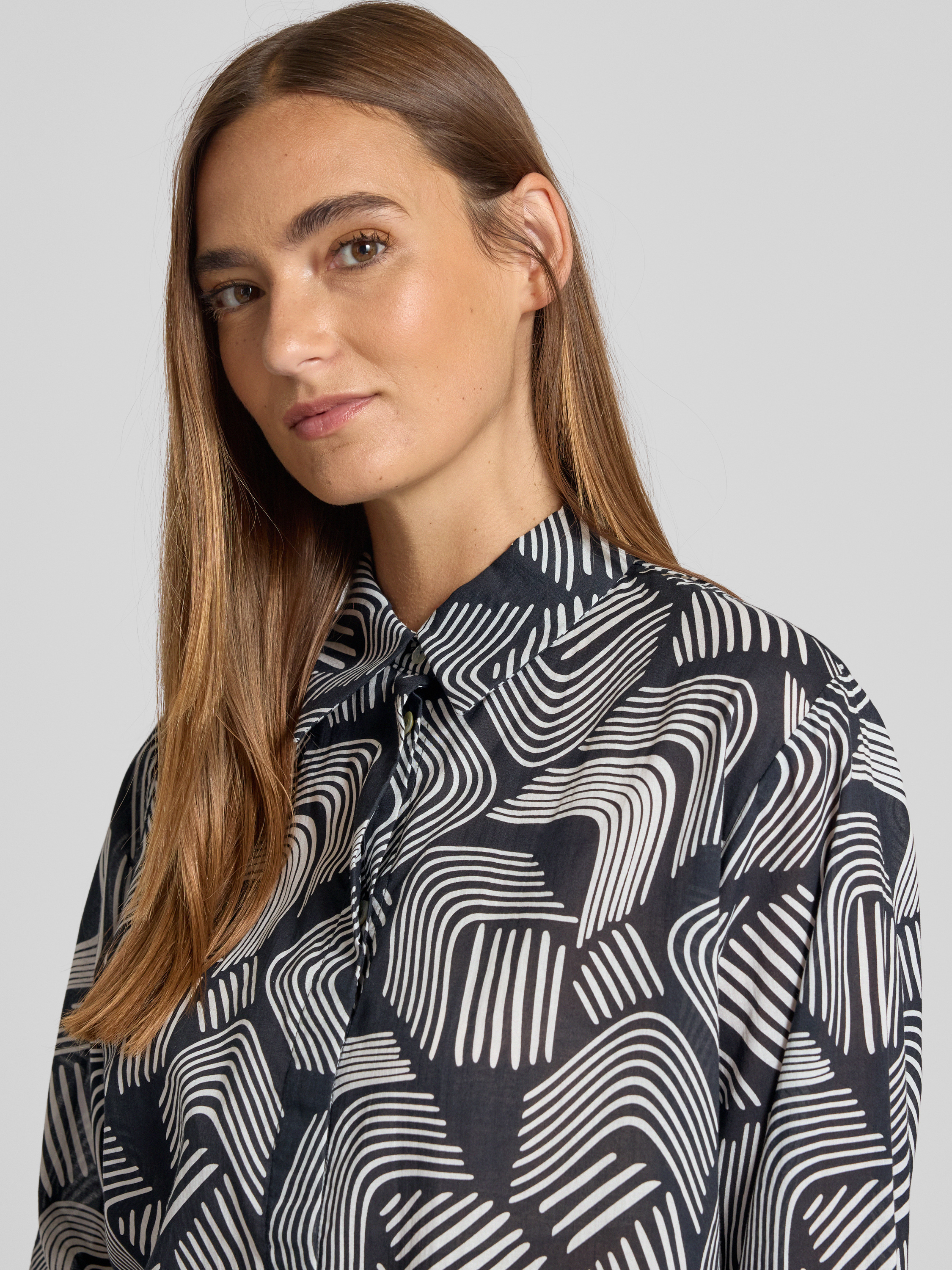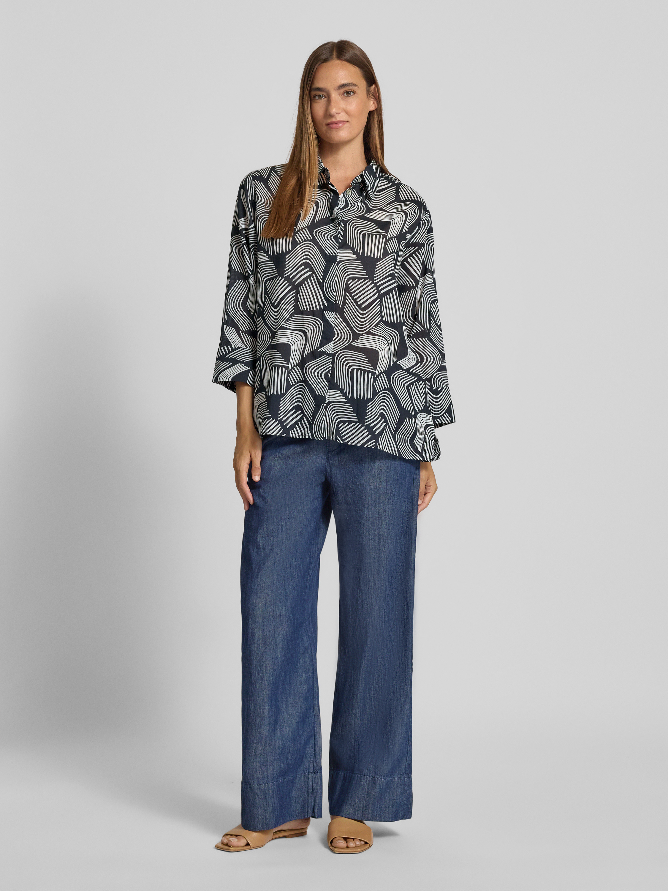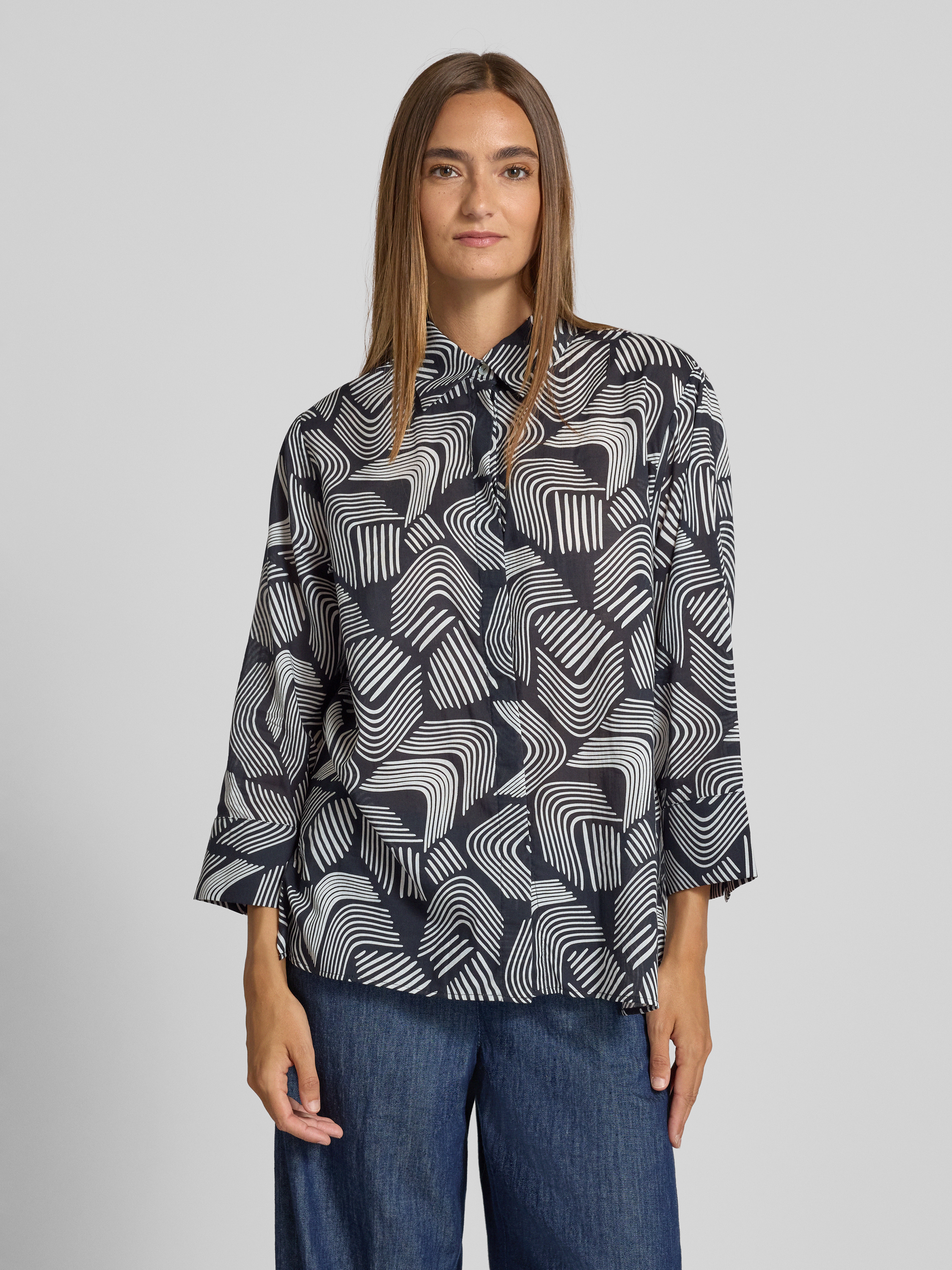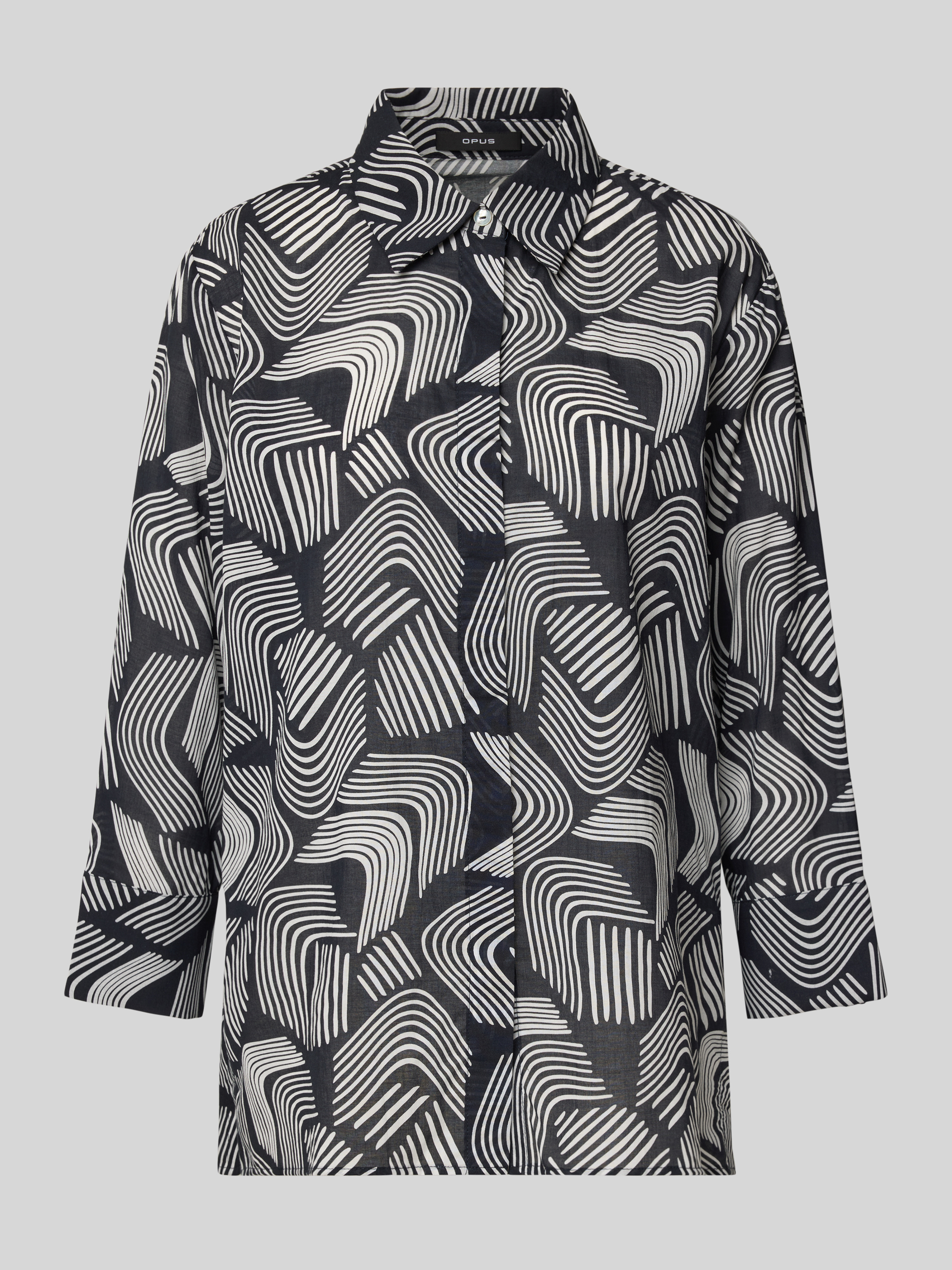 Die Regular Fit Bluse von OPUS, Modell 'Fumina move', aus reiner Viskose, vereint Komfort mit einem stilvollen Allover-Look. Der Hemdblusenkragen und die verdeckte Knopfleiste sorgen für ein elegantes Erscheinungsbild. Der Schnitt bietet eine bequeme Passform für verschiedene Anlässe.