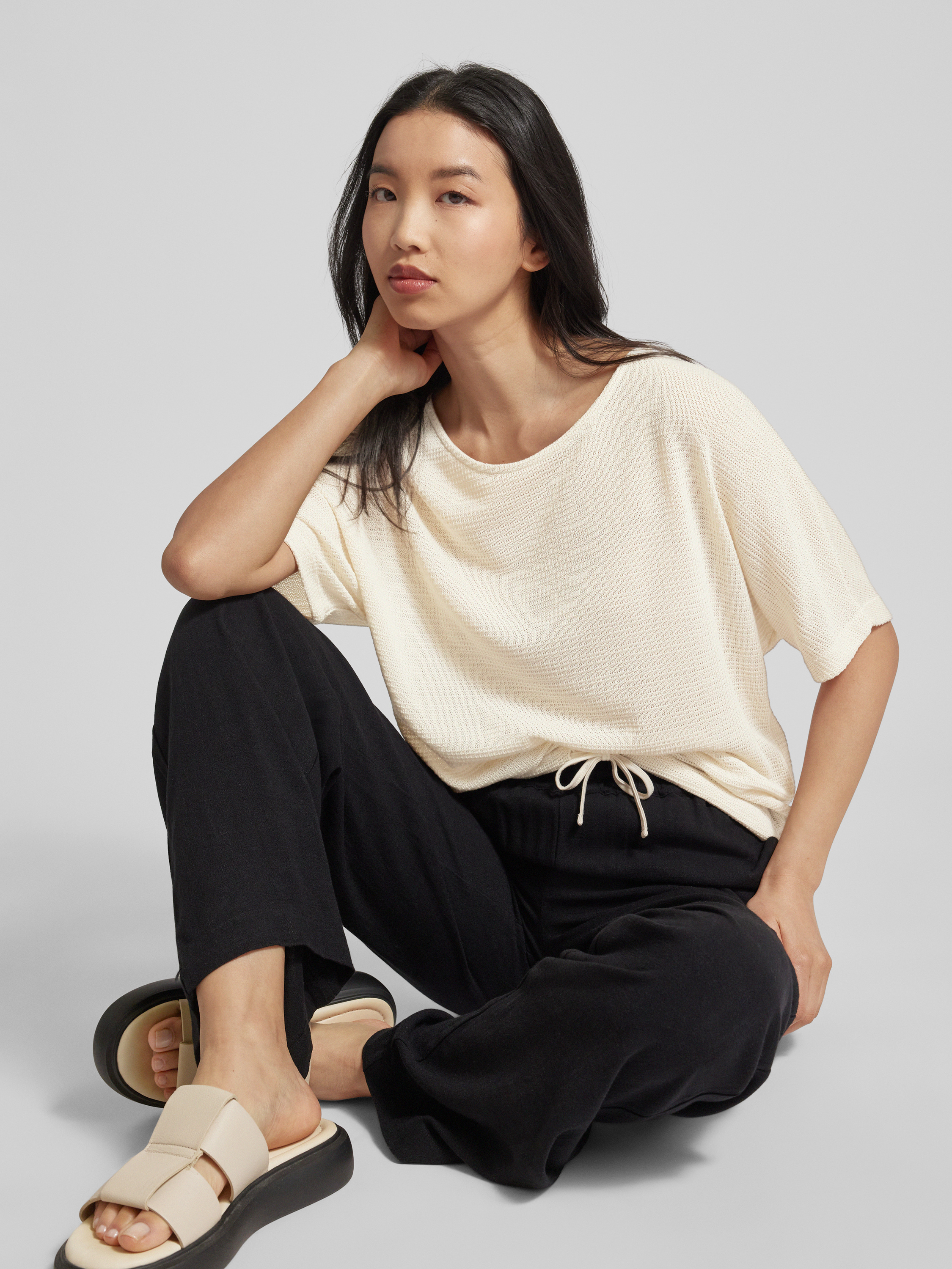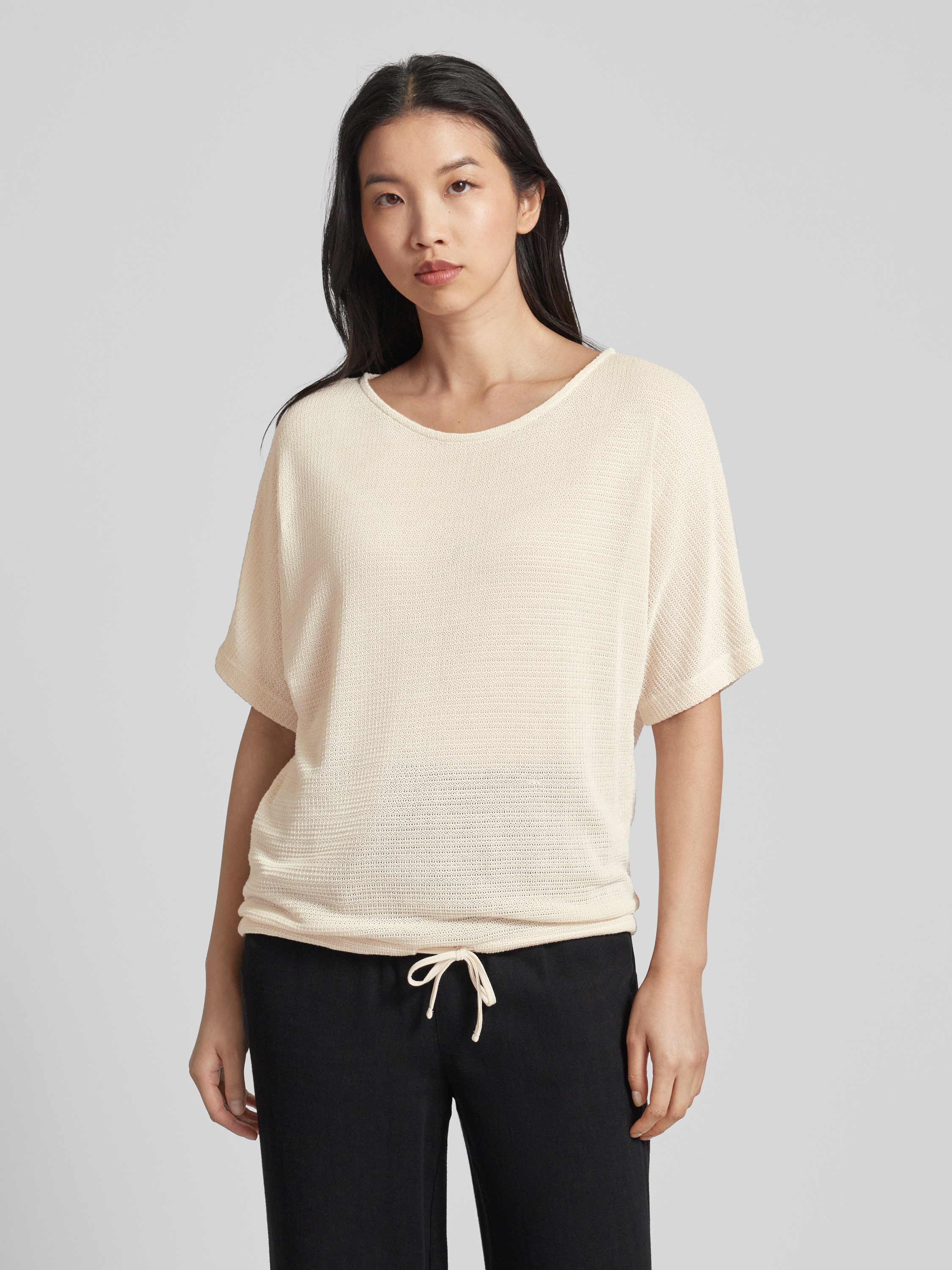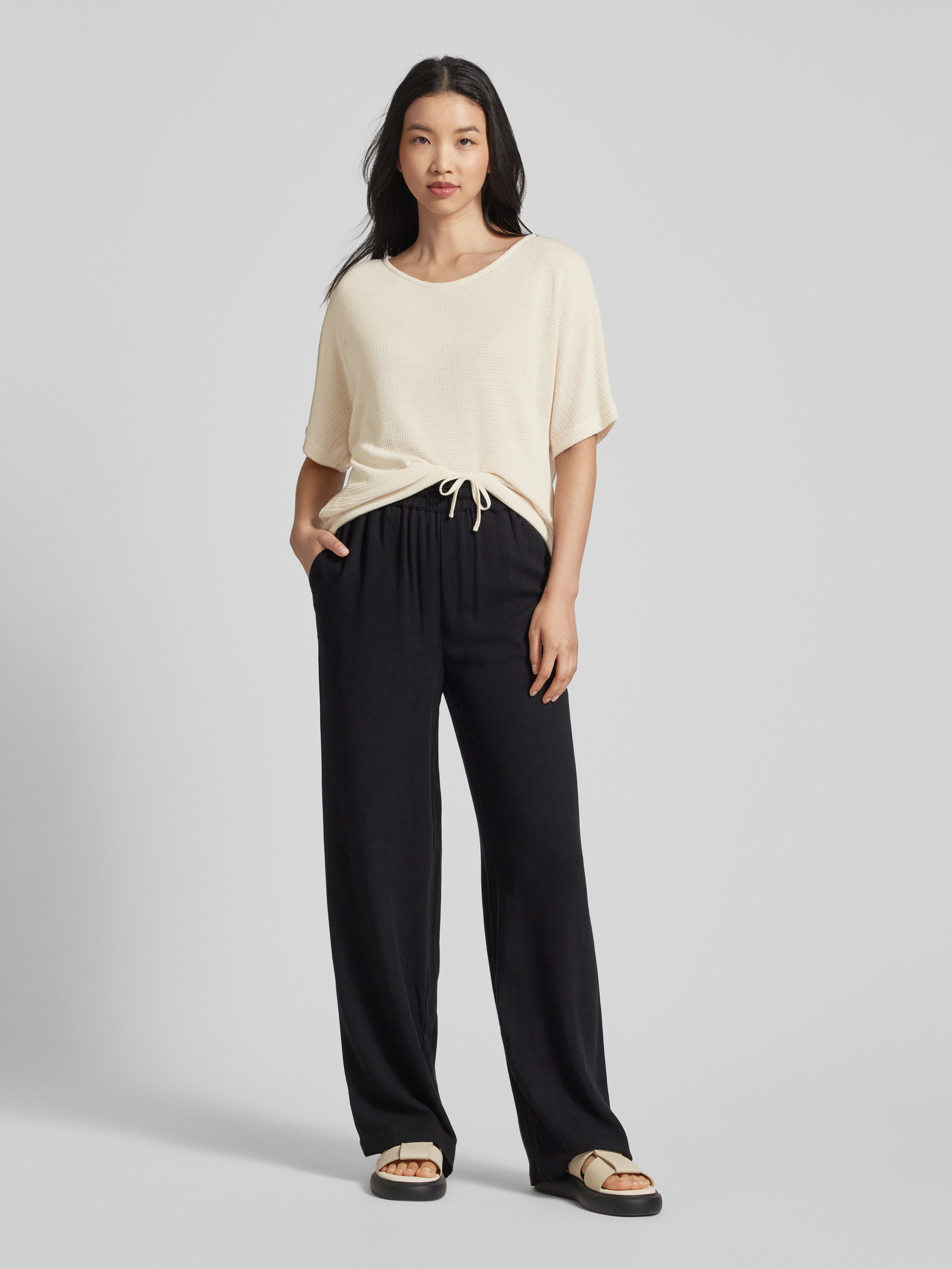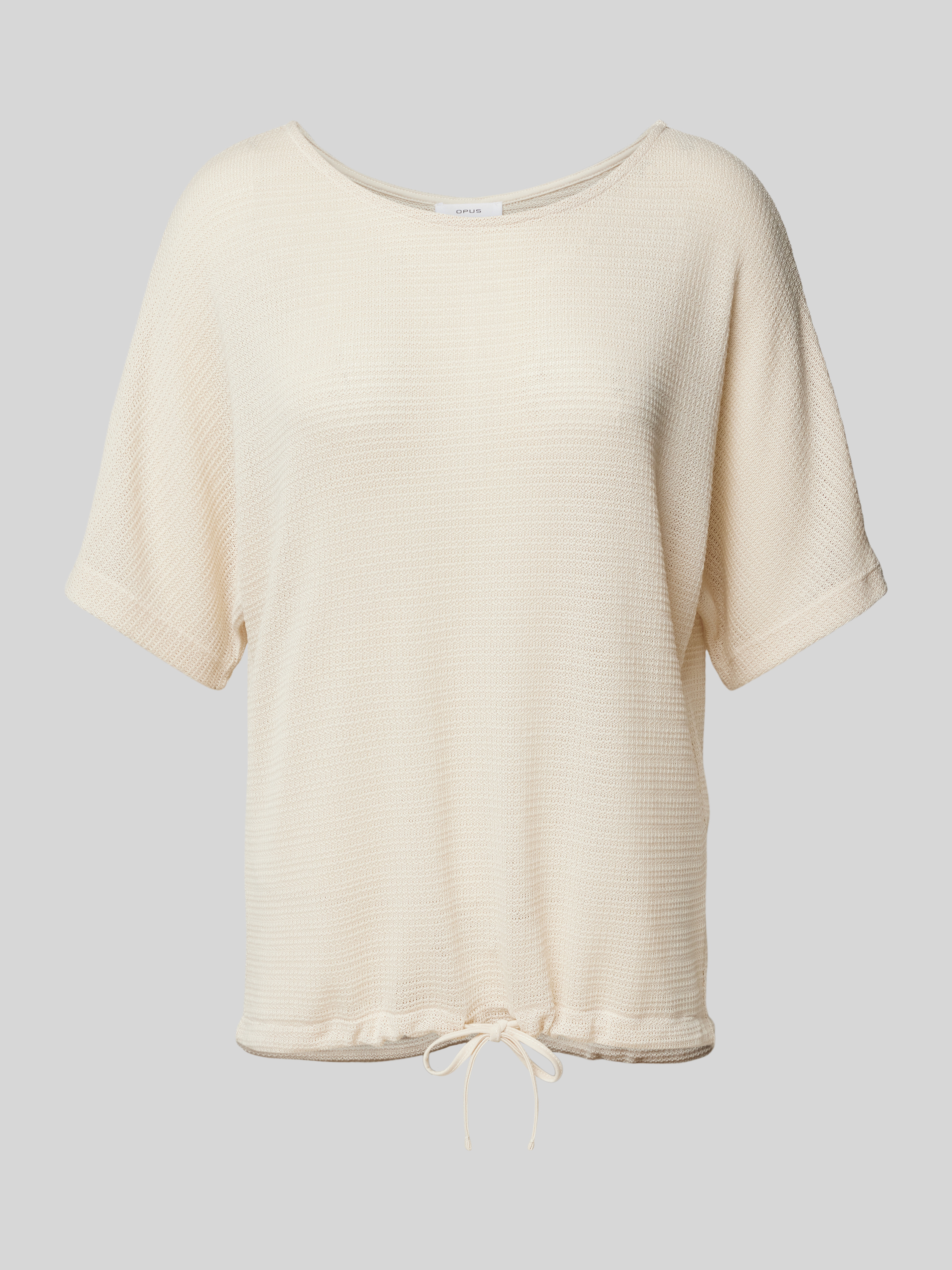Das Damen T-Shirt von OPUS, Modell 'Saronji', kombiniert einen Viskose-Mix mit einem geraden Schnitt für ein angenehmes Tragegefühl. Sein unifarbenes Design mit Strukturmuster und Rundhalsausschnitt verleiht jedem Outfit eine dezente Eleganz. Der Tunnelzug bietet zusätzliche Anpassungsmöglichkeiten.
