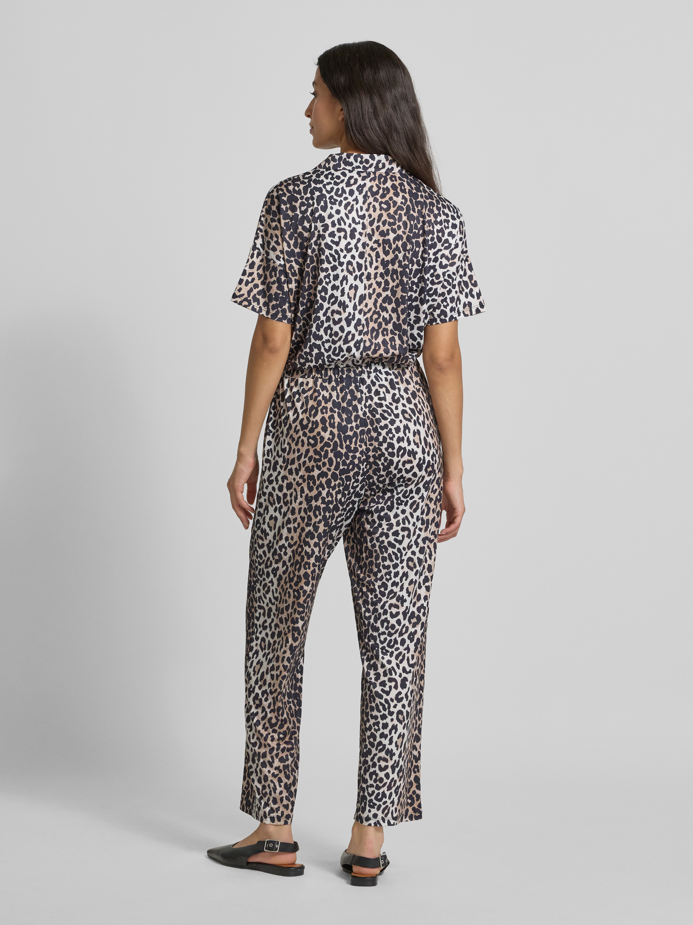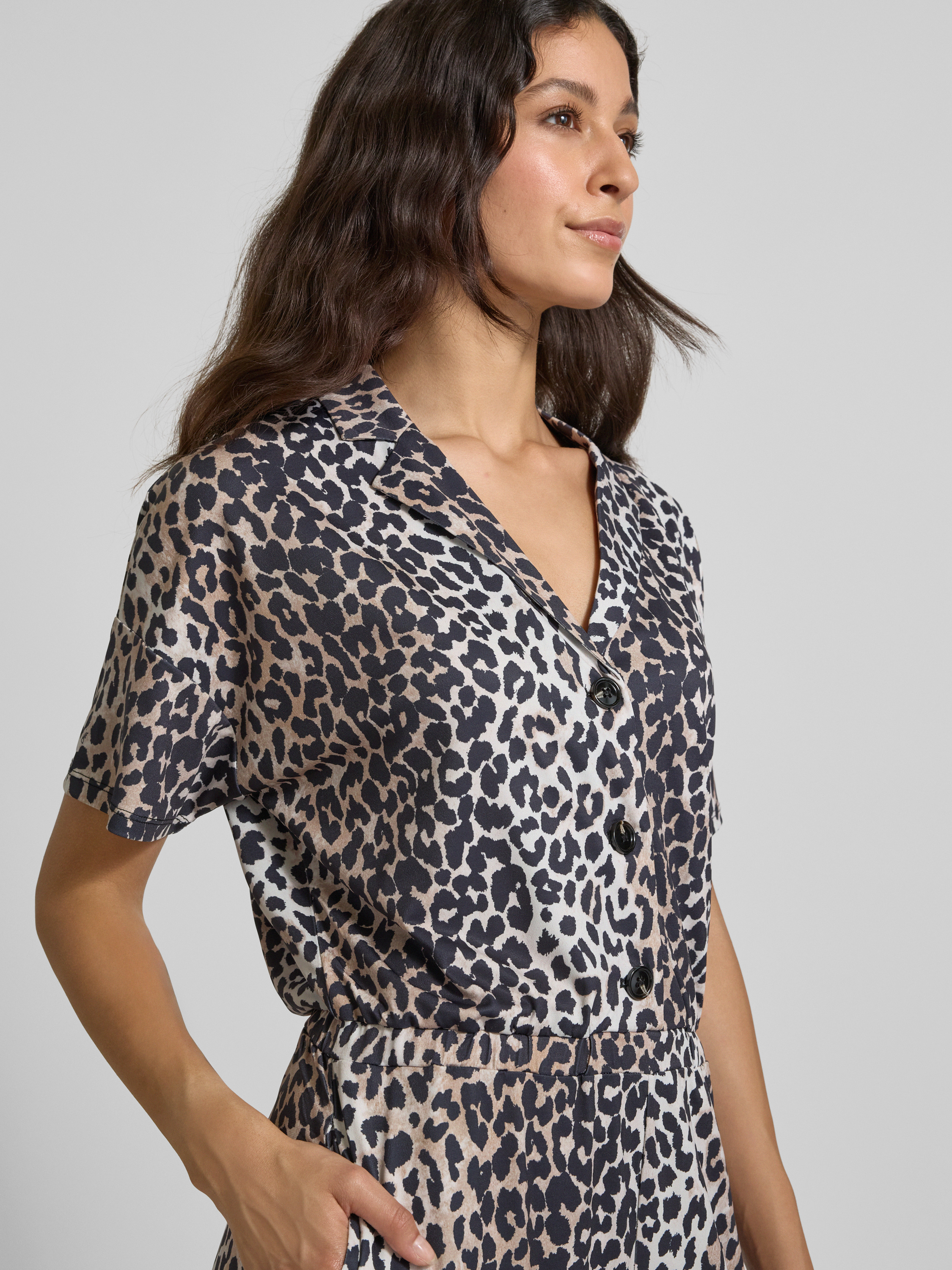 Der Jumpsuit von Oui vereint einen modernen Animal-Print mit einem eleganten Reverskragen. Durch seine taillierte Passform wird eine feminine Silhouette betont, während der elastische Material-Mix Bewegungsfreiheit bietet. Das kurzärmelige Design sorgt für ein luftiges Tragegefühl.