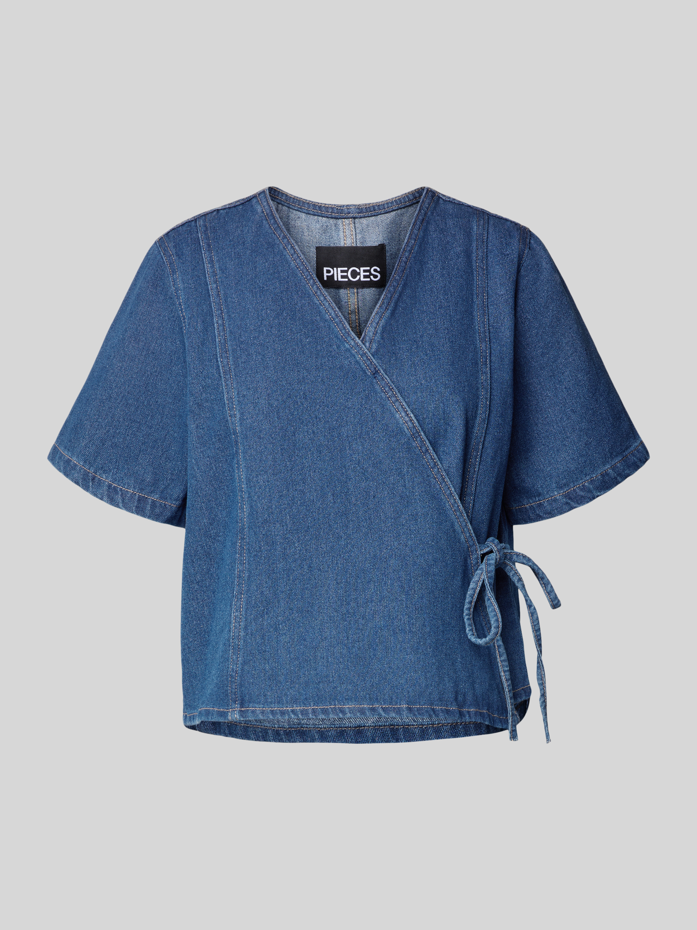 Die Jeansbluse 'Fibbo' von Pieces kombiniert eine lässige Regular Fit-Passform mit einem eleganten Hemdblusenkragen und einem tiefen V-Ausschnitt. Der Baumwoll-Mix sorgt für angenehmen Tragekomfort, während der melierte Denim-Look vielseitig kombinierbar ist und sich ideal für den Alltag eignet.