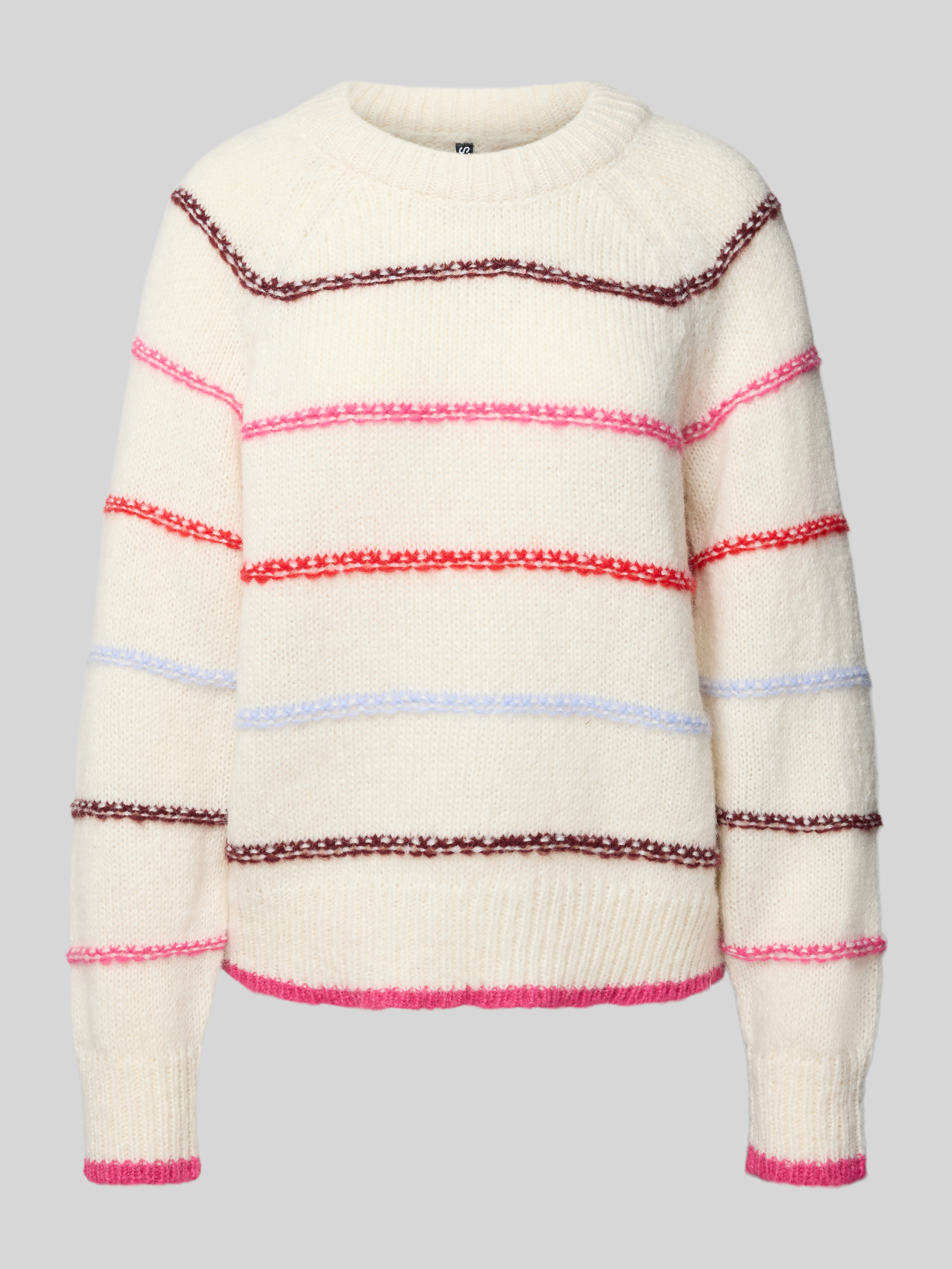 Der Damenpullover von Pieces, Modell Nelia, fällt durch sein gestreiftes Allover-Muster und die entspannte Regular Fit-Passform auf. Die Raglanärmel sorgen für angenehme Bewegungsfreiheit, während der Rundhalsausschnitt den klassischen Charakter unterstreicht. Durch die weiche Strickstruktur fühlt sich das Modell komfortabel an.