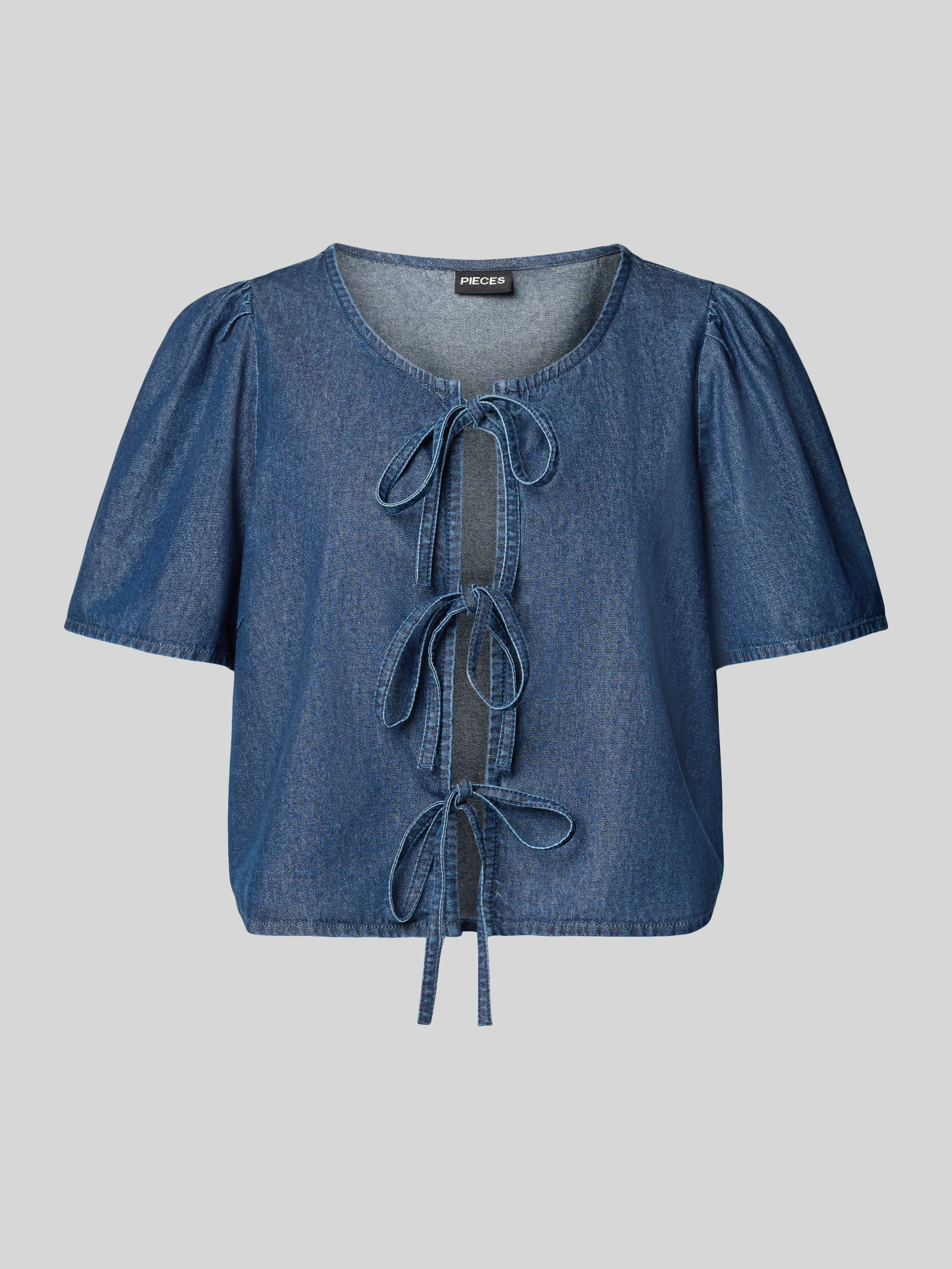 Das Blusenshirt 'Tenim' von Pieces kombiniert in entspannter Relaxed Fit-Passform eine dezente Melange-Optik mit einem klassischen Rundhalsausschnitt. Gefertigt aus reiner Baumwolle, sorgt es für ein angenehmes Tragegefühl. Der Bindeverschluss und die kurzen Ärmel verleihen dem Modell eine leichte, sommerliche Note.