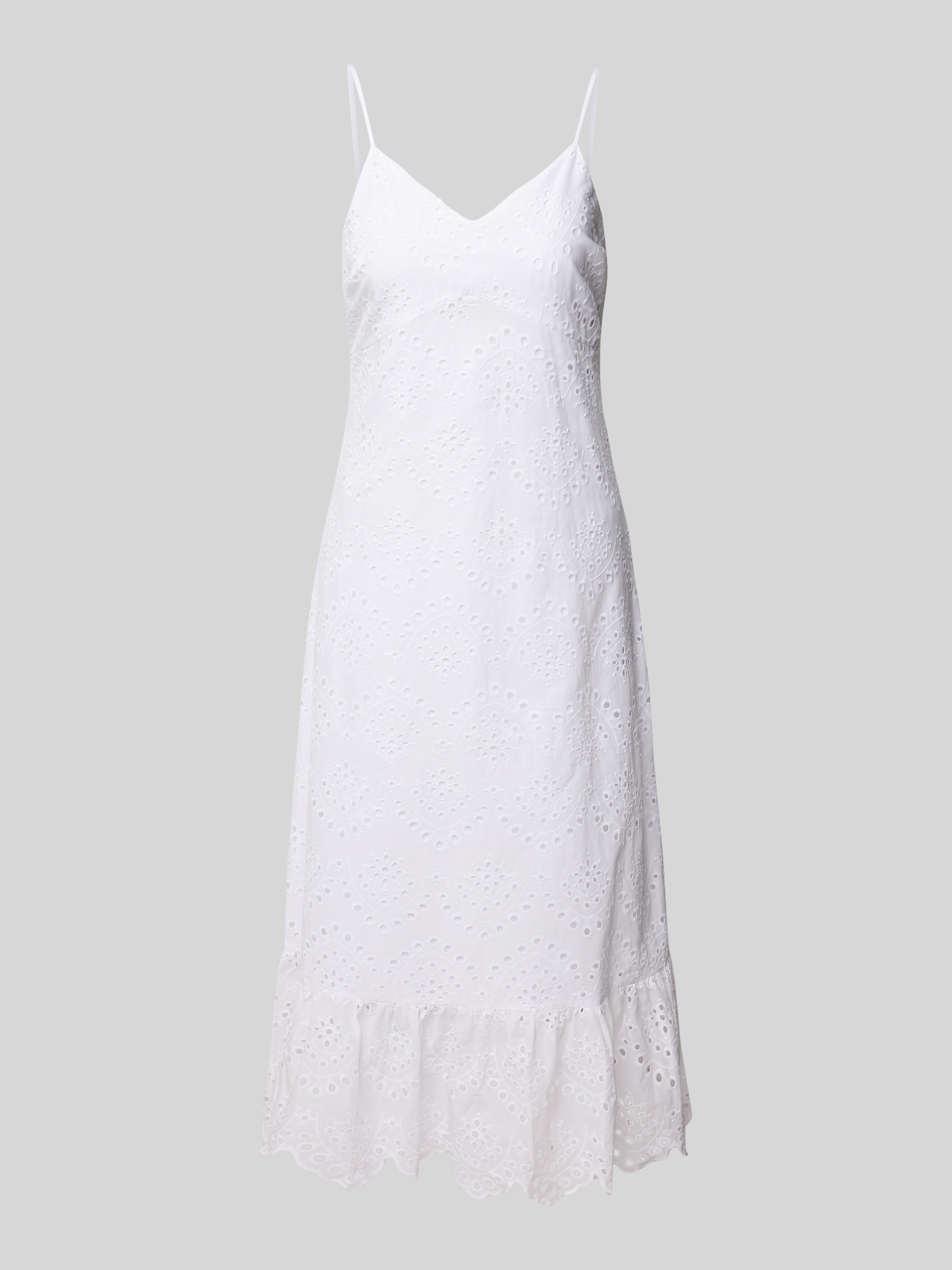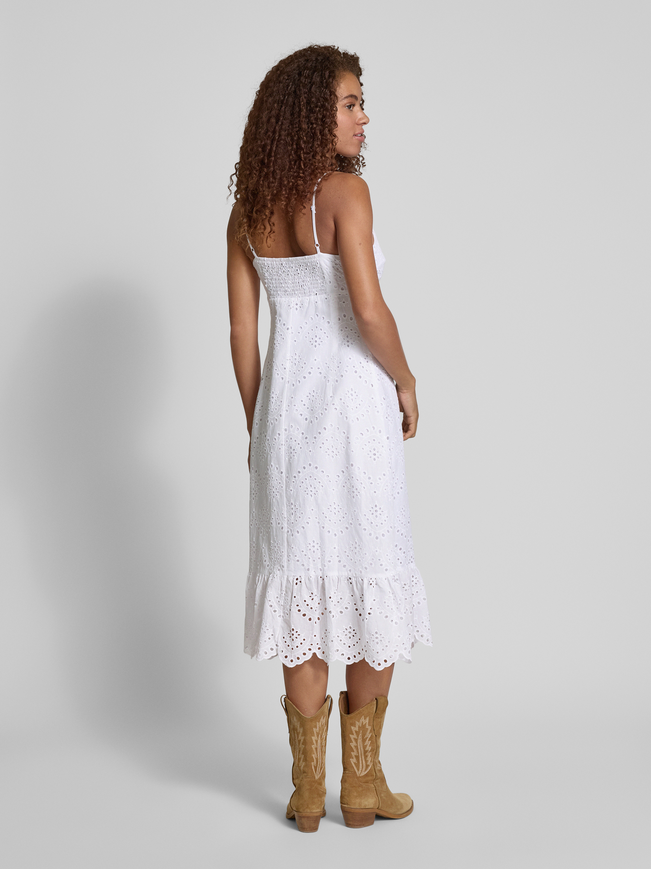 Das Damenkleid von Pieces, Modell Vilde, zeigt sich in einer taillierten Passform, die durch das feine Lochstickmuster und den Muschelsaum eine verspielte Note erhält. Reine Baumwolle sorgt für ein angenehmes Tragegefühl, während verstellbare Spaghettiträger Flexibilität bieten. So eignet es sich für entspannte Stunden im Alltag.