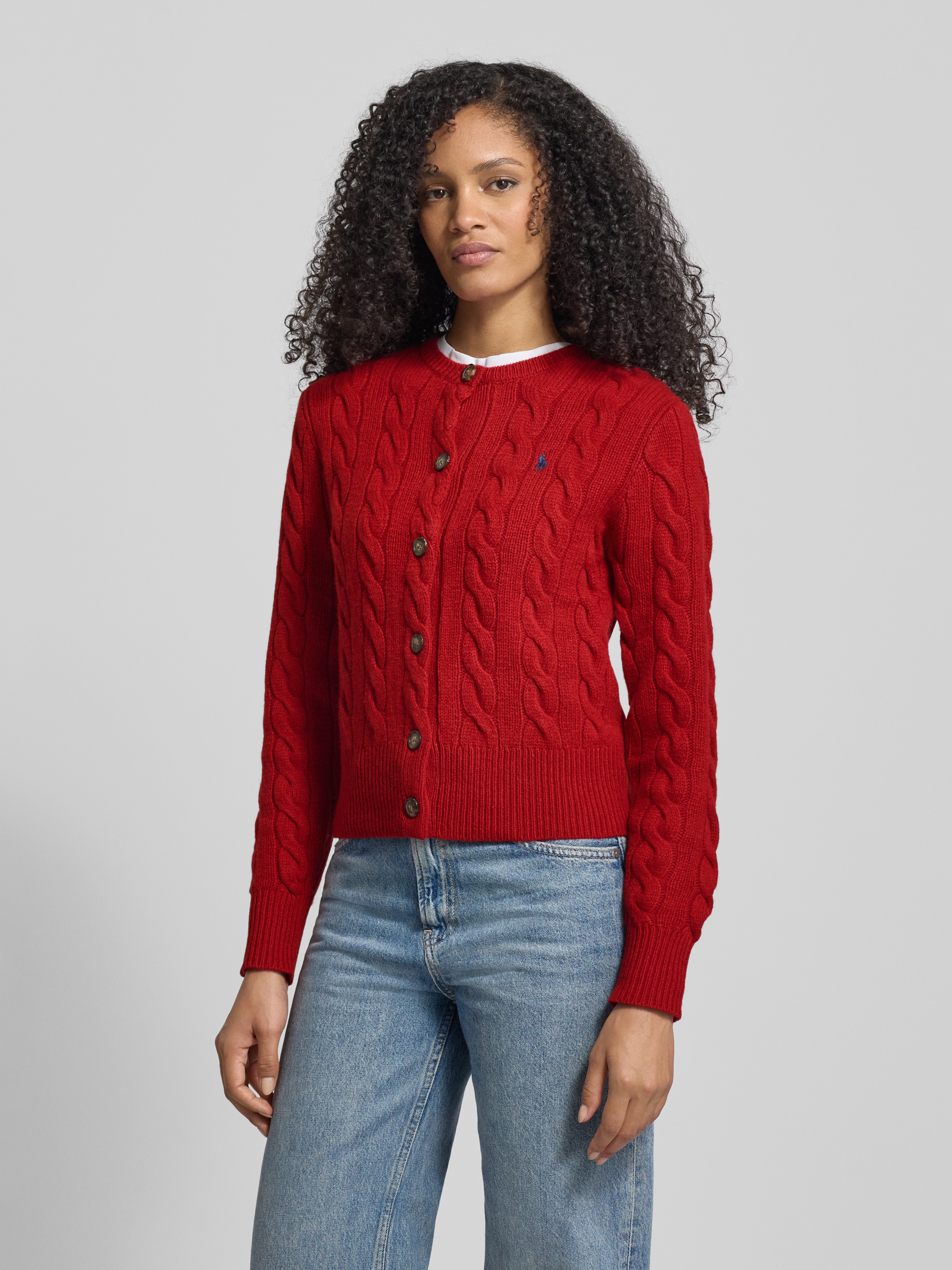 Der Damen Cardigan von Polo Ralph Lauren verbindet einen angenehmen Wolle-Kaschmir-Mix mit einem feinen Zopfmuster und Slim Fit. Durch den Rundhalsausschnitt wirkt das Modell klassisch, während das Label-Stitching einen dezenten Akzent setzt. So eignet sich das Kleidungsstück vielseitig für den Alltag.