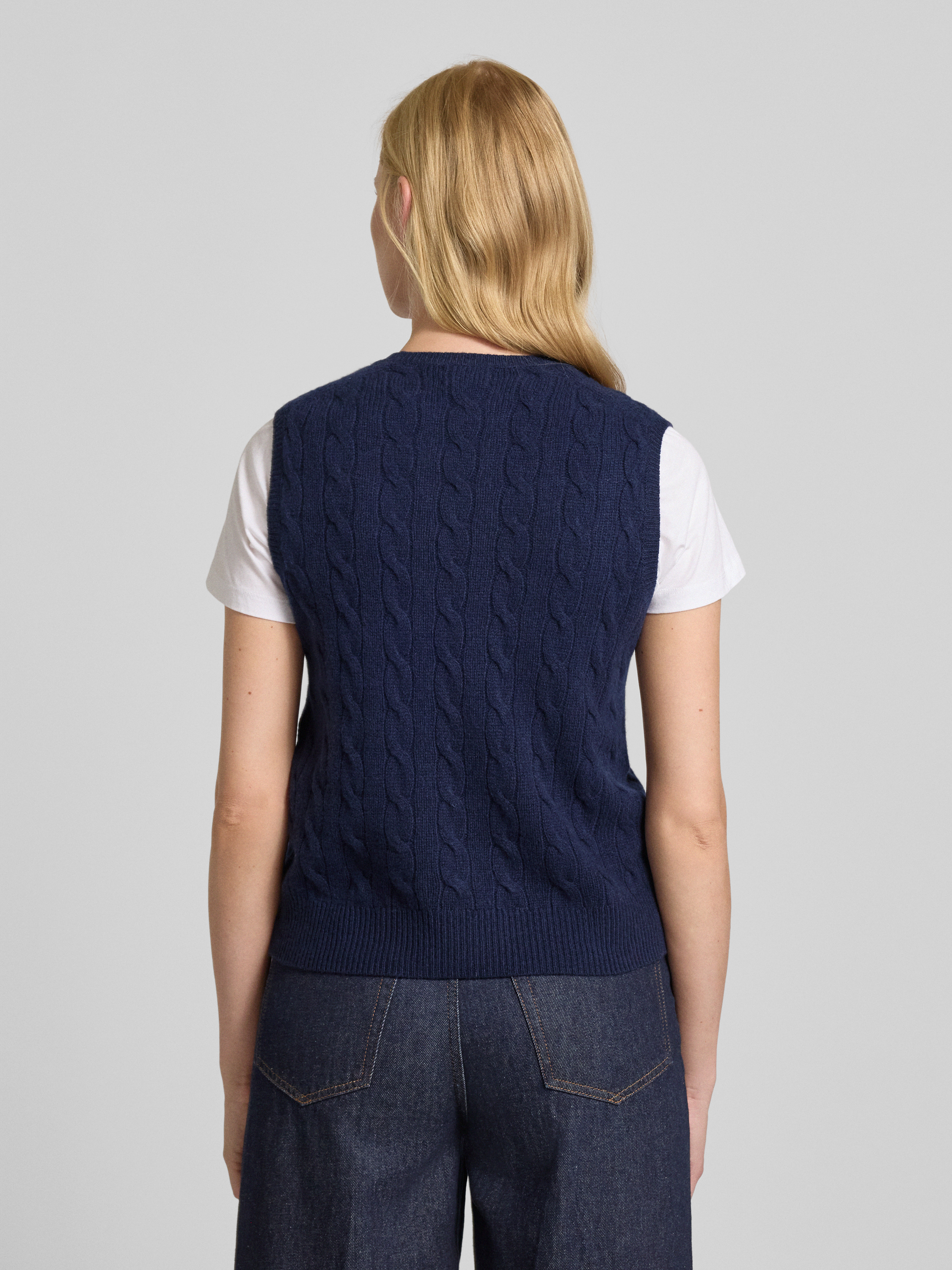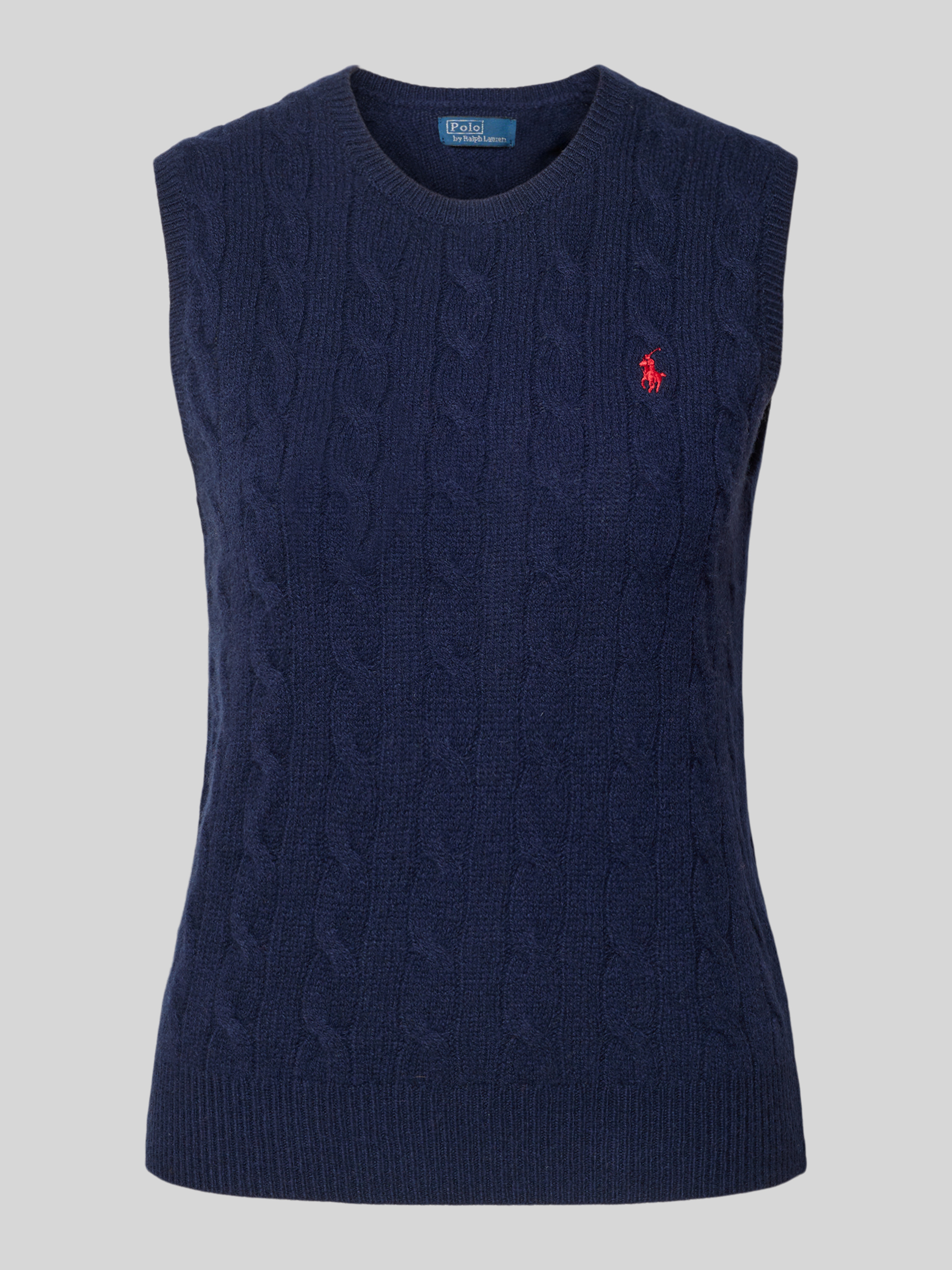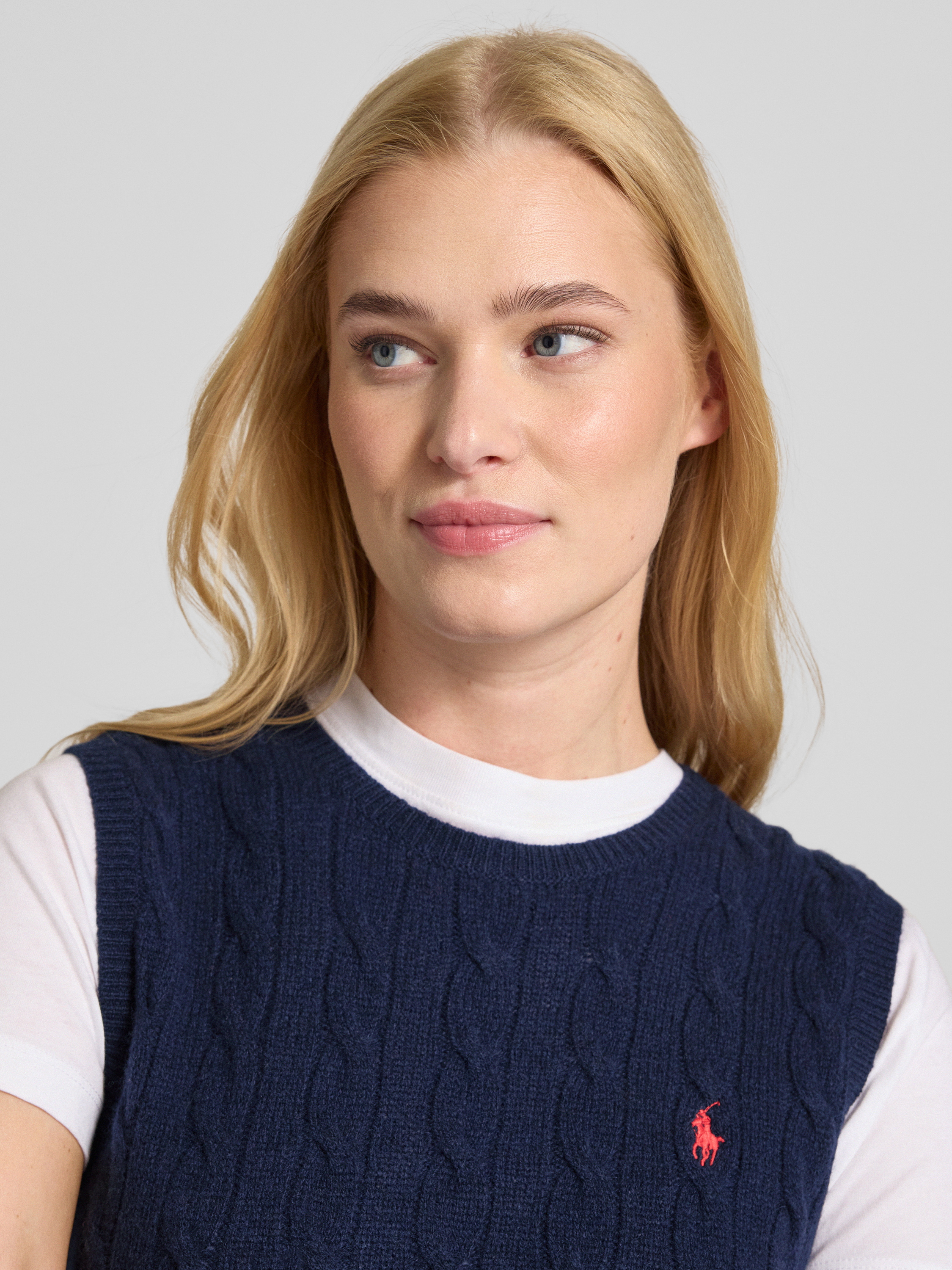 Das Damen Stricktop von Polo Ralph Lauren kombiniert einen eng anliegenden Schnitt mit einem eleganten Zopfmuster. Der feine Baumwoll-Kaschmir-Mix fühlt sich angenehm leicht auf der Haut an, während der abgerundete V-Ausschnitt für eine dezente, feminine Note sorgt. Das dezente Logo-Stitching rundet das Design ab.