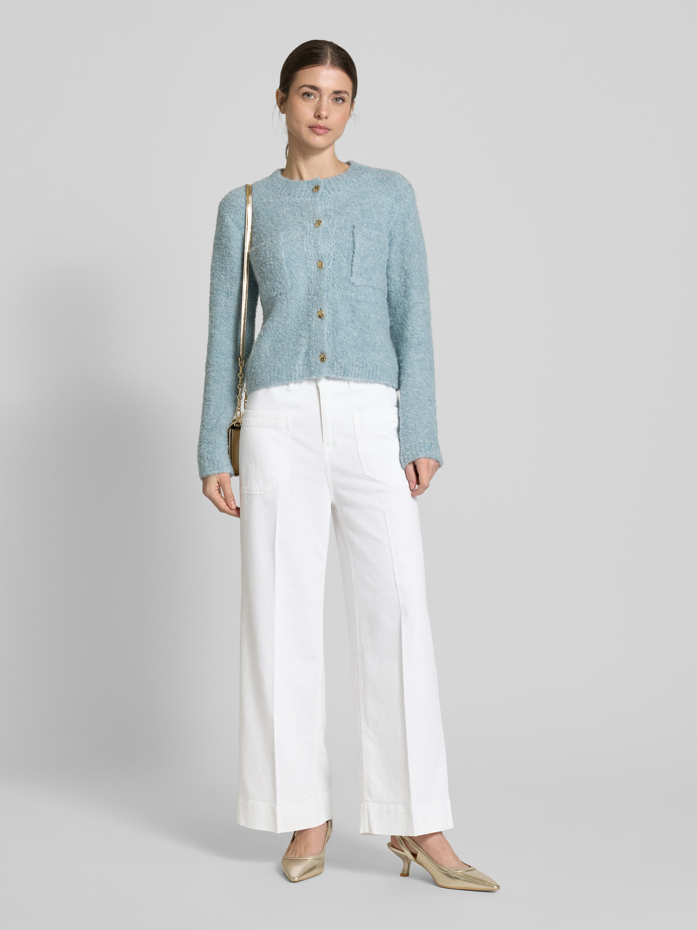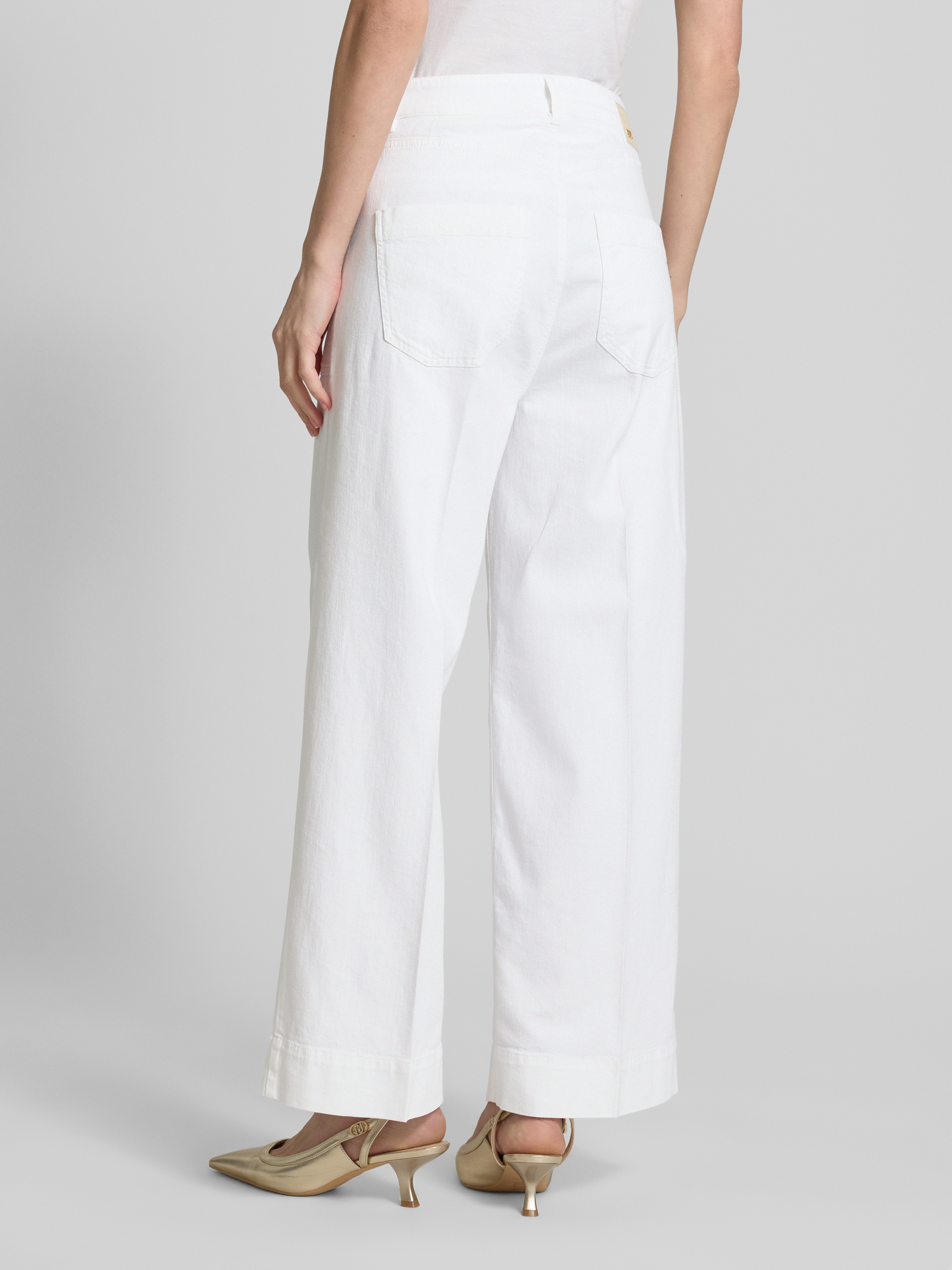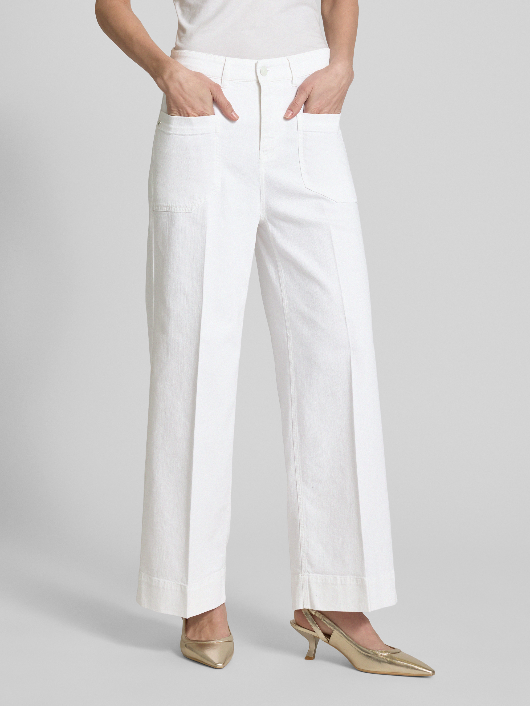 Die Wide Leg Jeans 'MIRU' von Raffaello Rossi kombiniert einen elastischen Baumwoll-Mix mit einem Hauch von Leinen. Diese Materialmischung sorgt für ein angenehmes Tragegefühl und verleiht dem Modell eine lässige Eleganz. Die aufgesetzten Taschen ergänzen den modernen Schnitt harmonisch.