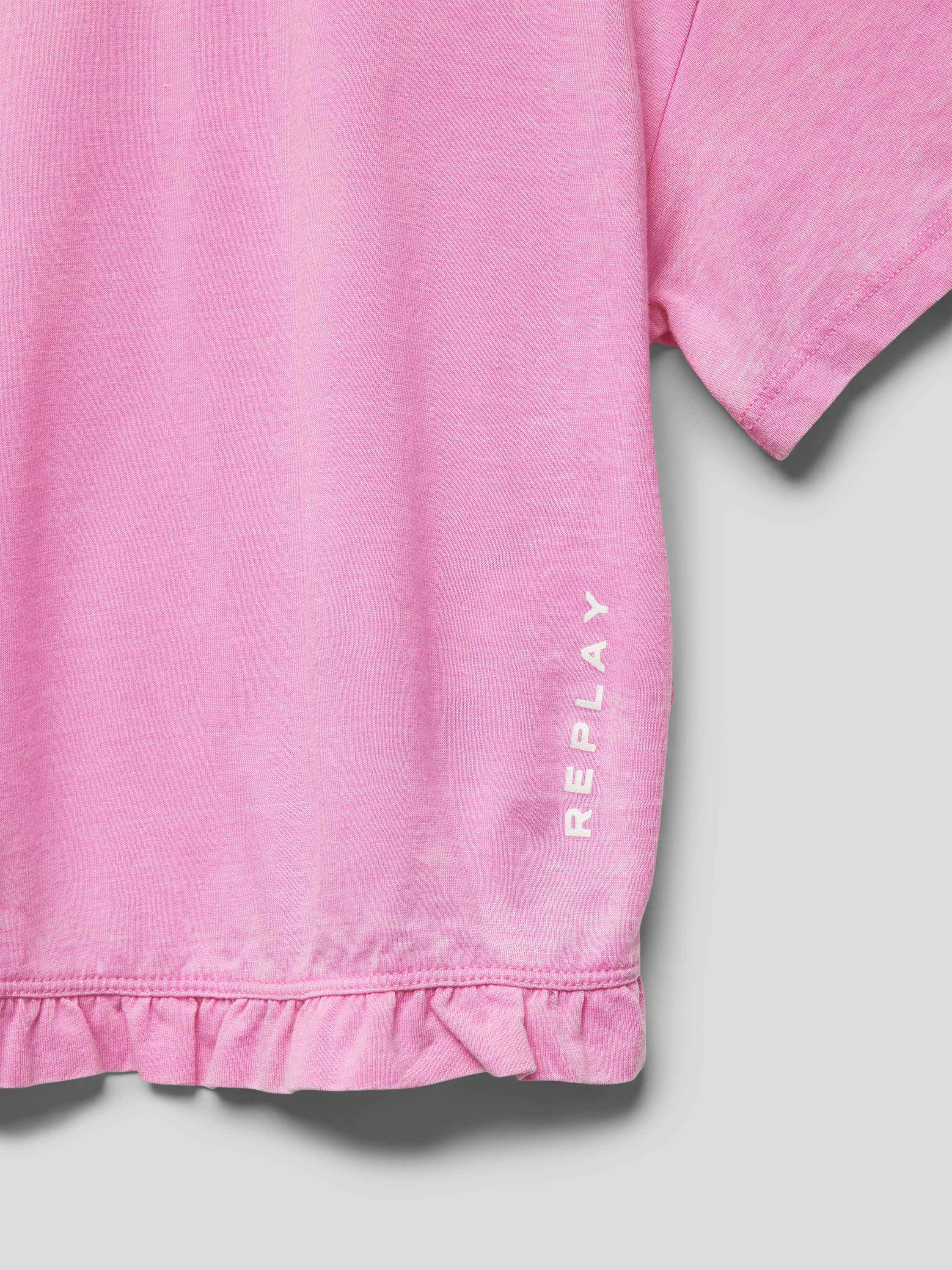 Das Cropped T-Shirt von REPLAY kombiniert einen bequemen Regular Fit mit einem modischen, verkürzten Schnitt, ideal für lässige Freizeitaktivitäten. Der Baumwoll-Mix sorgt für ein angenehmes Tragegefühl, während der Volantsaum und das unifarbene Design stilvolle Akzente setzen. Ein dezenter Label-Print rundet das Gesamtbild ab.