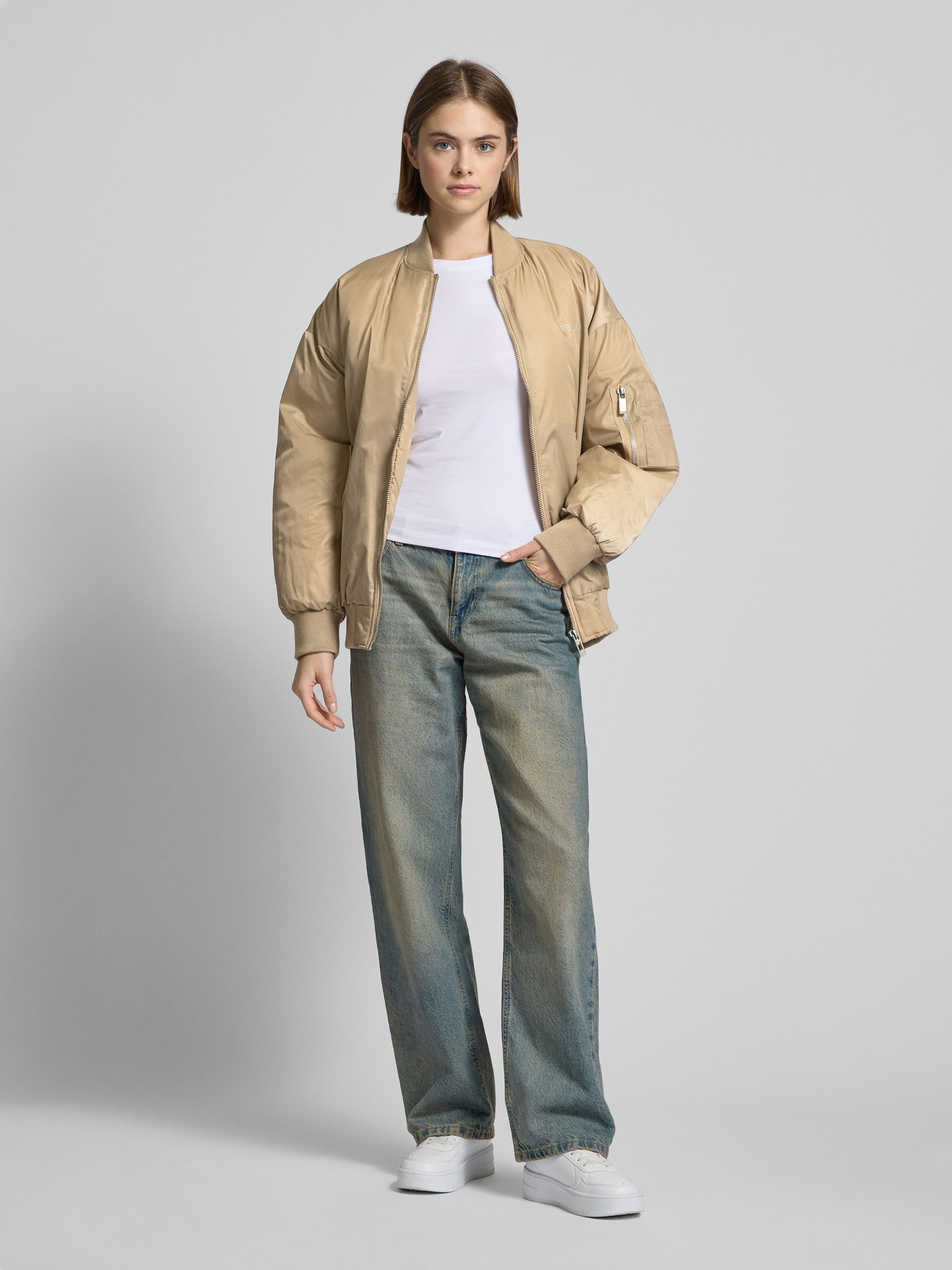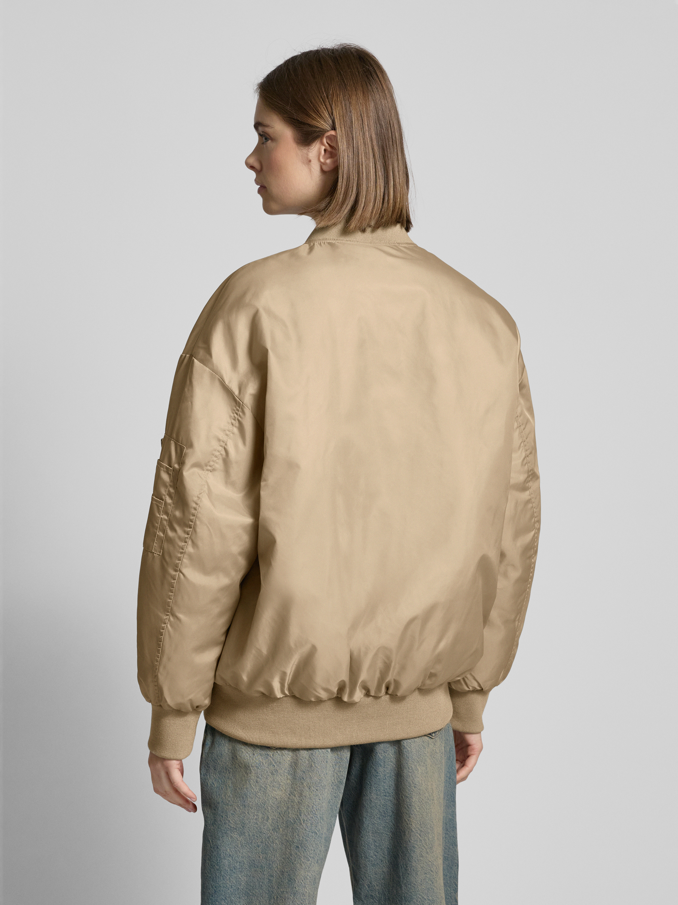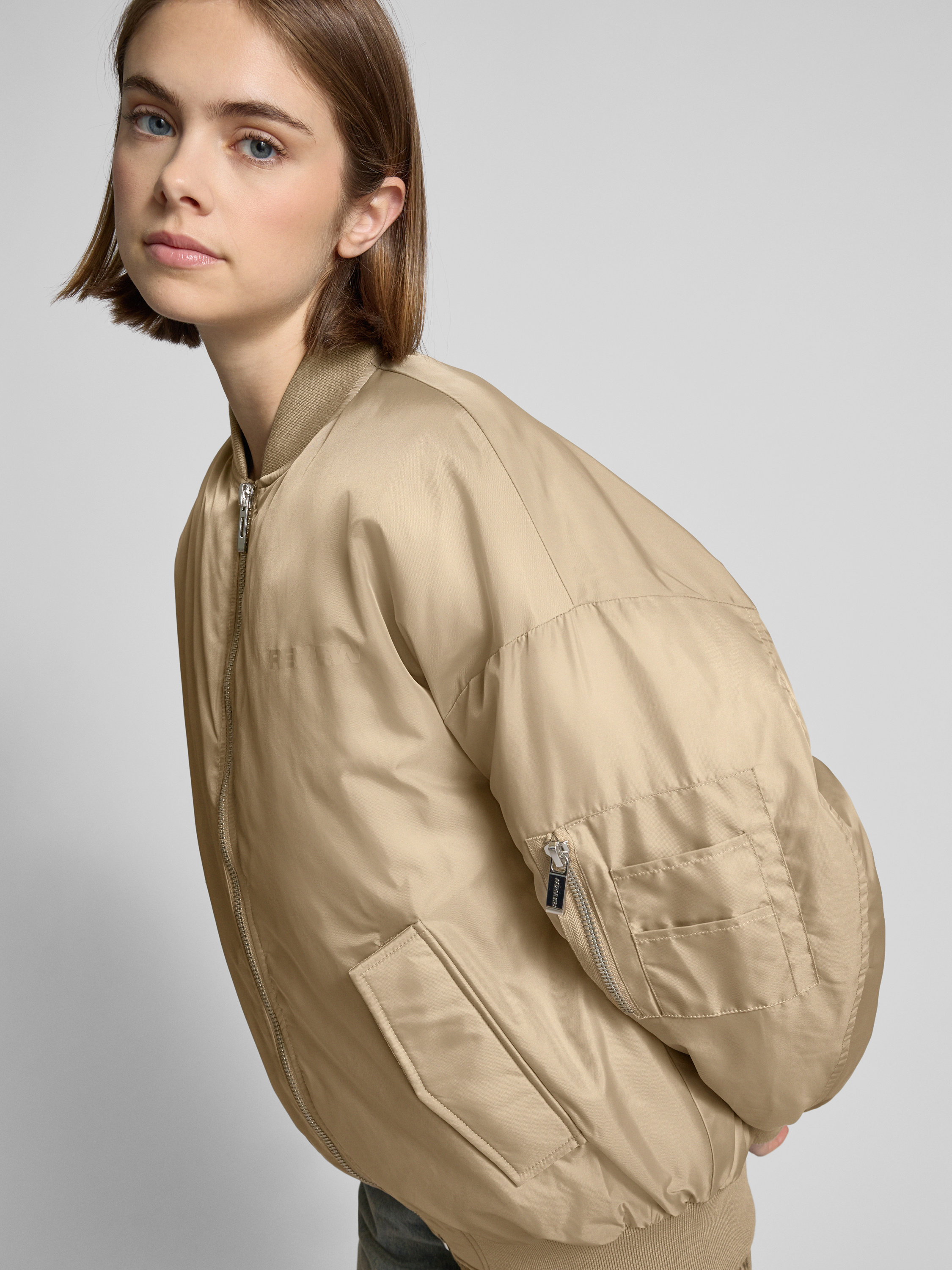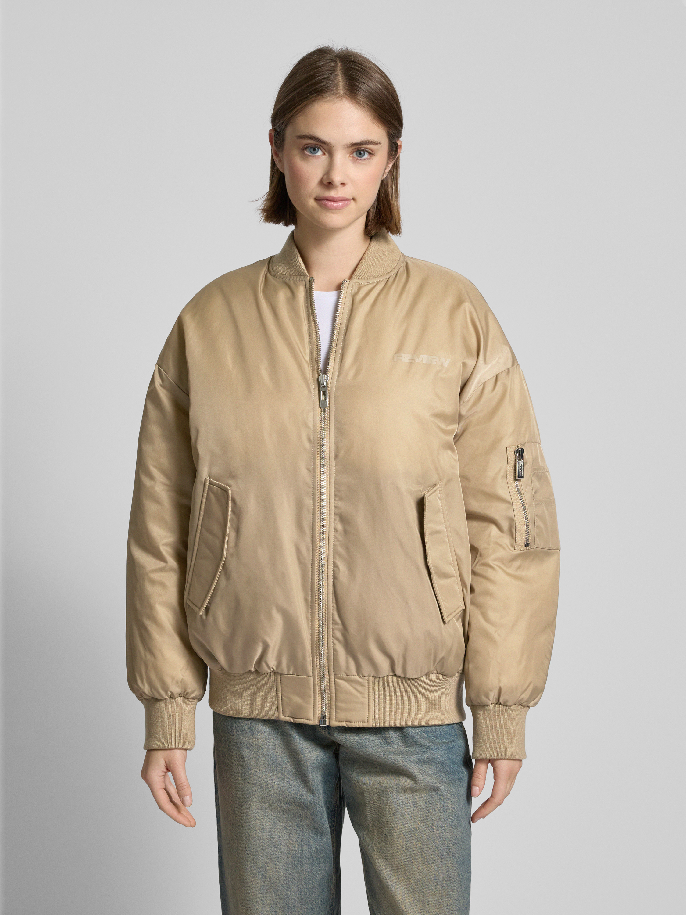 Die Bomberjacke von REVIEW kombiniert einen lockeren Schnitt mit einem markanten Label-Print, wodurch sie sich ideal für einen entspannten, modischen Auftritt eignet. Der Stehkragen verleiht der Jacke eine elegante Note, während Pattentaschen praktischen Stauraum bieten.
