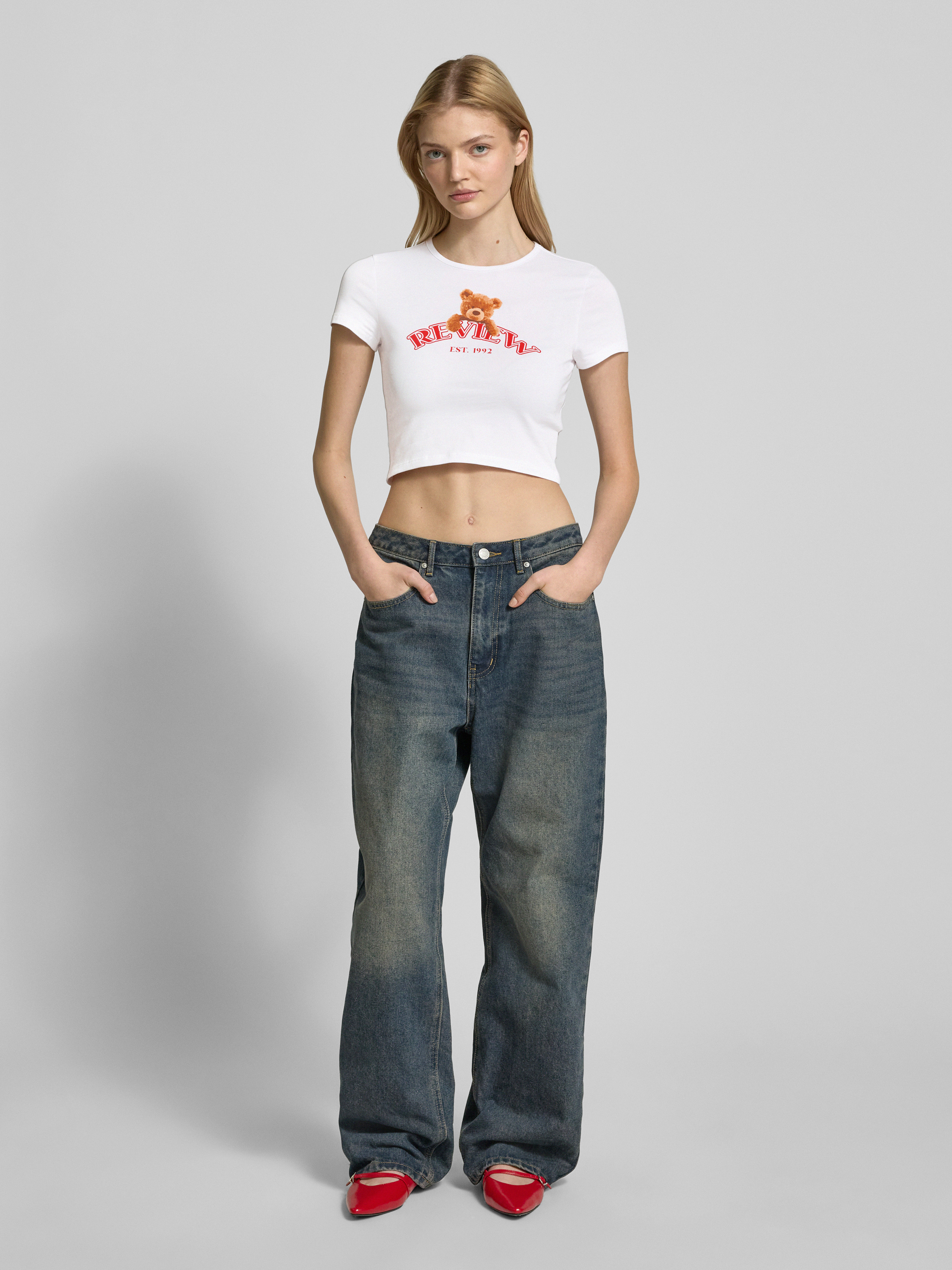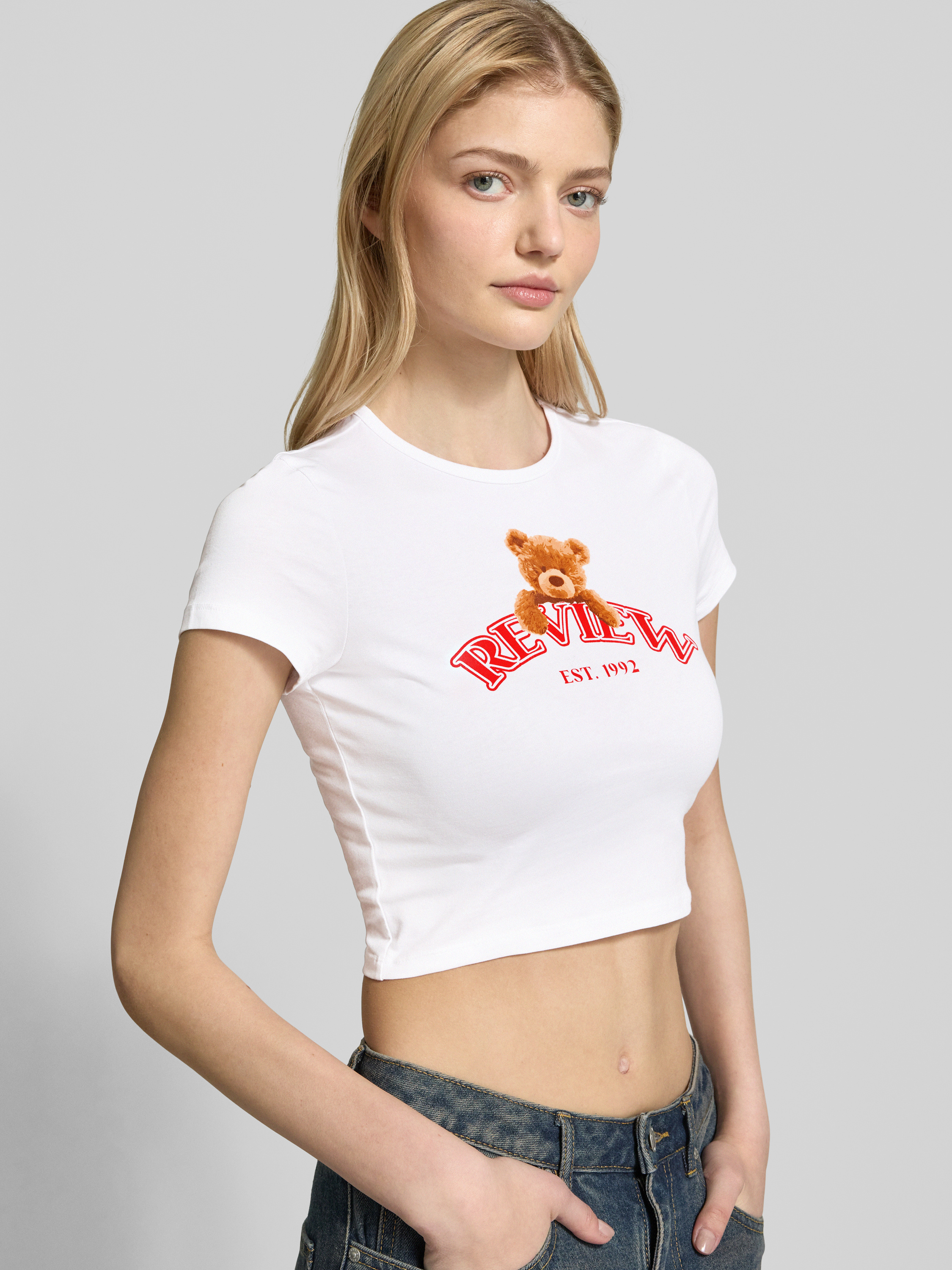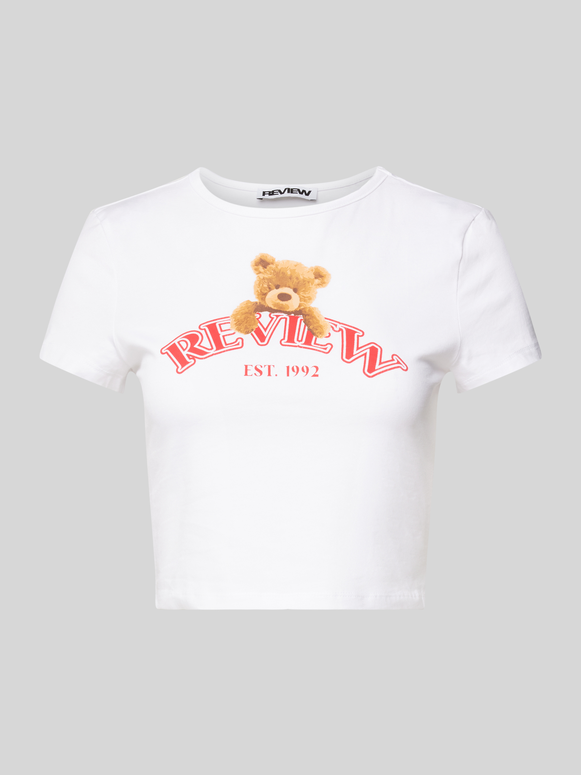 Das Cropped T-Shirt von REVIEW vereint Komfort und Stil in einem Baumwoll-Elasthan-Mix, der sich angenehm auf der Haut anfühlt. Der gerade Schnitt und der Rundhalsausschnitt verleihen dem Shirt eine lässige Passform, während Motiv- und Label-Prints einen modischen Akzent setzen. Ideal für entspannte Alltagslooks.