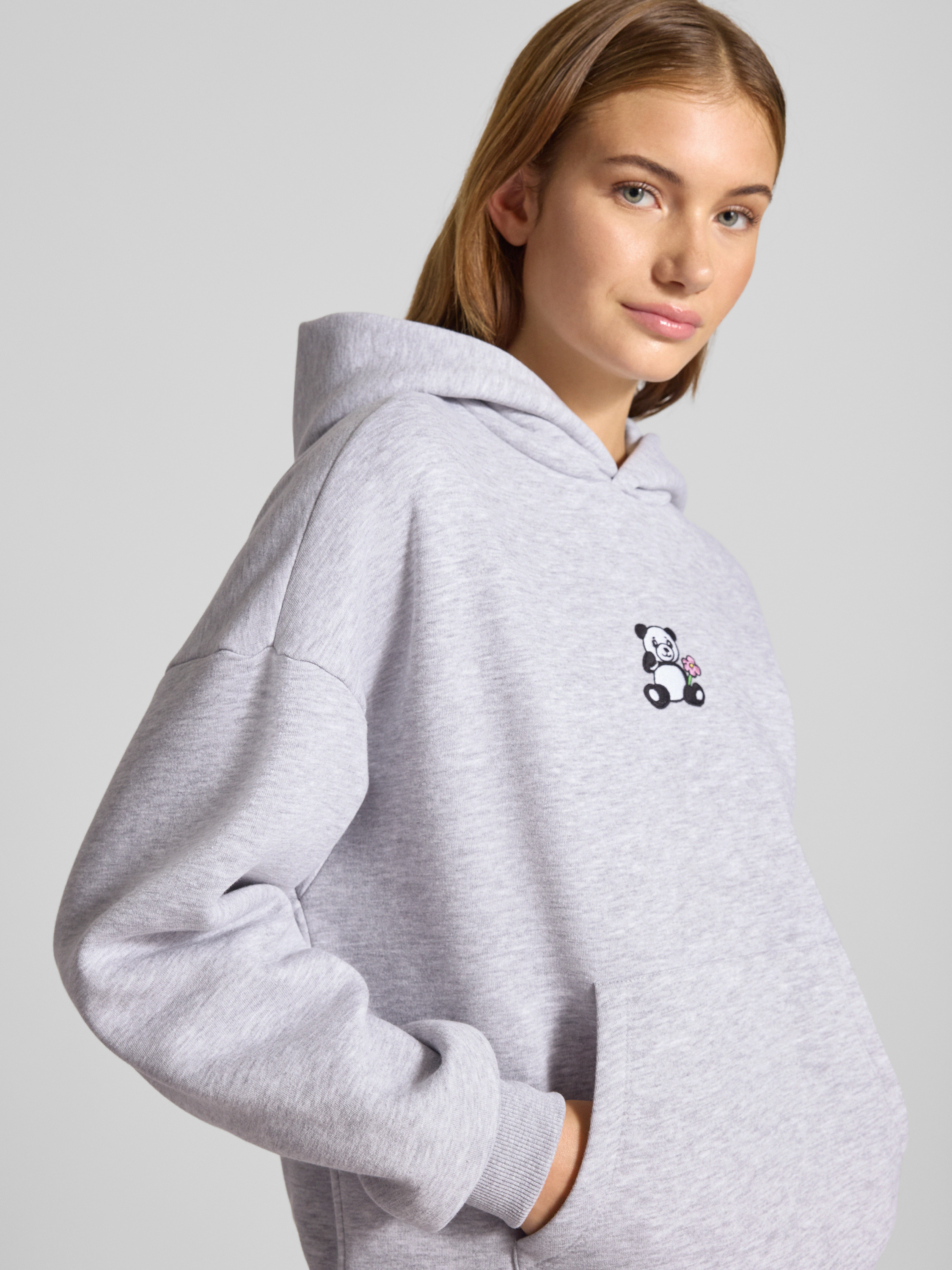 • Review Oversized Hoodie mit Motiv-Stitching Hellgrau Melange