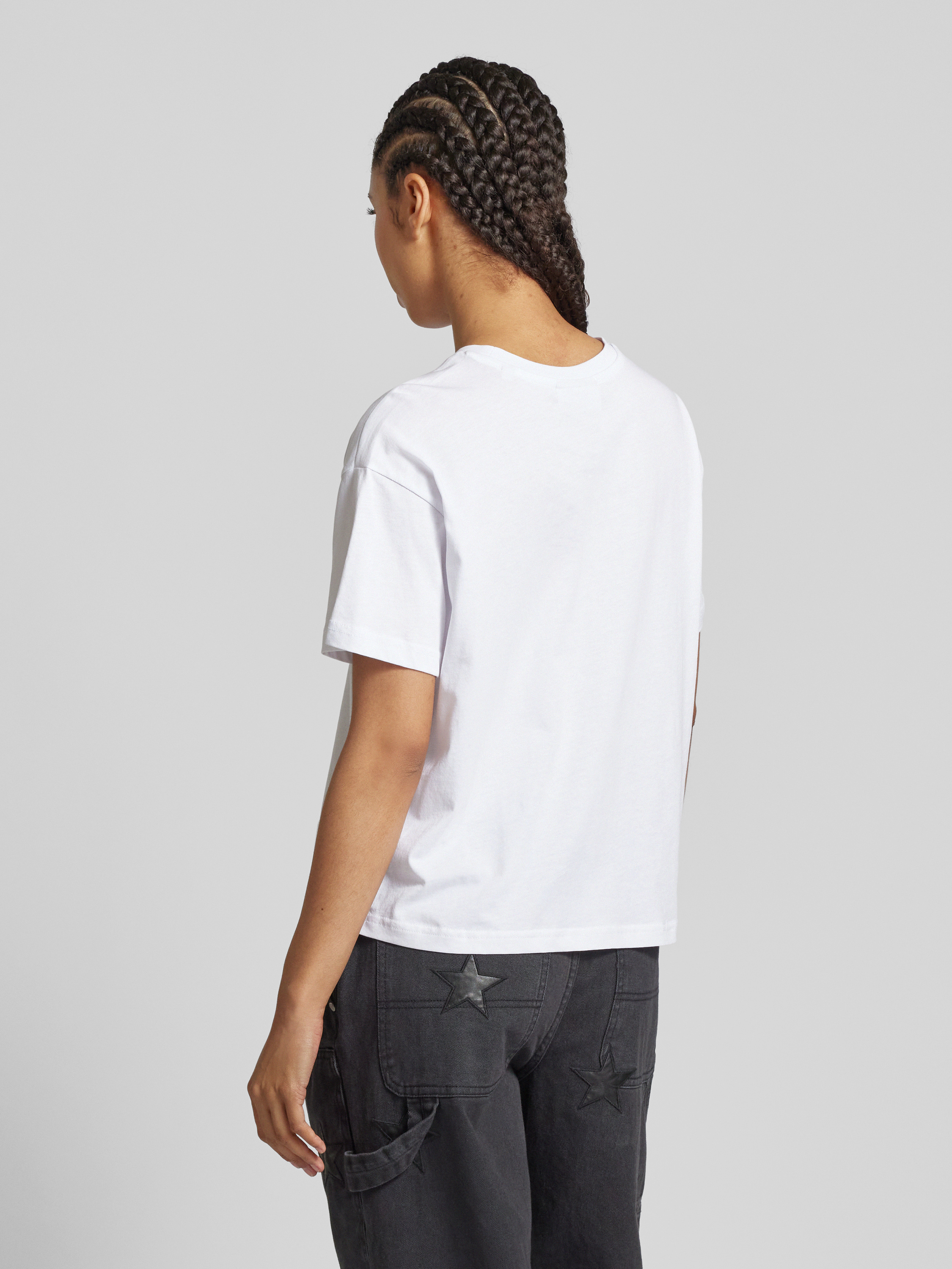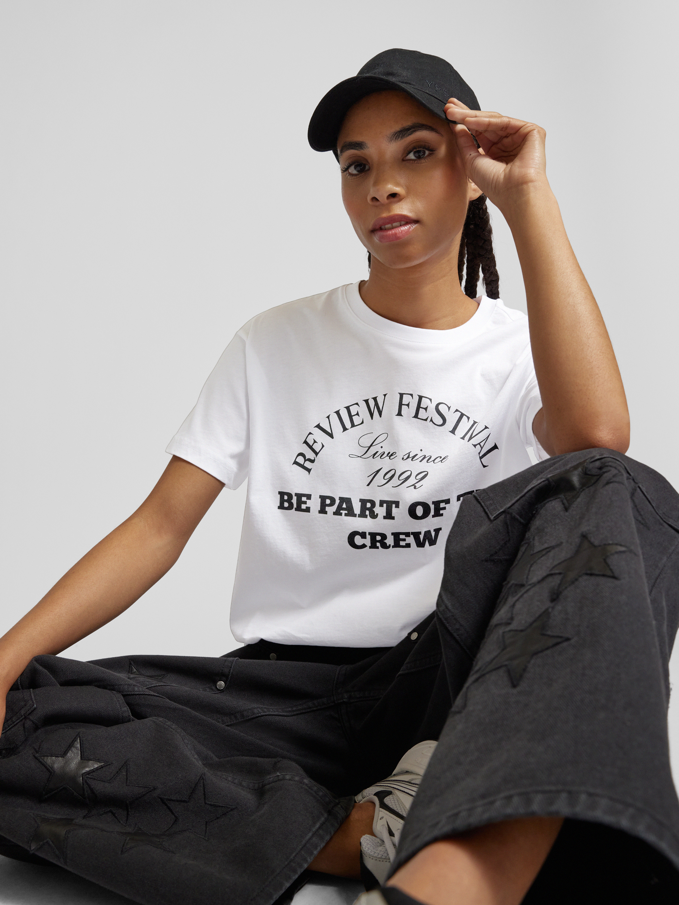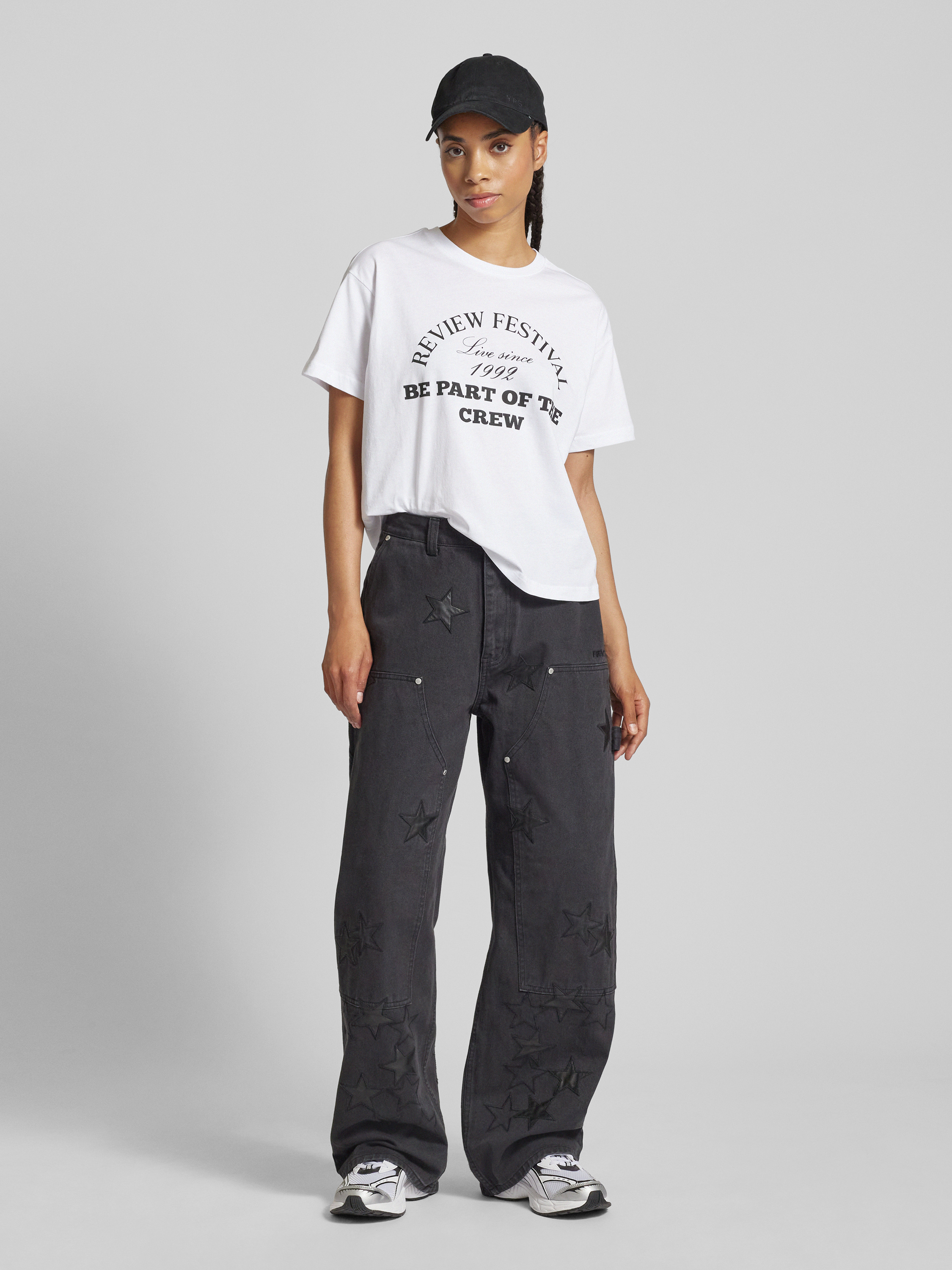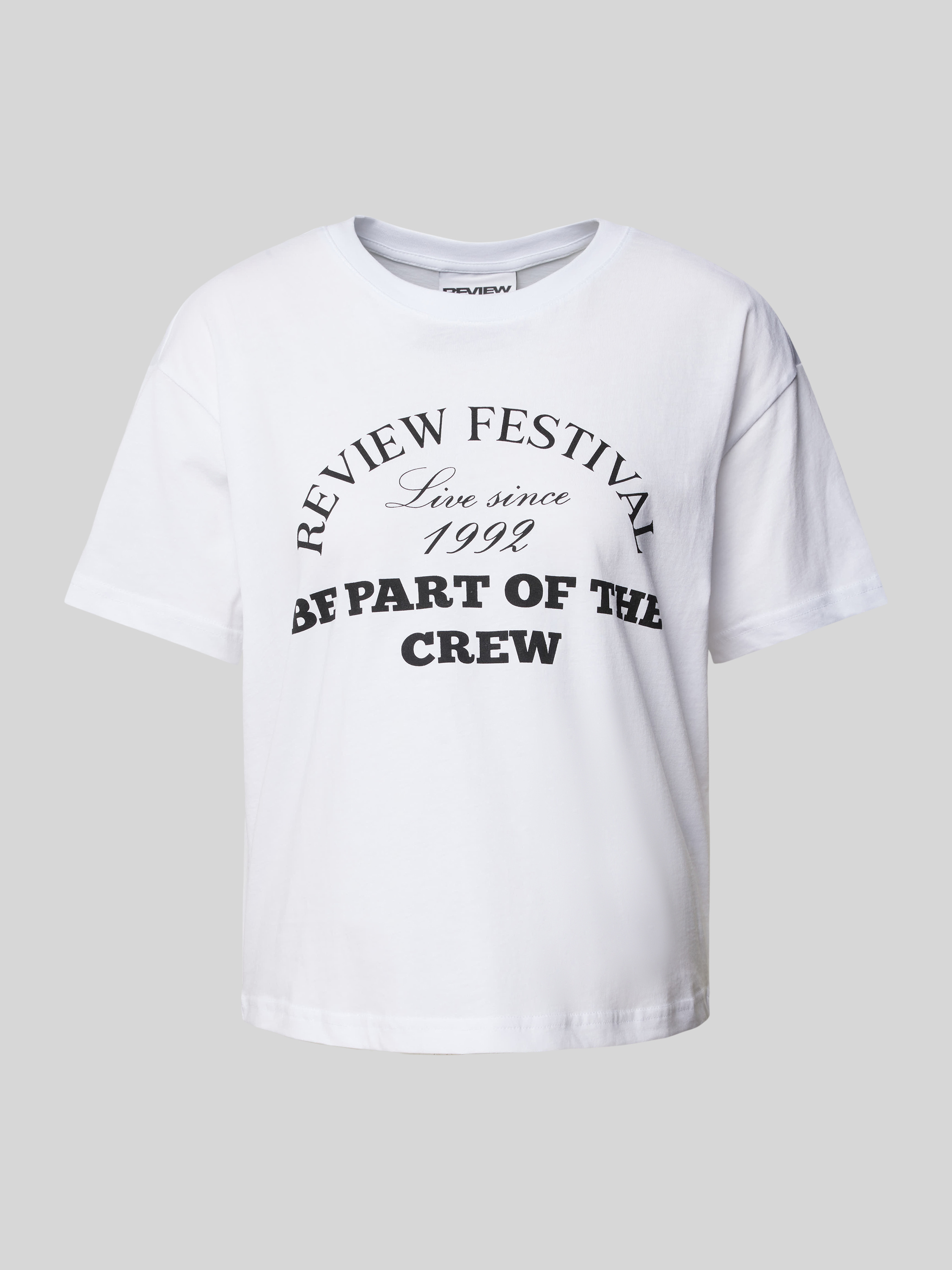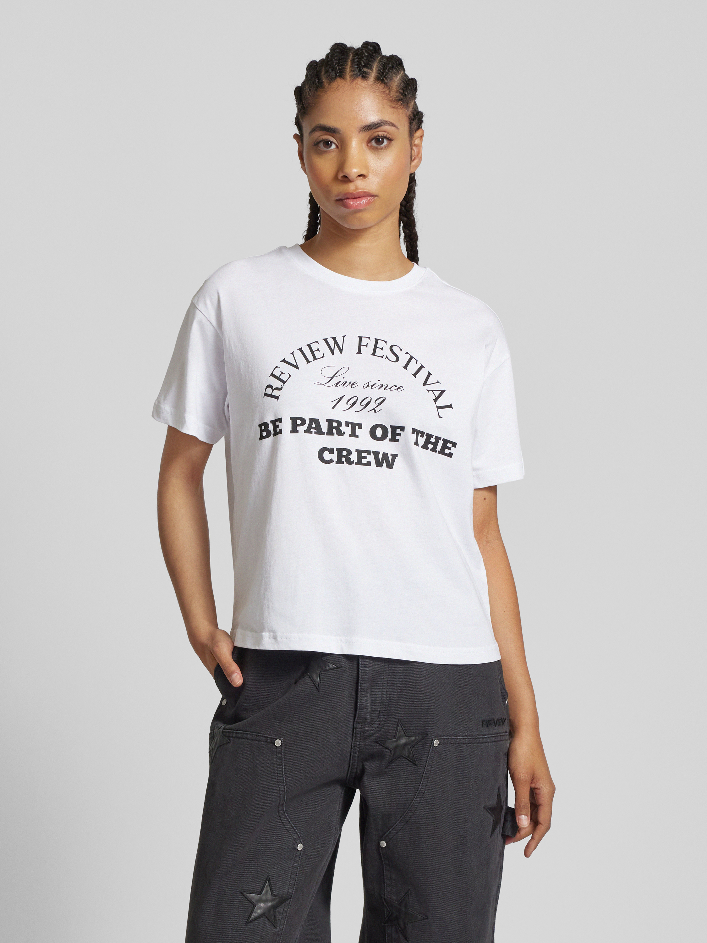 Das Damen T-Shirt von REVIEW Female präsentiert sich in einem zeitlosen Design, das durch seinen geraden Schnitt eine bequeme Passform ermöglicht. Aus reiner Baumwolle gefertigt, bietet es ein angenehmes Tragegefühl. Der auffällige Statement-Print verleiht dem unifarbenen Shirt eine besondere Note.