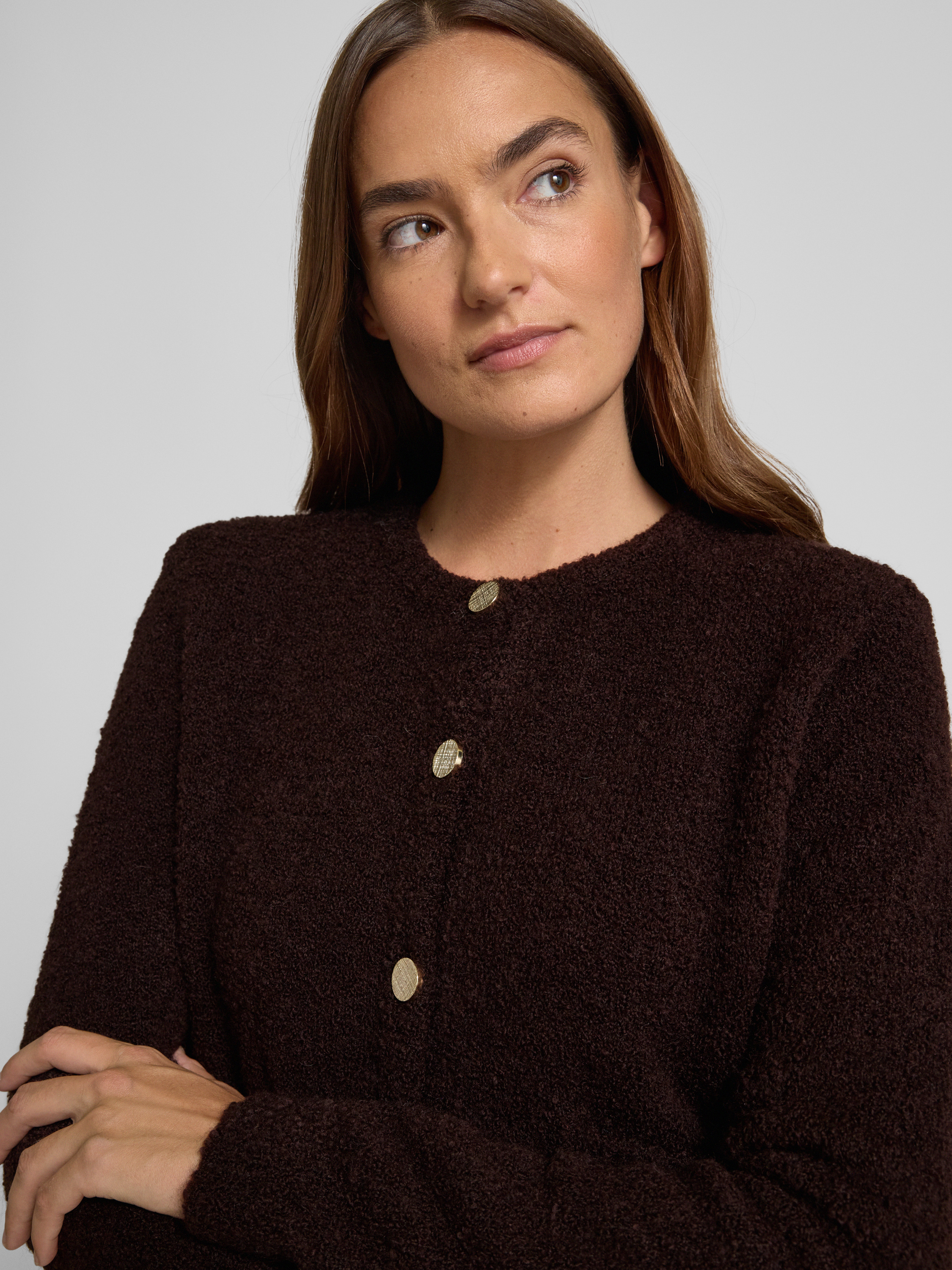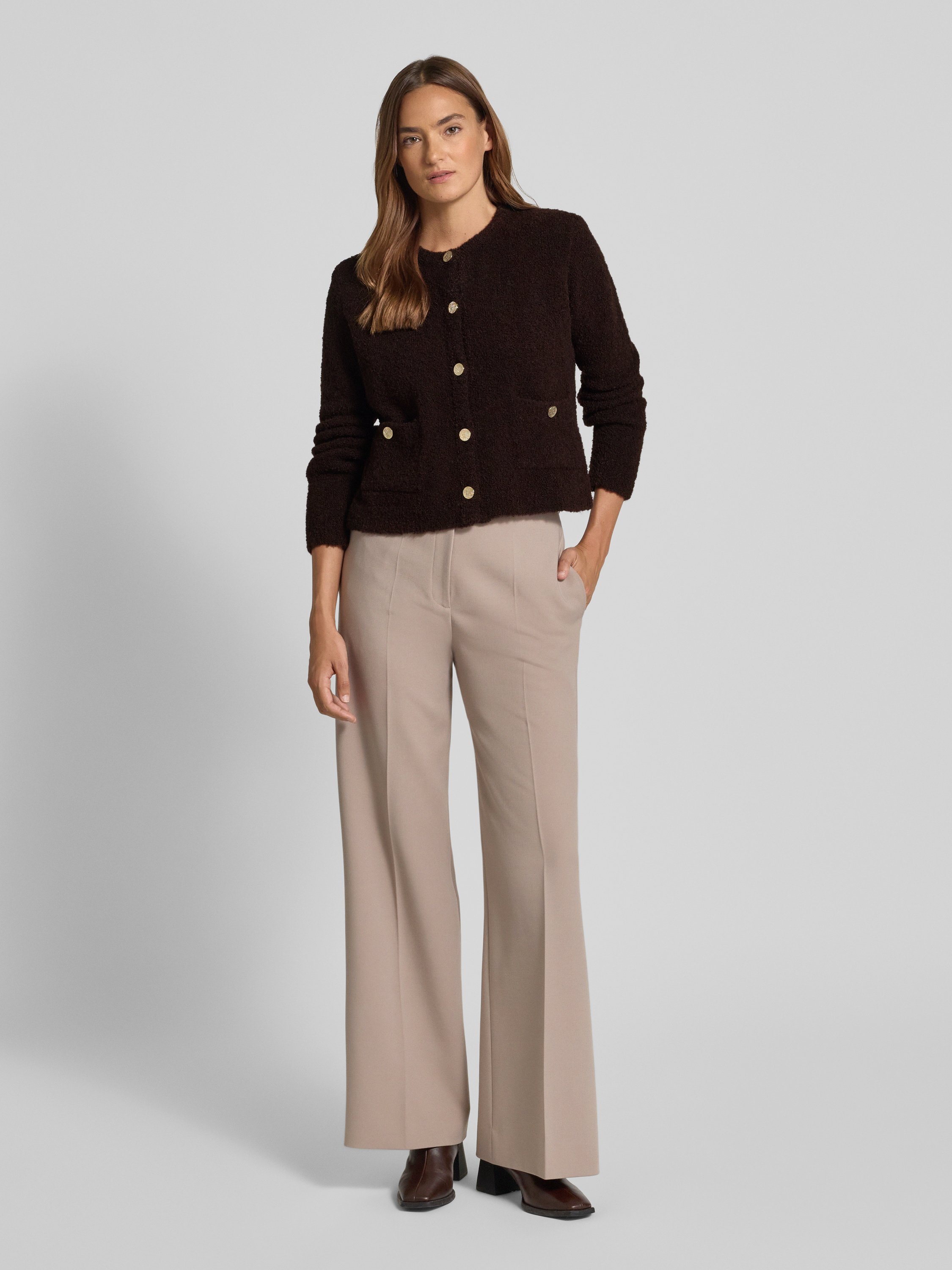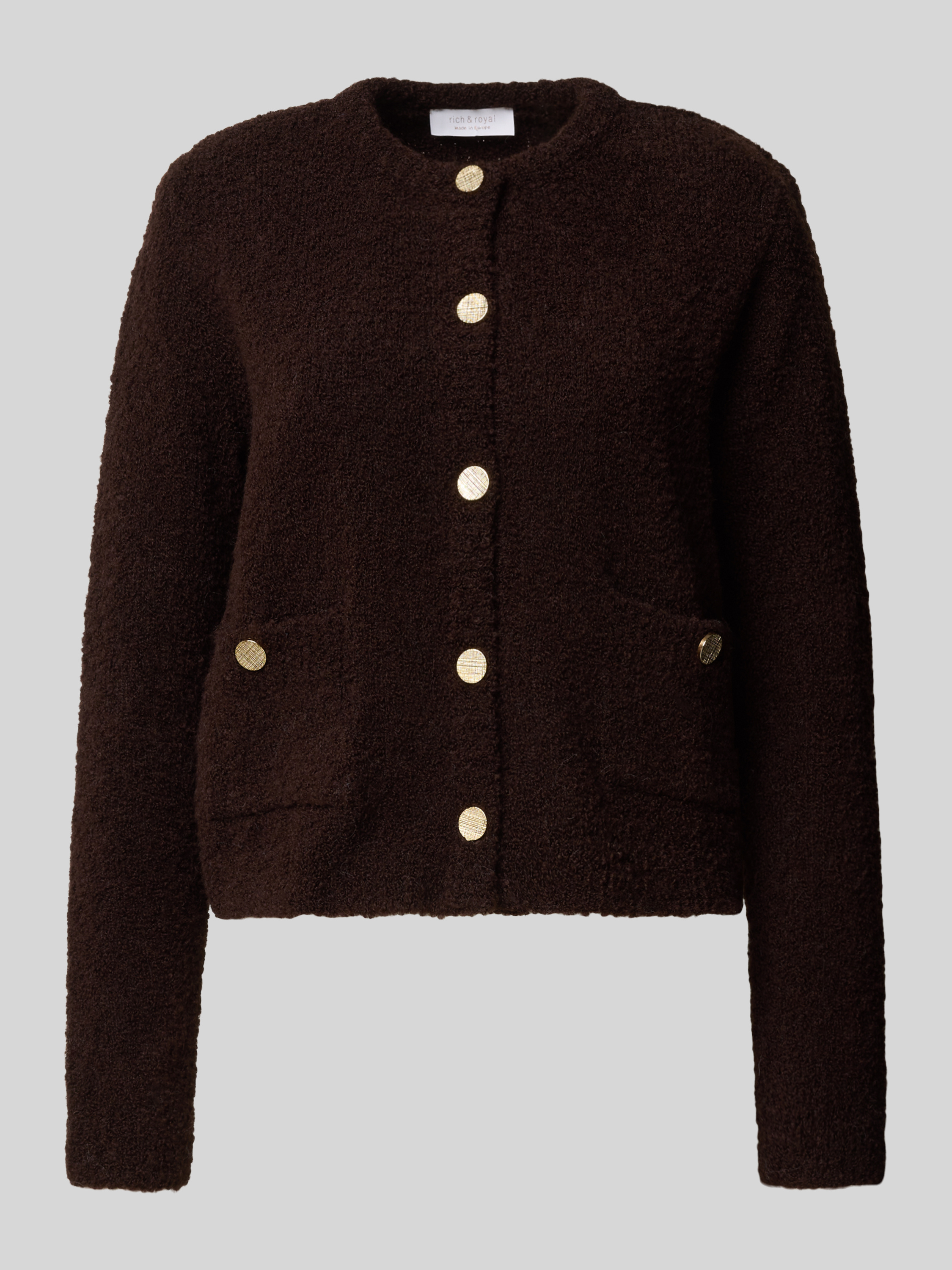 Die Damen Strickjacke von Rich & Royal zeichnet sich durch einen lockeren Schnitt und einen angenehmen Material-Mix mit Baumwoll-Anteil aus. Durch die gerippten Abschlüsse und den Rundhalsausschnitt entsteht ein komfortables Tragegefühl, das im Alltag vielseitig einsetzbar ist. Praktische Eingrifftaschen mit Knopfverschluss runden das Modell ab.