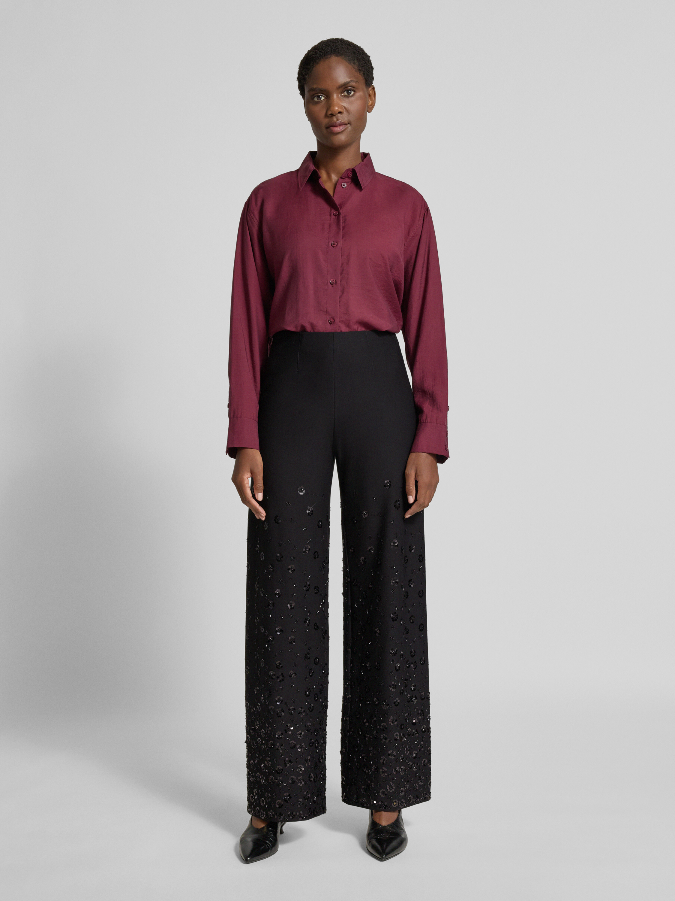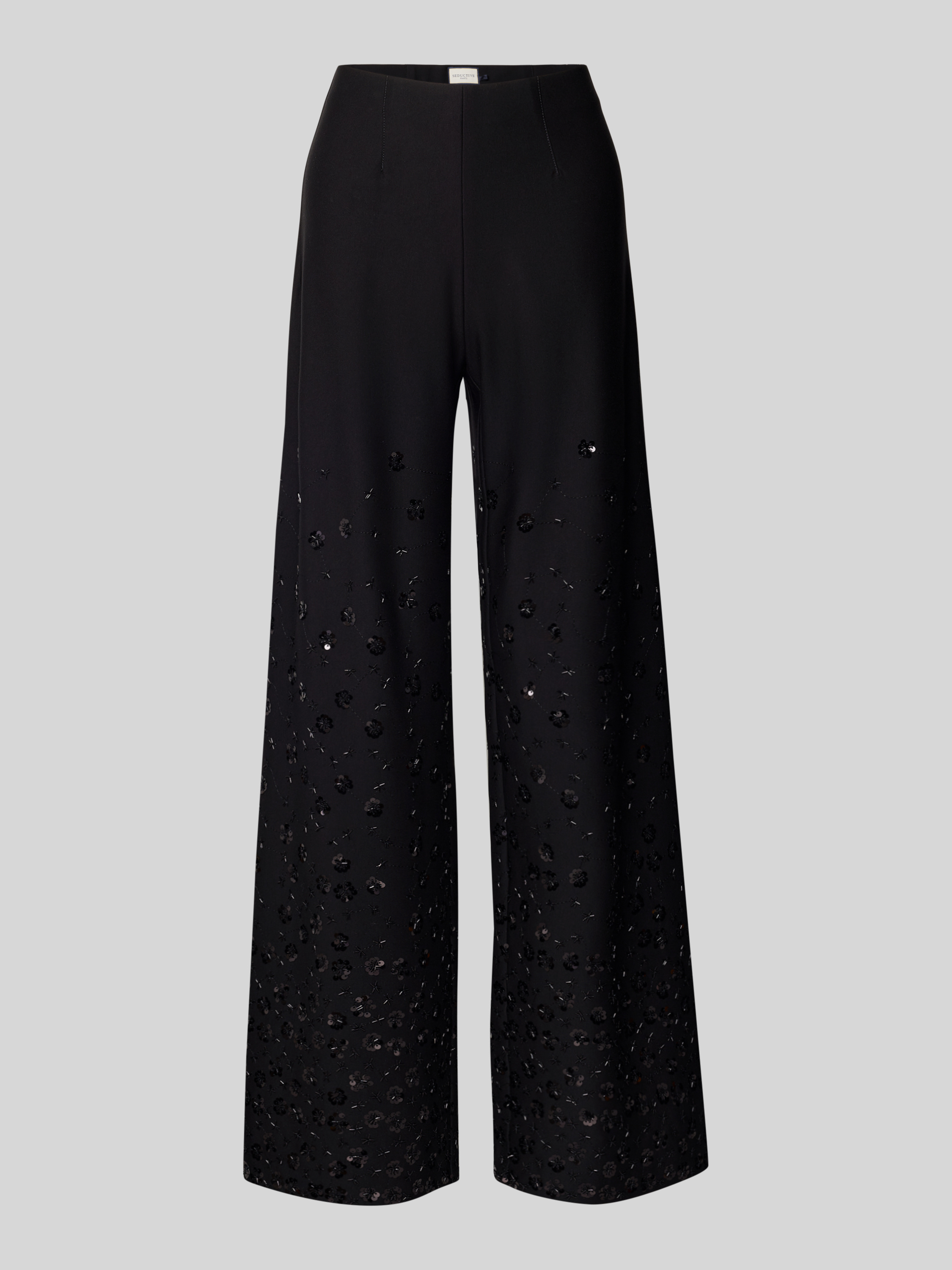 Die Wide Leg Hose KIMBERLY von SEDUCTIVE fällt durch ihren entspannten Schnitt locker und bequem, sodass sie sich vielseitig kombinieren lässt. Der leichte Viskose-Mix mit Stretch-Anteil sorgt für angenehmen Tragekomfort, während feine Pailletten dezente Akzente setzen. Ein elastischer Bund rundet das Design ab.