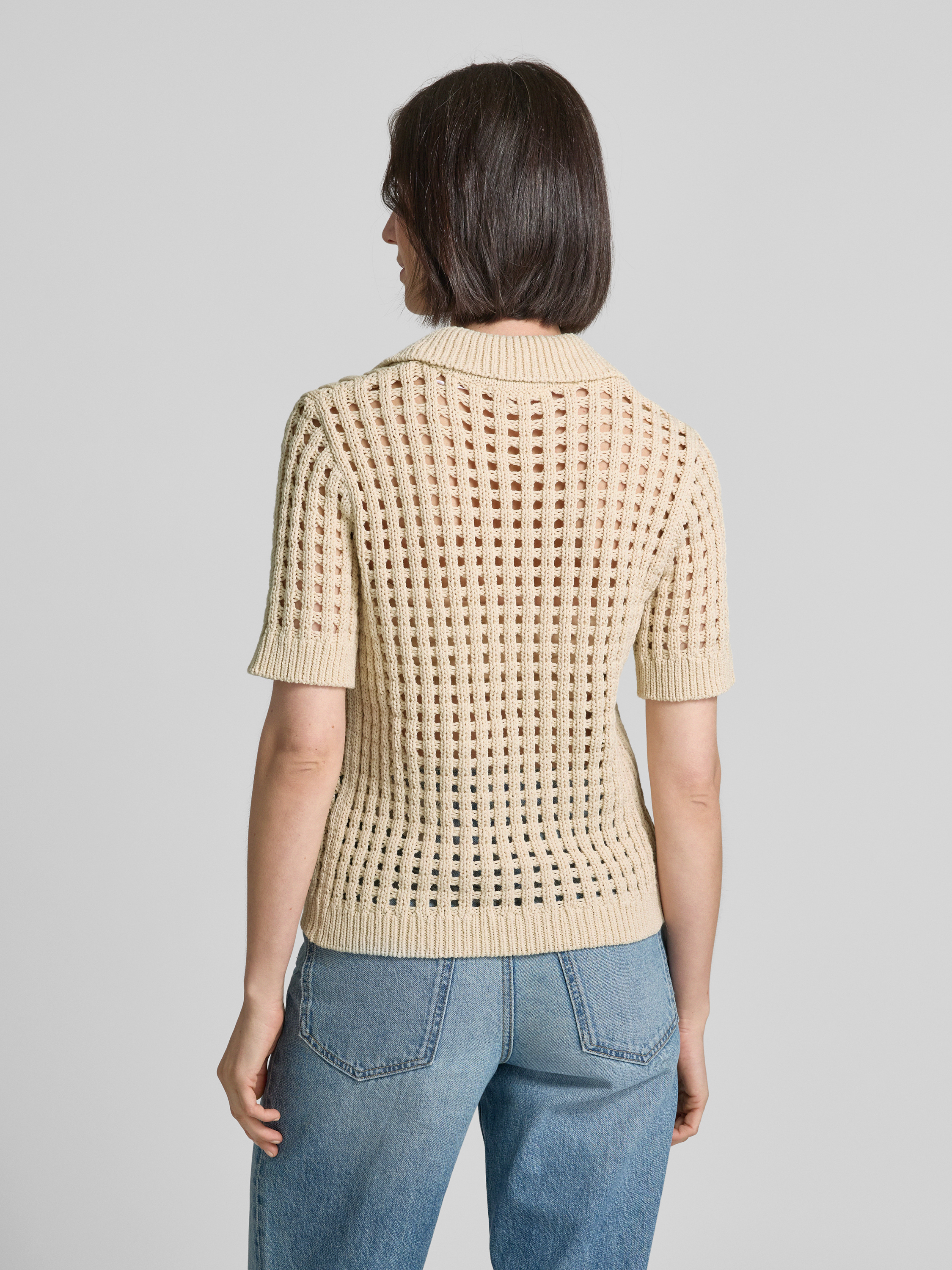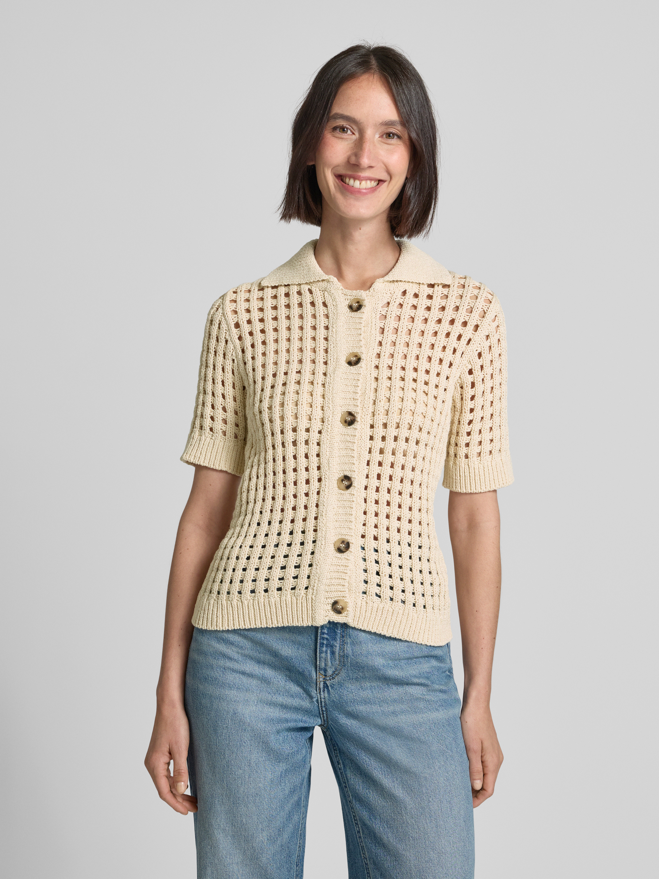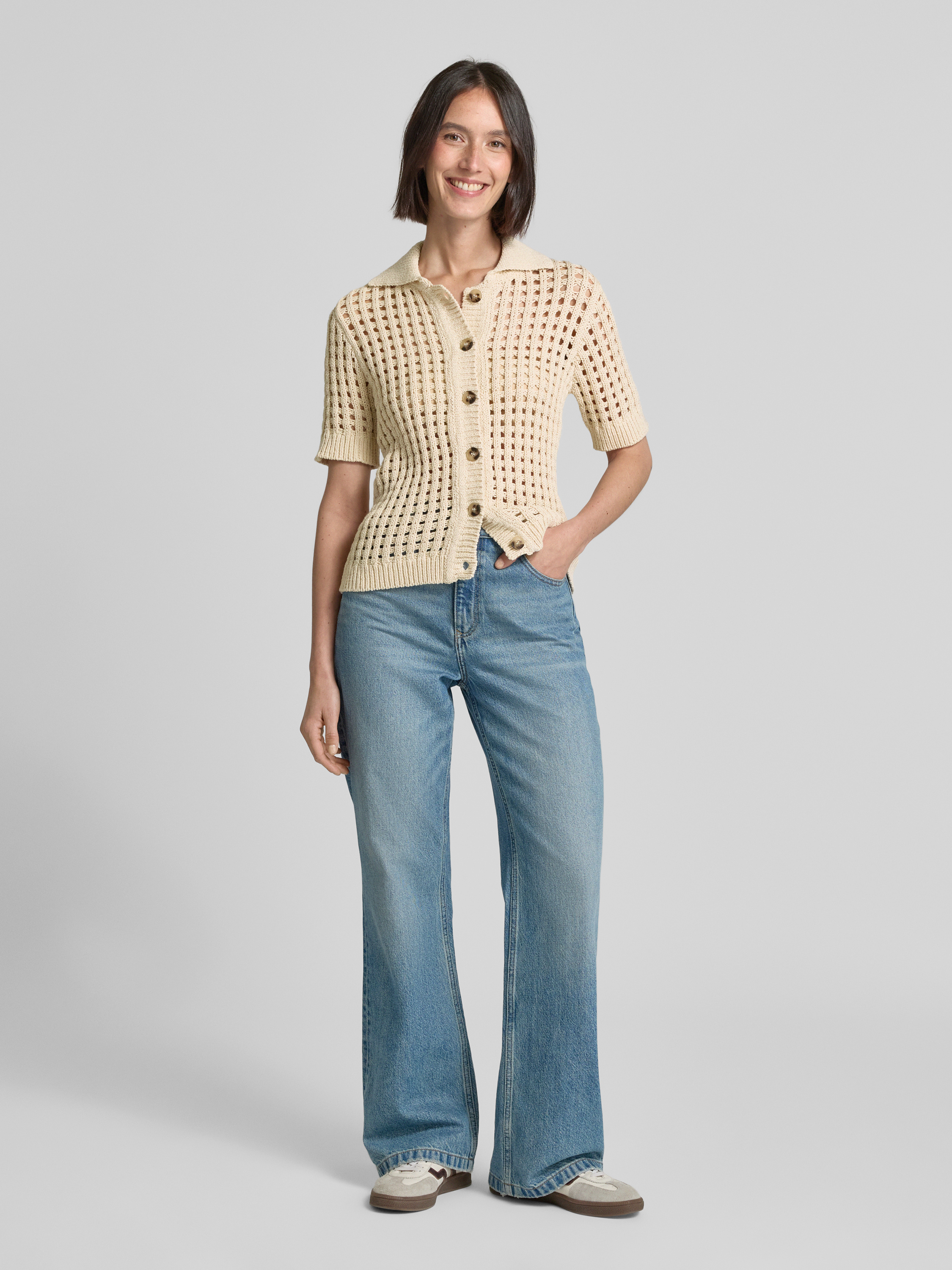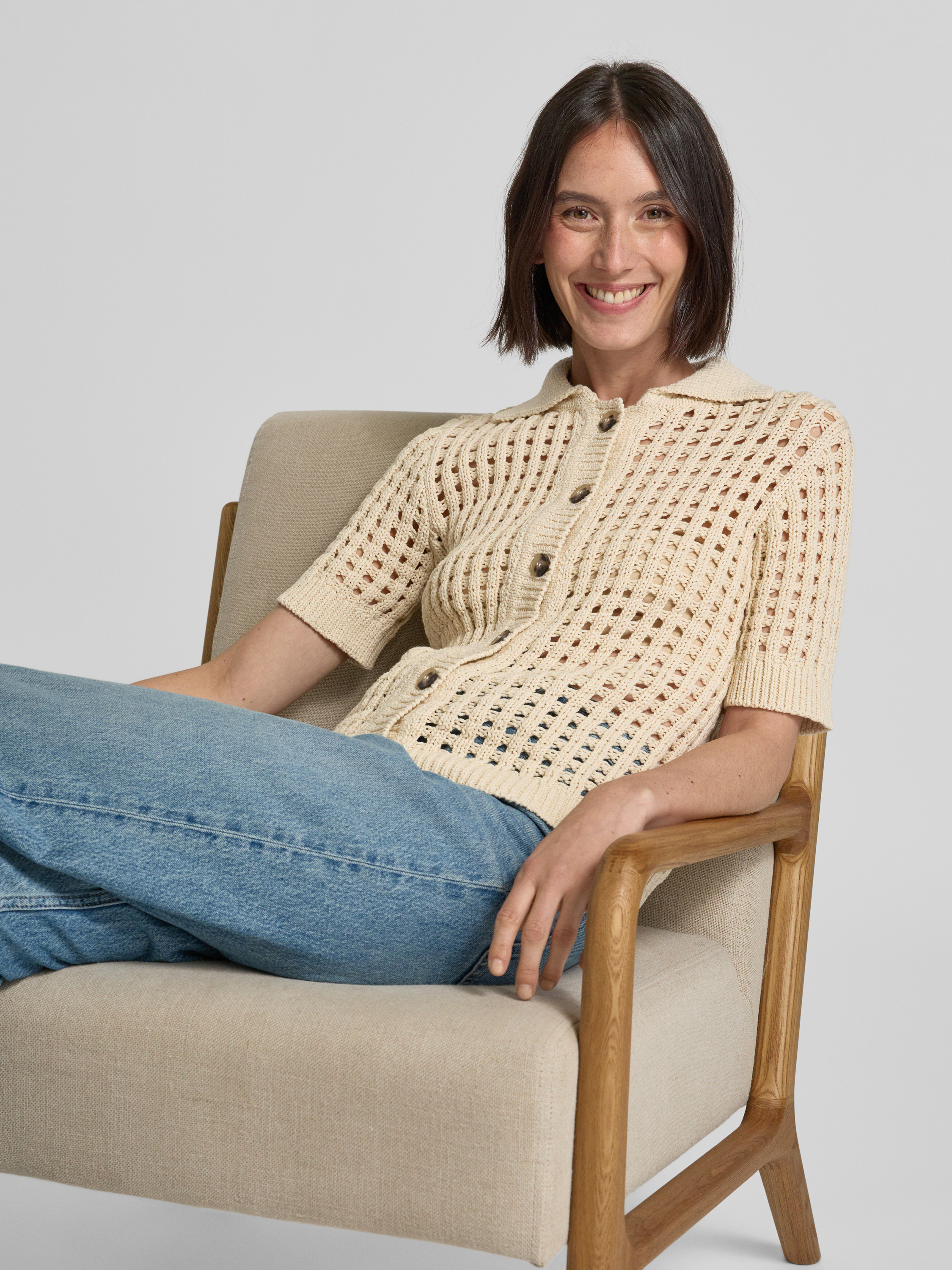 Der Cardigan Modell 'ELLEN' von Selected Femme vereint einen leichten Baumwoll-Mix mit einem sanft taillierten Schnitt, der eine feminine Silhouette unterstreicht. Der Umlegekragen und das dezente Lochmuster verleihen dem Kleidungsstück eine subtile Eleganz, während die halblangen Ärmel Bewegungsfreiheit ermöglichen. Gerippte Abschlüsse sorgen für einen harmonischen Abschluss und machen den Cardigan zu einem vielseitigen Begleiter für unterschiedliche Anlässe.