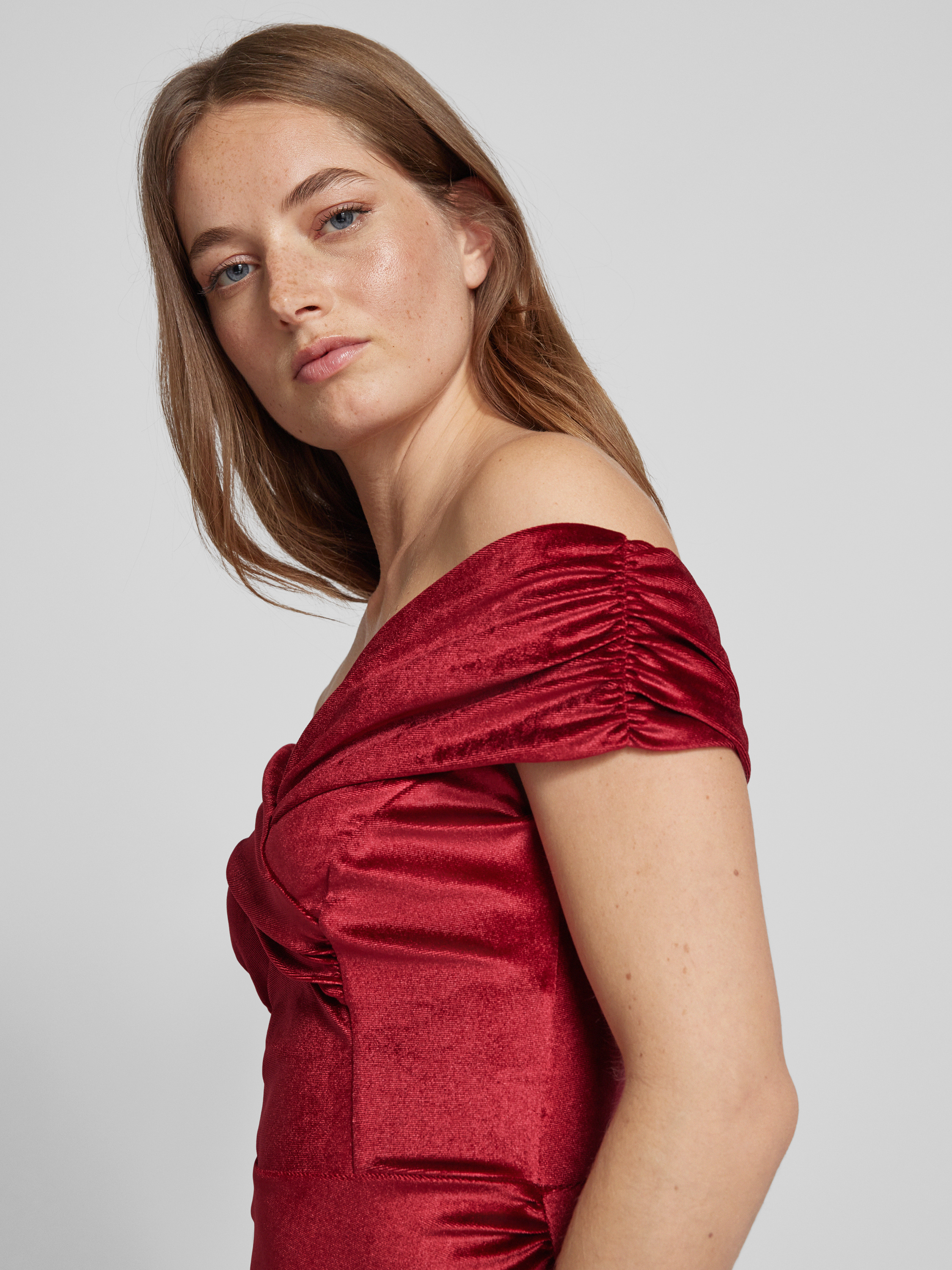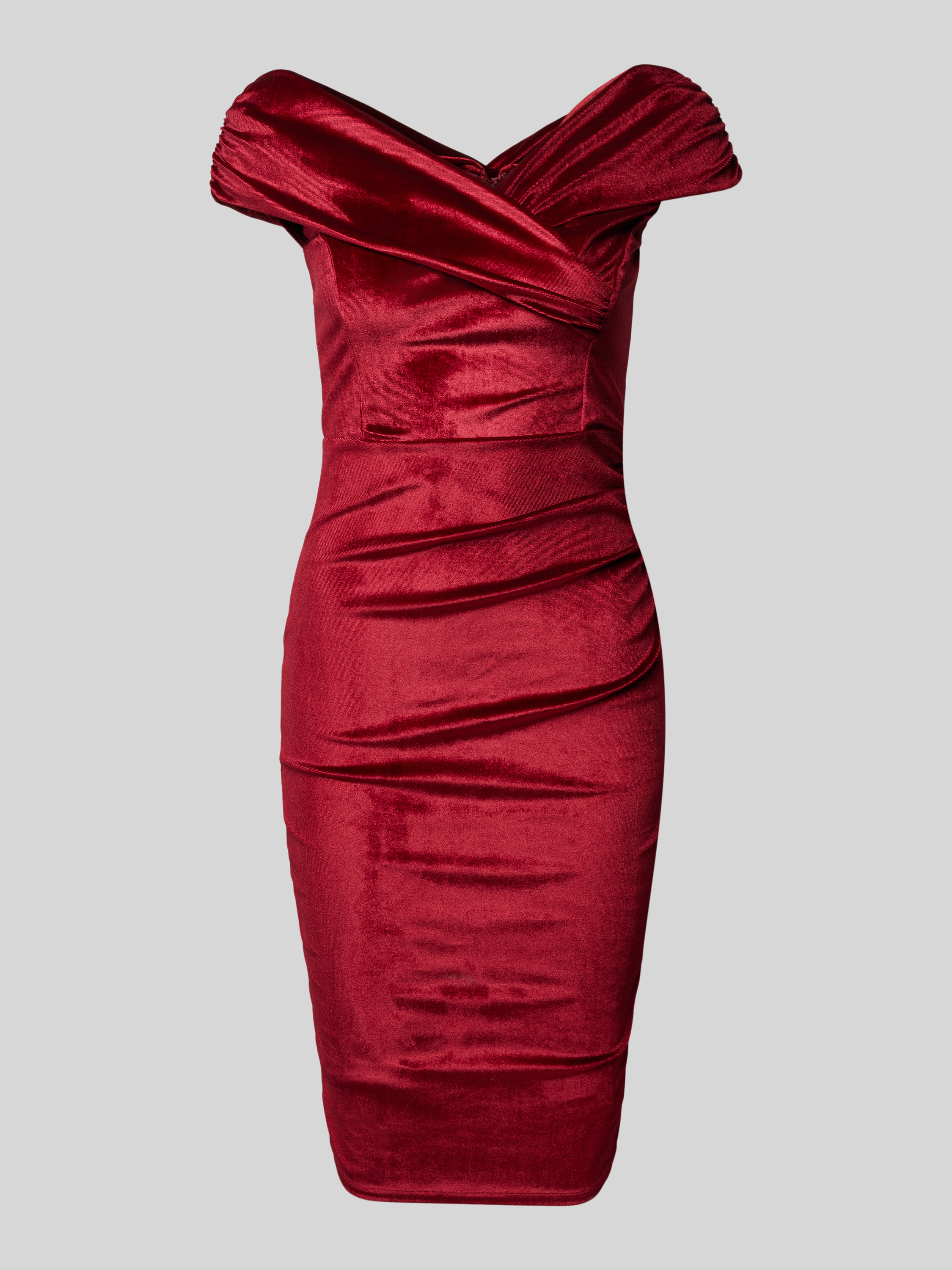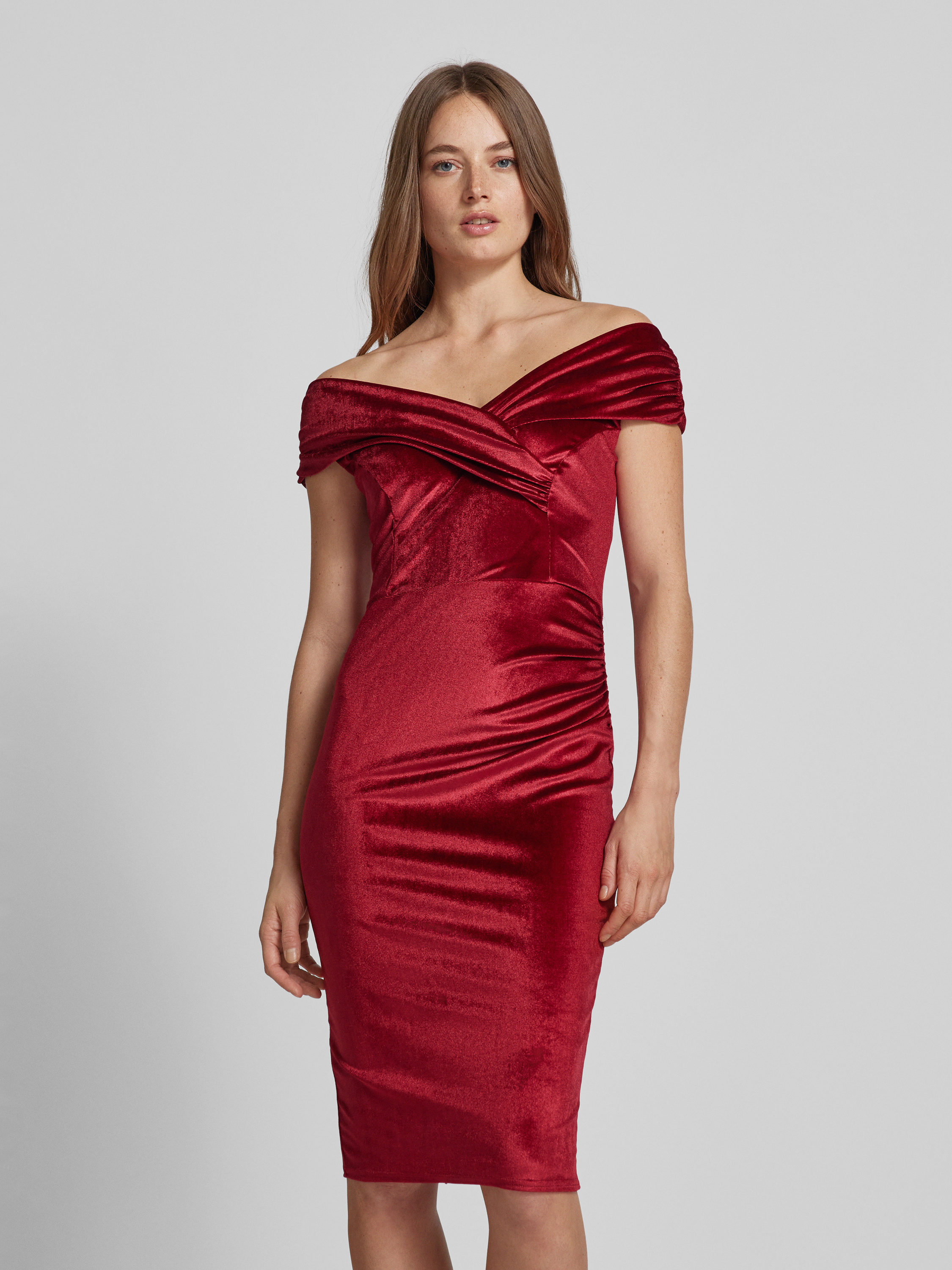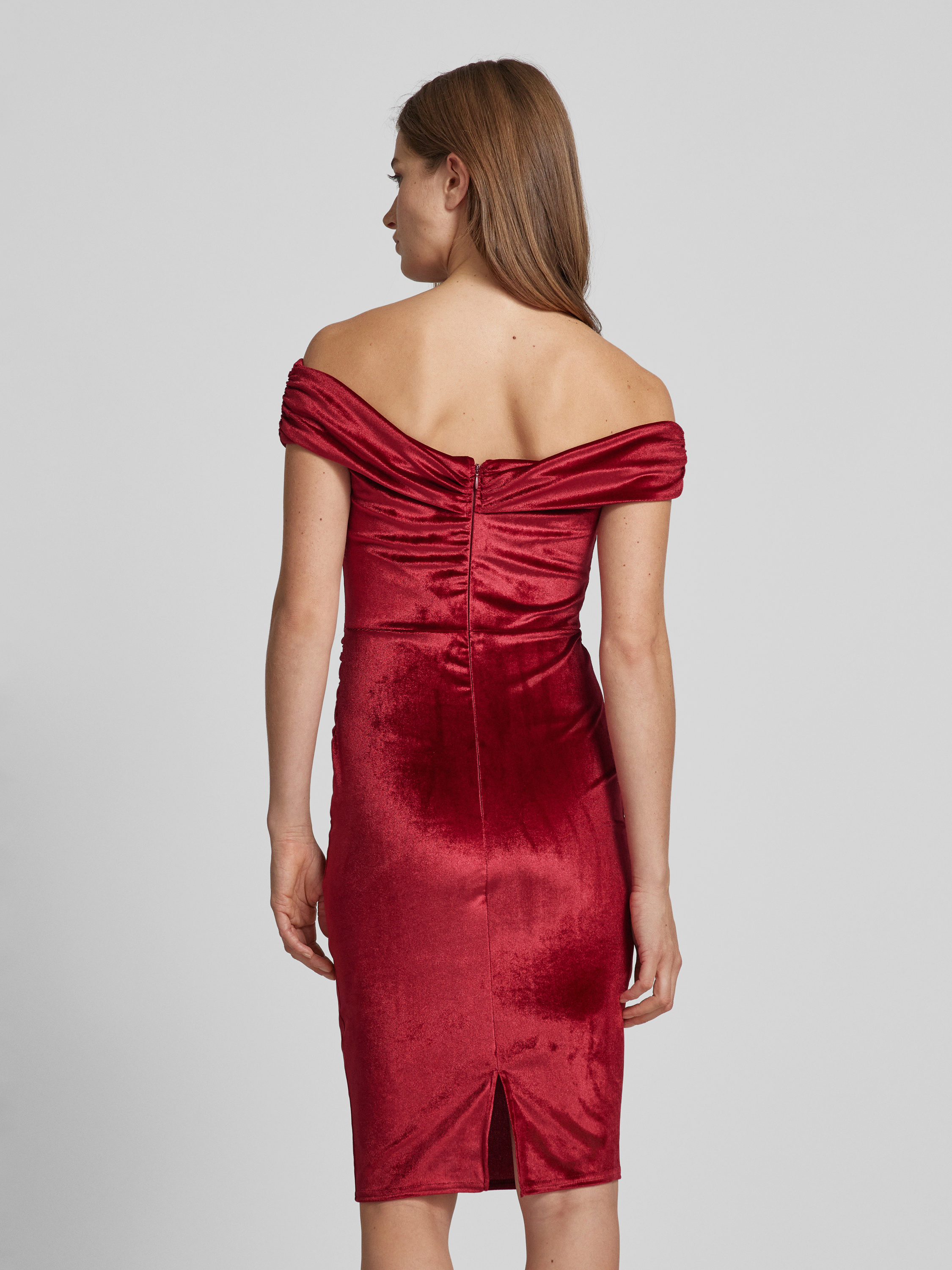 Das elegante Abendkleid von SISTAGLAM verbindet einen körpernahen Schnitt mit einem raffinierten V-Ausschnitt und zarten Raffungen, die die feminine Silhouette betonen. Der raffinierte Material-Mix mit Stretch-Anteil sorgt für angenehmen Tragekomfort, während die Knielänge eine klassische Eleganz verleiht. Ideal für festliche Anlässe.